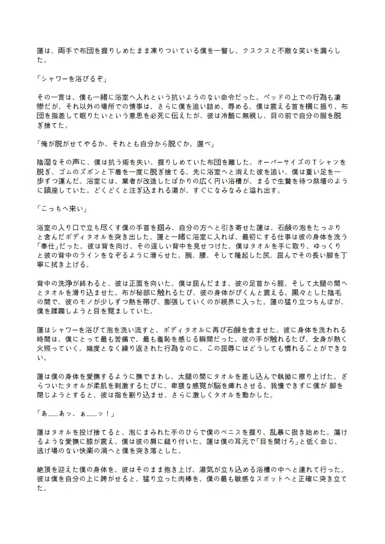 ただの借金返済だと思ったその場所は、出口のない愛の監獄で――という絶望的かつ背徳的なシチュエーション。言葉を話せない薄幸の美靑年・亜希が、絶対的な支配者・蓮によって、心も身体もドロドロに開発されちゃいます。 抵抗できないのをいいことに、ゴムなし中出しは当たり前。 逃亡を試みるも連れ戻され、待っていたのは更なる「わからせ」という名のハードな調教セックス。