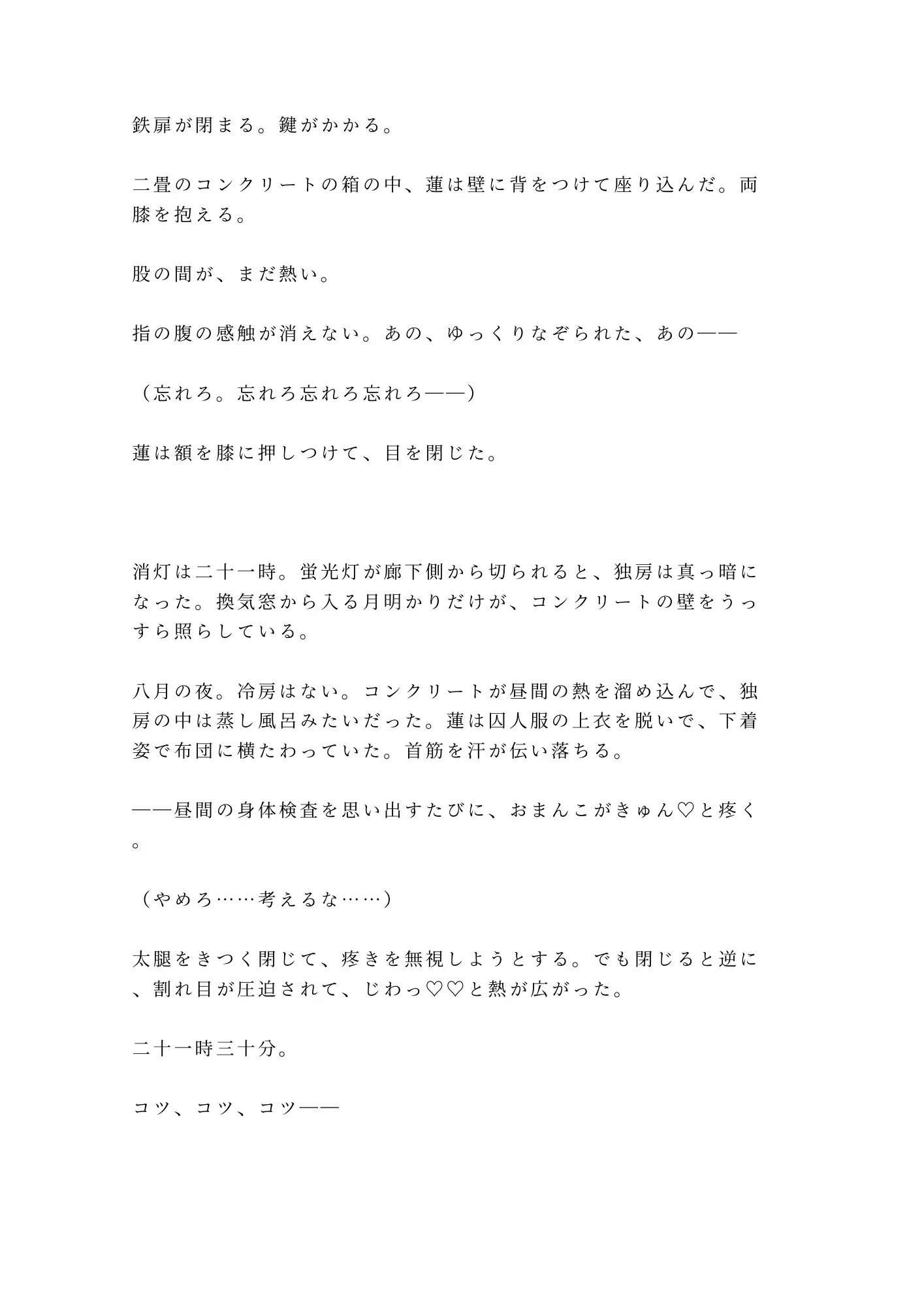 「身体検査」という名目で、毎晩独房に入ってくる鬼頭。逆らえば懲罰房。声を出せば隣房に聞こえる。逃げ場のない二畳のコンクリートの箱の中、蓮のカントは男の太い指に暴かれ、誰にも見せたことのない場所を晒されていく。