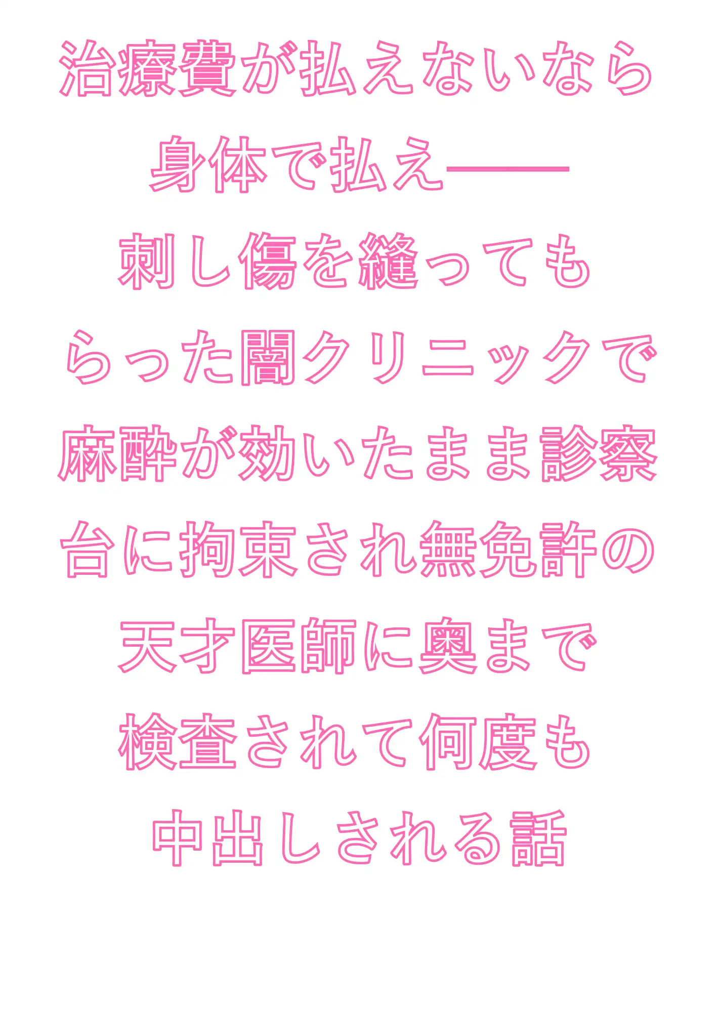 蛍光灯の白い光、消毒液の匂い、革ベルトの軋み、そして診察台の上で壊れていく理性——闇クリニックで繰り広げられる、逃げ場のない快楽漬けの一夜をお届けします。文字数はハート、濁点など込みで約11197字ほど。
