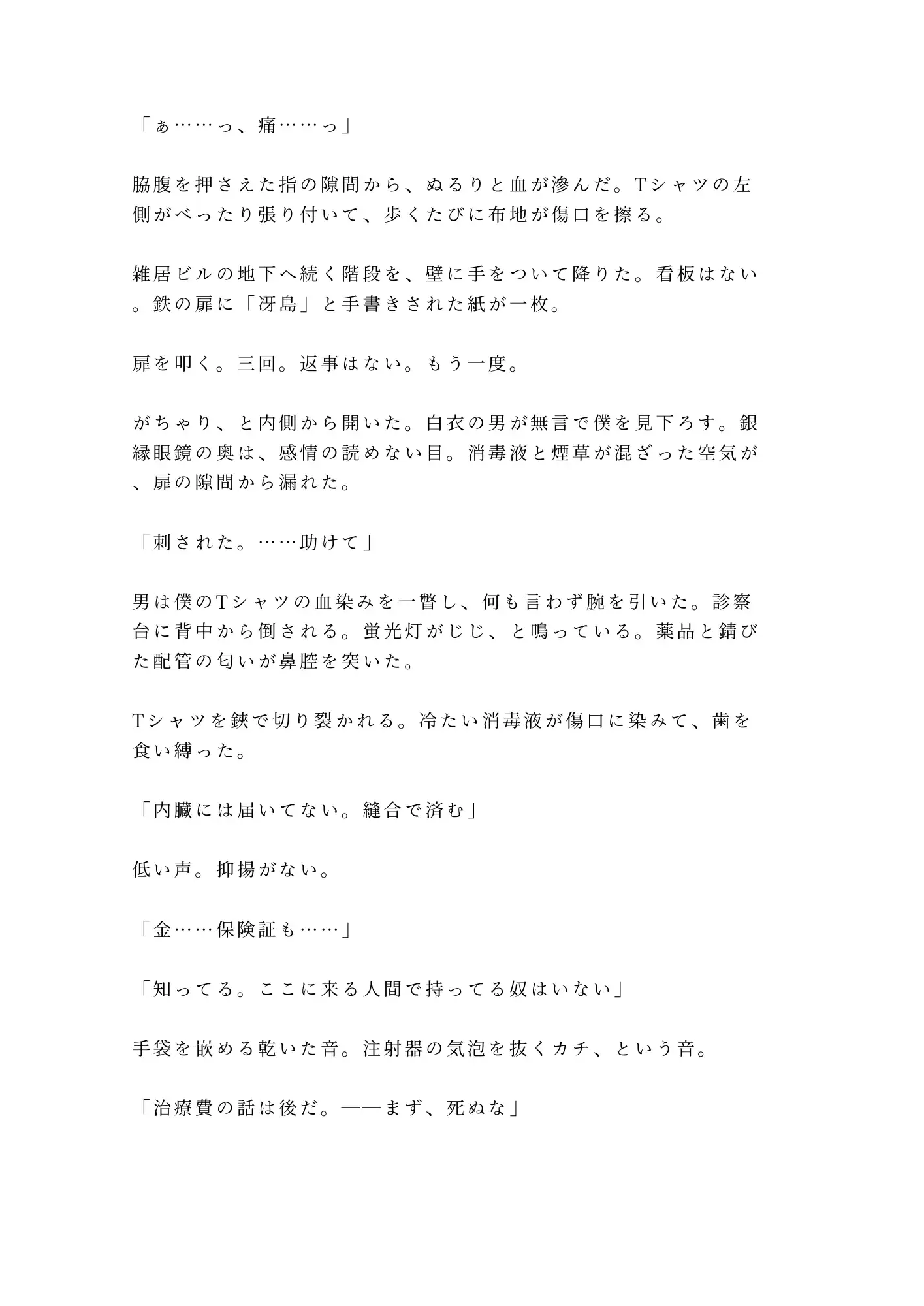 無免許の元外科医・冴島——感情を持たない天才の手は、刺し傷を縫う時も、患者の身体を暴く時も、一切の迷いがない。刺されて逃げ込んだ先は、そんな男の診察台だった。