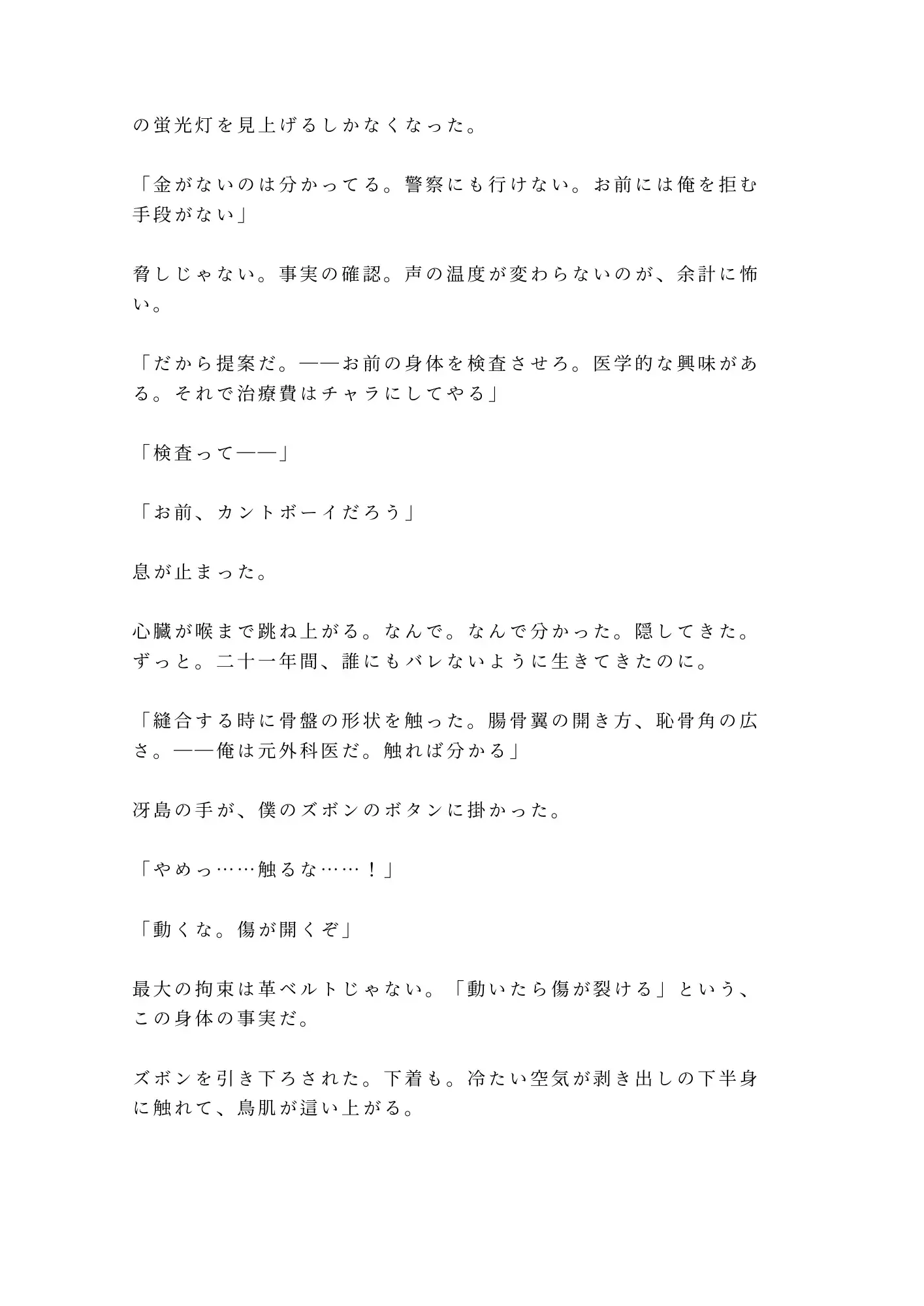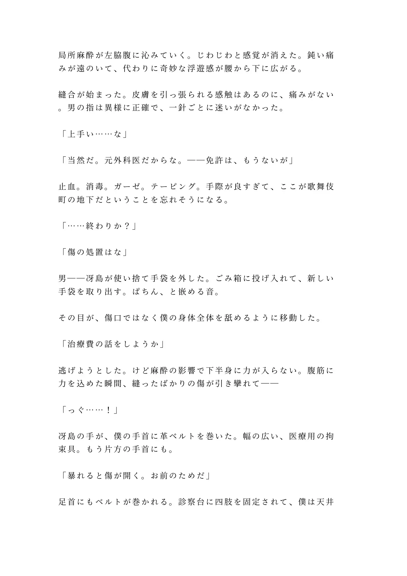 「治療費の話をしようか」——冴島が提示した代償は、身体の「検査」。局所麻酔で下半身の自由を奪われたまま、革ベルトで四肢を拘束される。痛みだけが消えて、快感の神経はすべて生きている。逃げようとすれば縫合した傷が裂ける——「動けない」のではなく「動いてはいけない」。その絶対的な支配構造の中で、二十一年間隠し通してきた秘密が、ペンライトの光の下に暴かれていく。