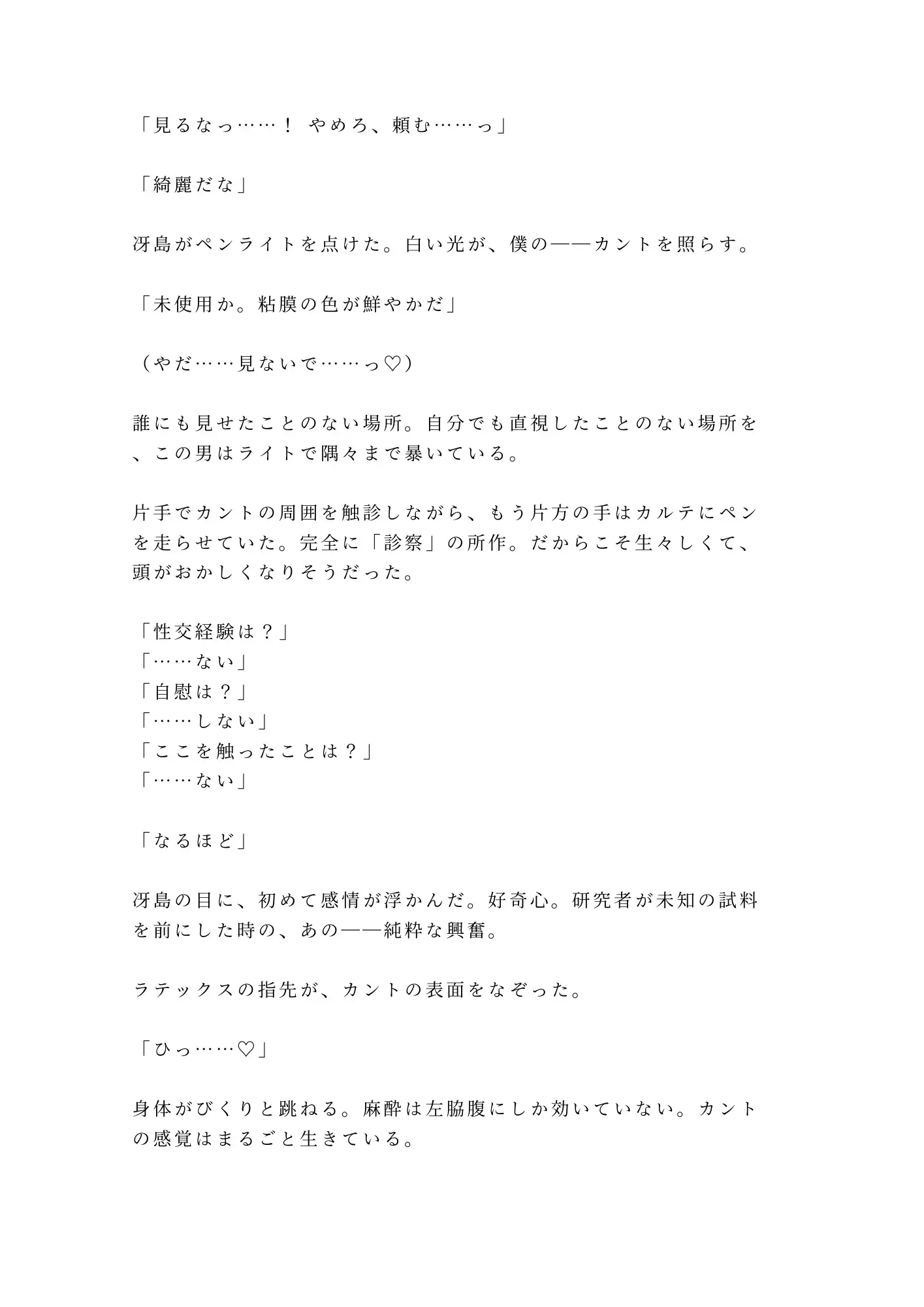 冴島の指は医学的に正確で、だからこそ残酷なほど的確に快楽を引き出す。診察の所作で身体の奥を探り、カルテに記録を取りながら、淡々と絶頂へ追い詰めていく。犯されているのに「検査」と呼ばれる倒錯。抵抗できない身体が裏切るように感じてしまう屈辱。「合理的な判断をしろ」——感情のない声がそう囁く。