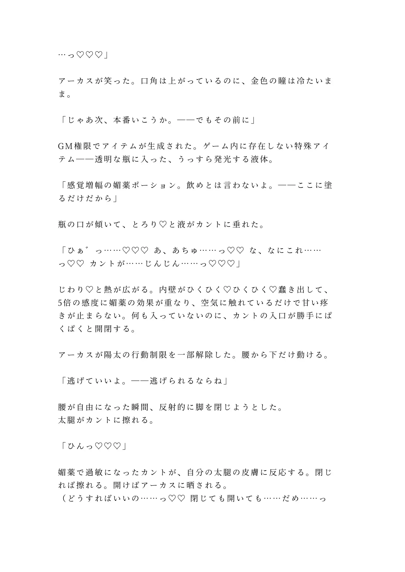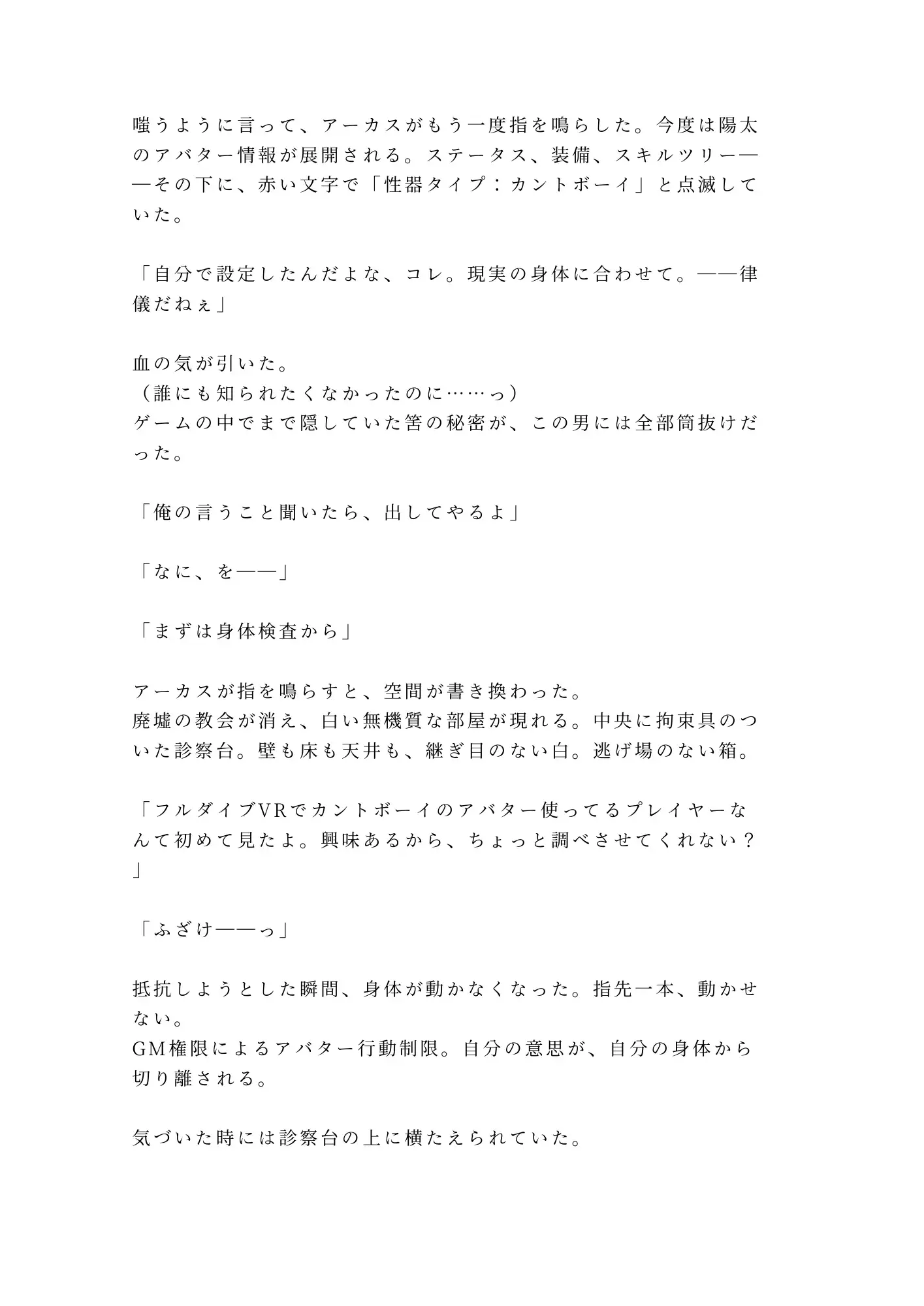 普通のVRゲームだと思っていた。ログアウトできなくなるまでは。深夜のレイド全滅、リスポーン地点に戻された瞬間、メニューが死んだ。ログアウトボタンはグレーアウト、GMコールも応答なし。絶望する陽太の前に現れたのは、GM権限を持つ謎の男・アーカス。金色の瞳で全てを見透かすこの男は、陽太が誰にも明かしていない秘密――カントボーイであることを最初から知っていた。