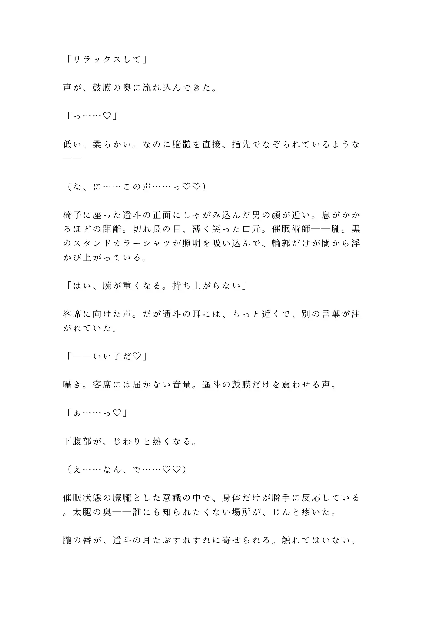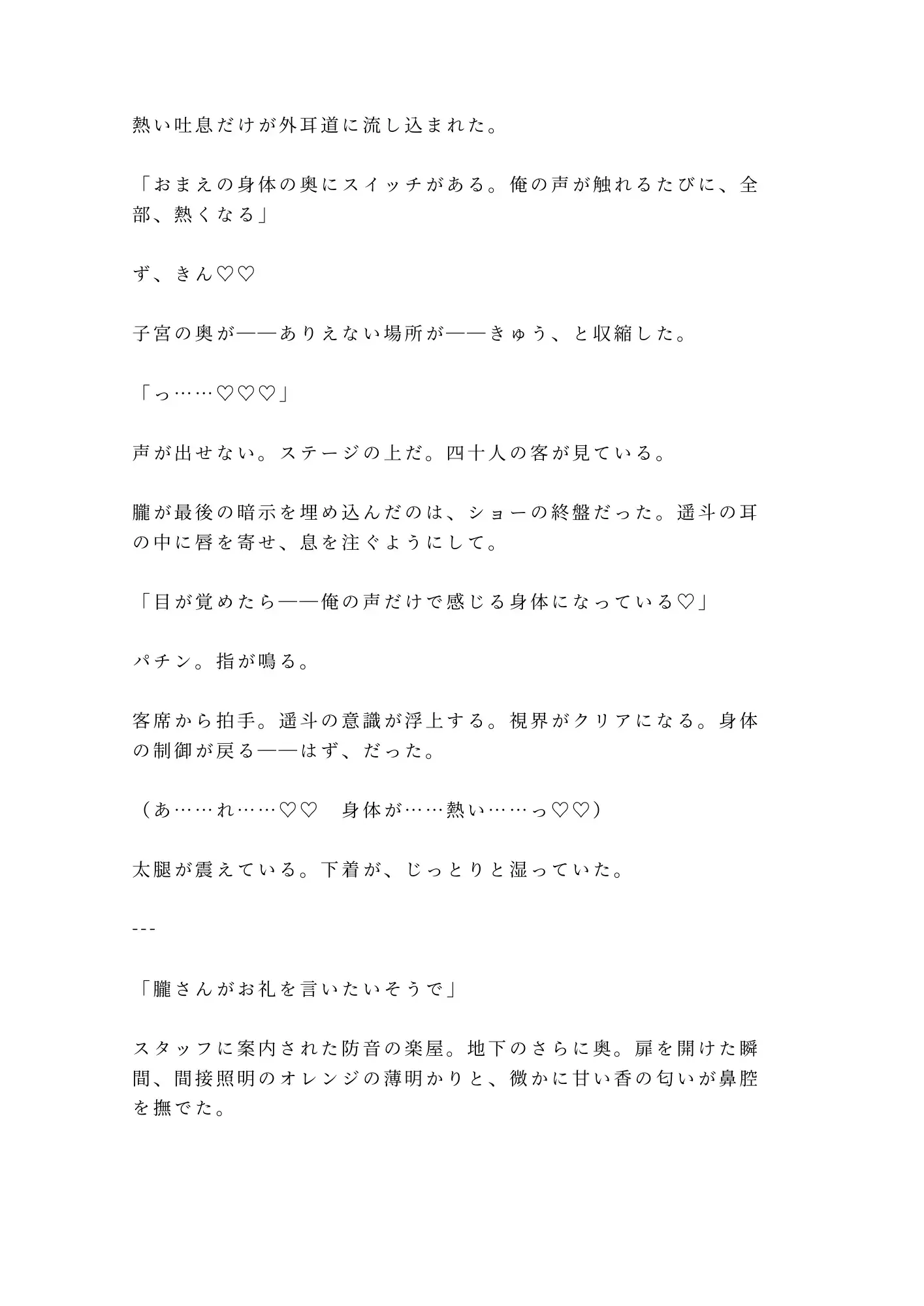 ショーパブのステージで催○術師・朧に選ばれた瞬間から、サラリーマン・遥斗の人生は壊れ始めた。「目が覚めたら——俺の声だけで感じる身体になっている」