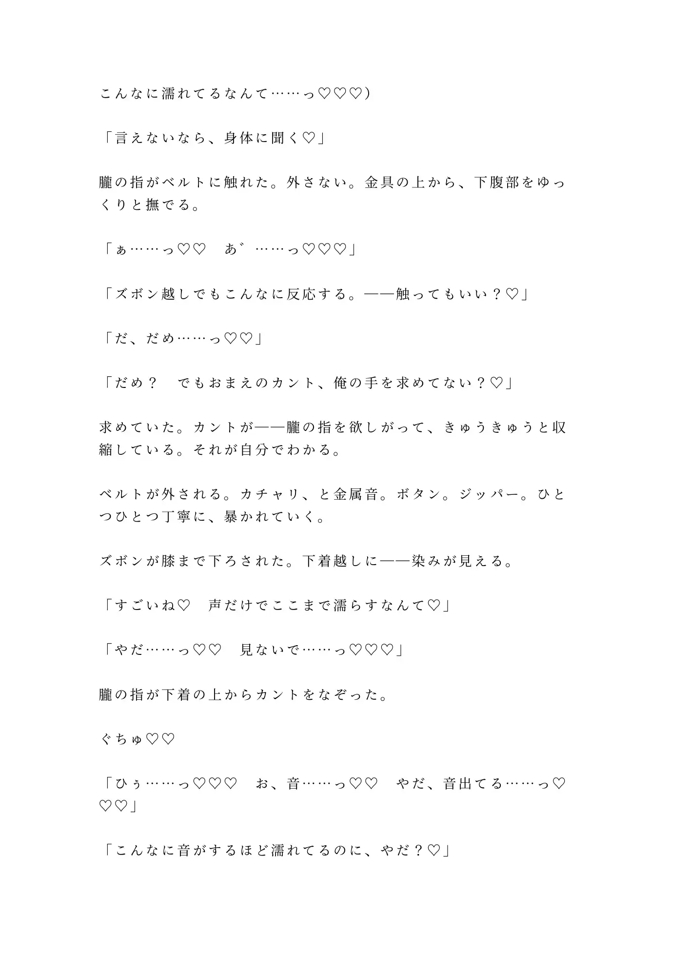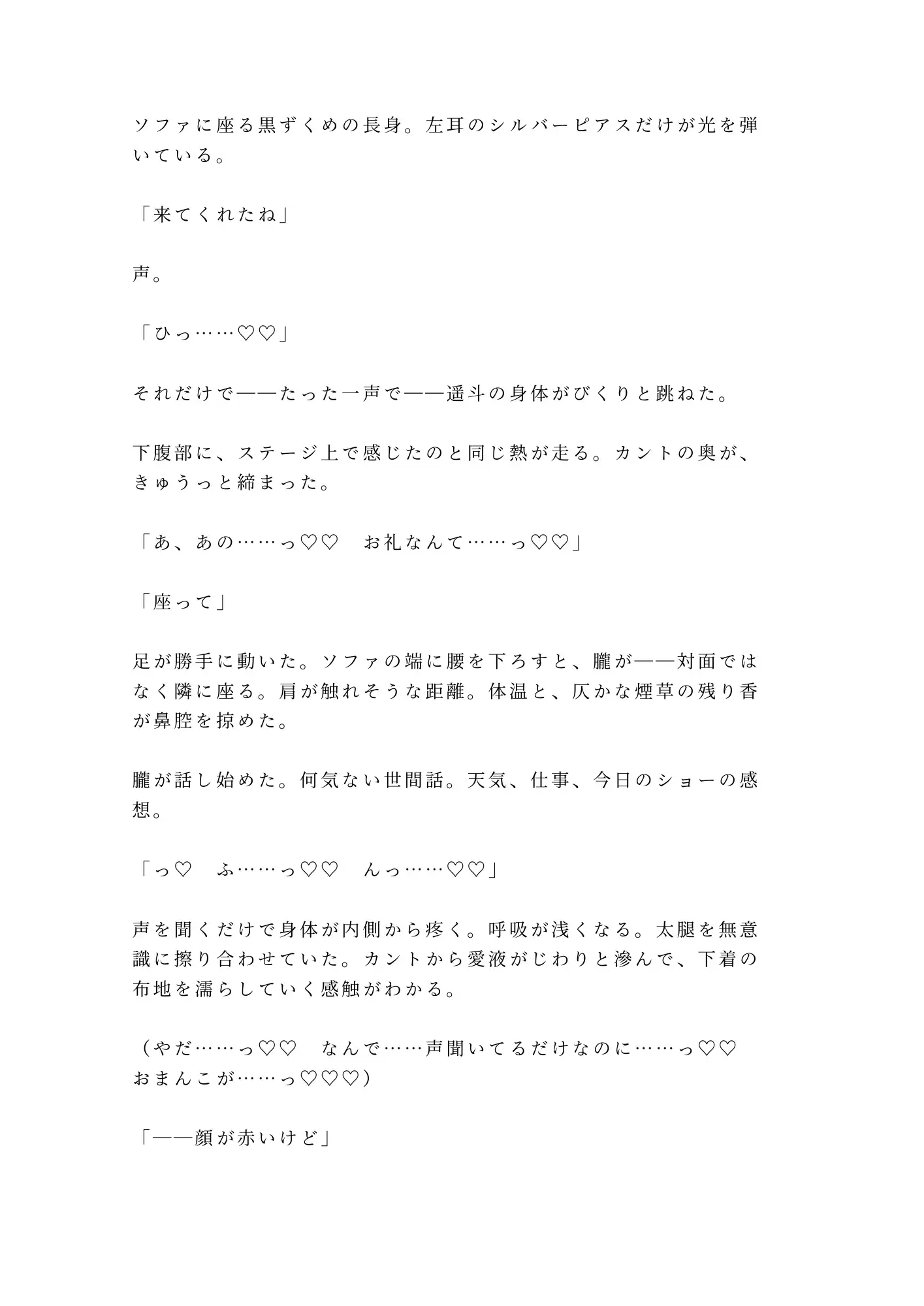 楽屋に誘い出された遥斗を待っていたのは、間接照明に浮かぶ捕食者の微笑。触れない。指一本触れずに、声だけでカントを濡らし、クリトリスを震わせ、絶頂まで追い詰める。二十六年間誰にも触らせなかった処女のカントが、言葉ひとつで蜜を噴いて痙攣する。人生初の絶頂が——声だけで。