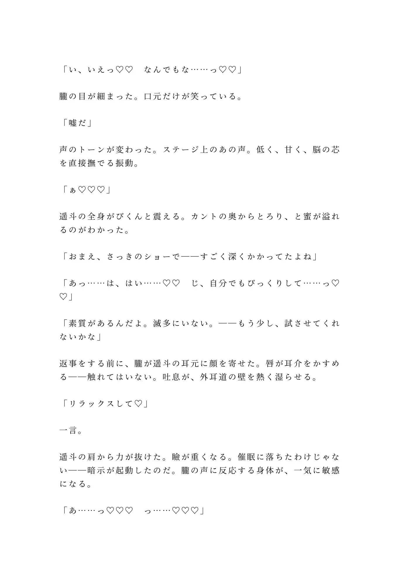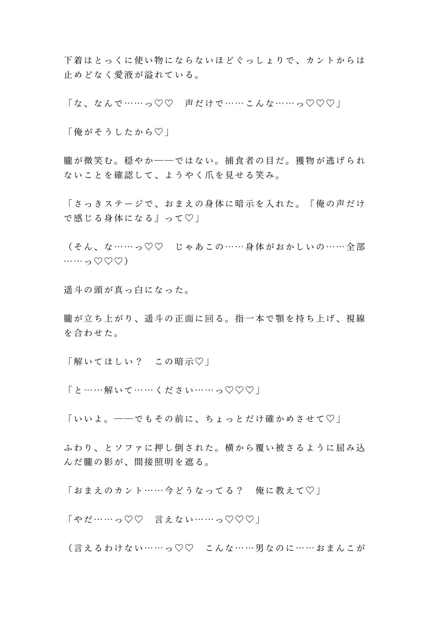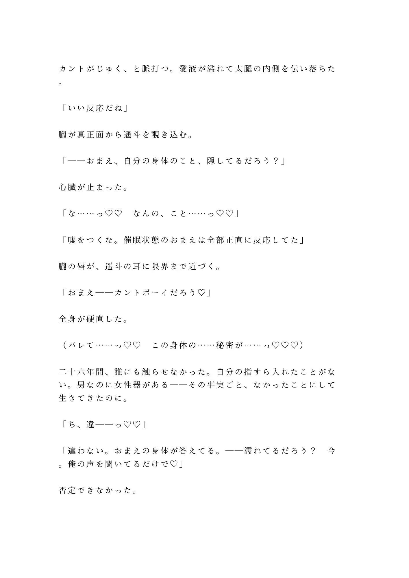 四十人の観客の前で埋め込まれた暗示。目覚めたとき、遥斗の身体はすでに朧の声だけで蕩けるように作り変えられていた。誰にも明かしたことのない秘密——男の身体に女性器を持つカントボーイであること——すら、催○の前では隠しきれない。