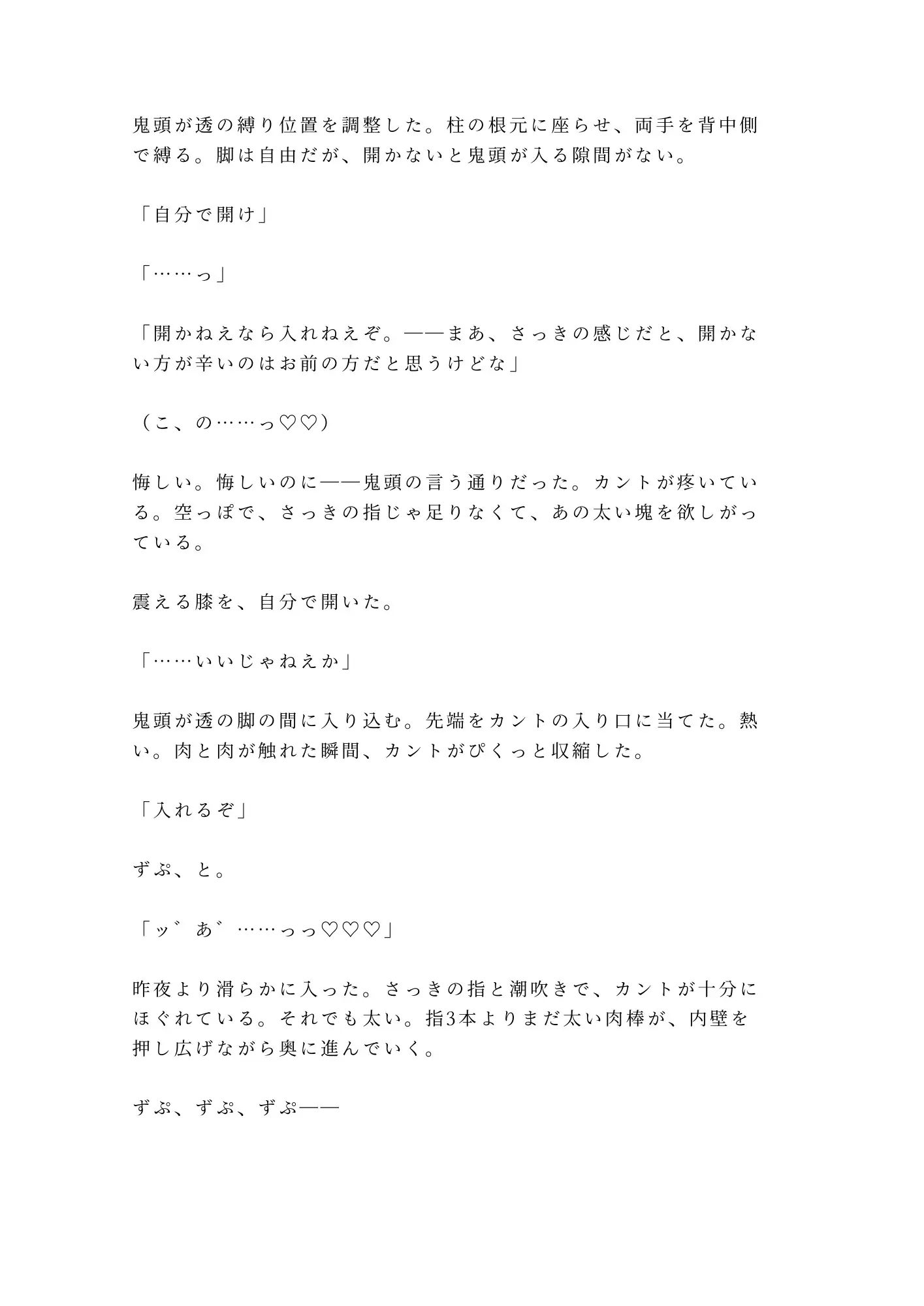 抵抗する頭と裏腹に、与えられる快楽を覚え込んでいく身体。ベルトの金属音ひとつで肌が粟立ち、太い指の気配だけでカントが濡れる。「男だ」と叫ぶ理性を、鬼頭は言葉と指と肉棒で丁寧に、そして容赦なく砕いていく。