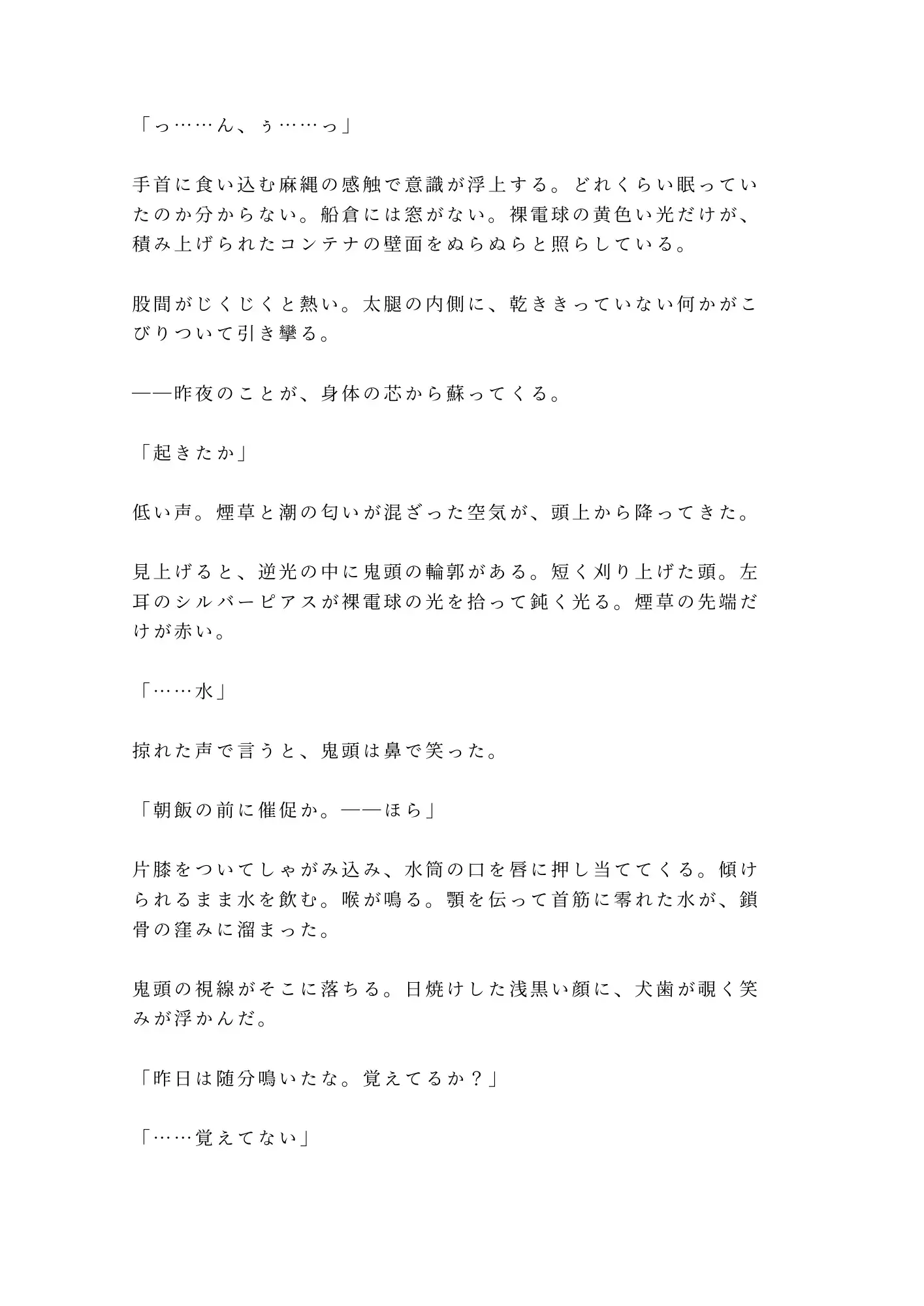 麻縄で柱に繋がれ、自由を奪われた密航者。水も食事も、すべてはこの男の手から与えられる。代価は身体。カントボーイとして生まれた透の身体を、鬼頭は一晩で暴き、二日目にはもう戻れない場所まで堕としていく。