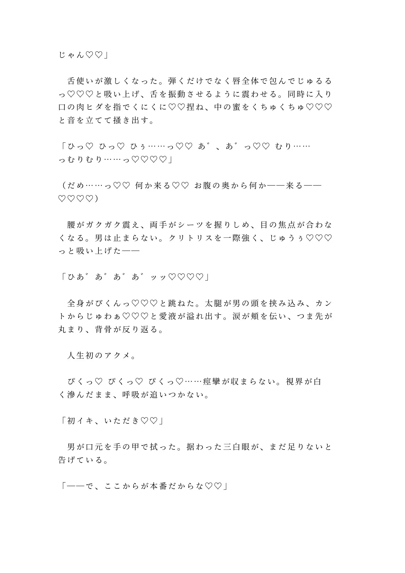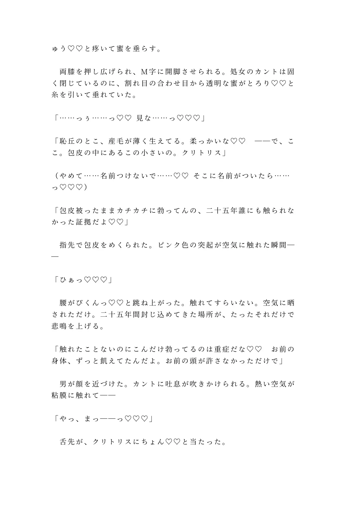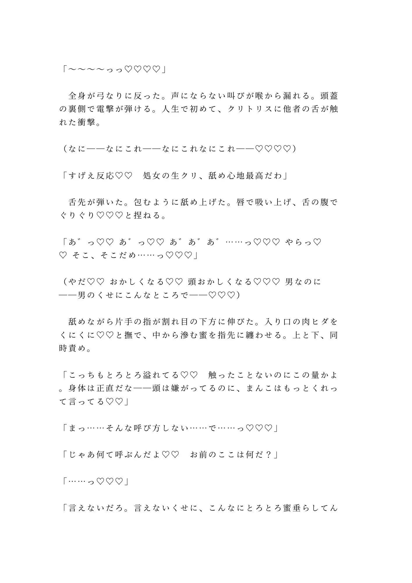 三白眼の据わった男は、処女のカントボーイを前にして歓喜した。触れたことすらなかった場所を舌で暴かれ、指で拓かれ、初めてのアクメで意識が飛ぶ。けれどそれは始まりに過ぎない。朝までに五回、奥の奥まで精を注がれ、理性の欠片もなく啼き狂わされる一夜の記録。