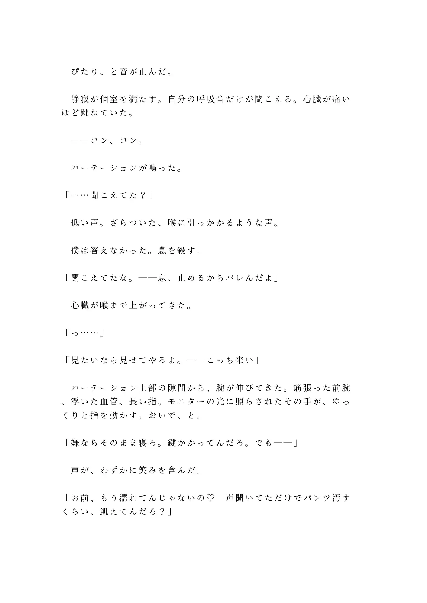 深夜の漫画喫茶——蛍光灯の消えた個室で、壁越しの喘ぎ声に身体が勝手に反応してしまった僕。二十五年間、誰にも明かさなかった秘密。男の身体に唯一刻まれた「女」の痕跡。それを、隣の個室の見知らぬ男に暴かれた。「10秒待つ。鍵、開けるかどうかはお前が決めろ」