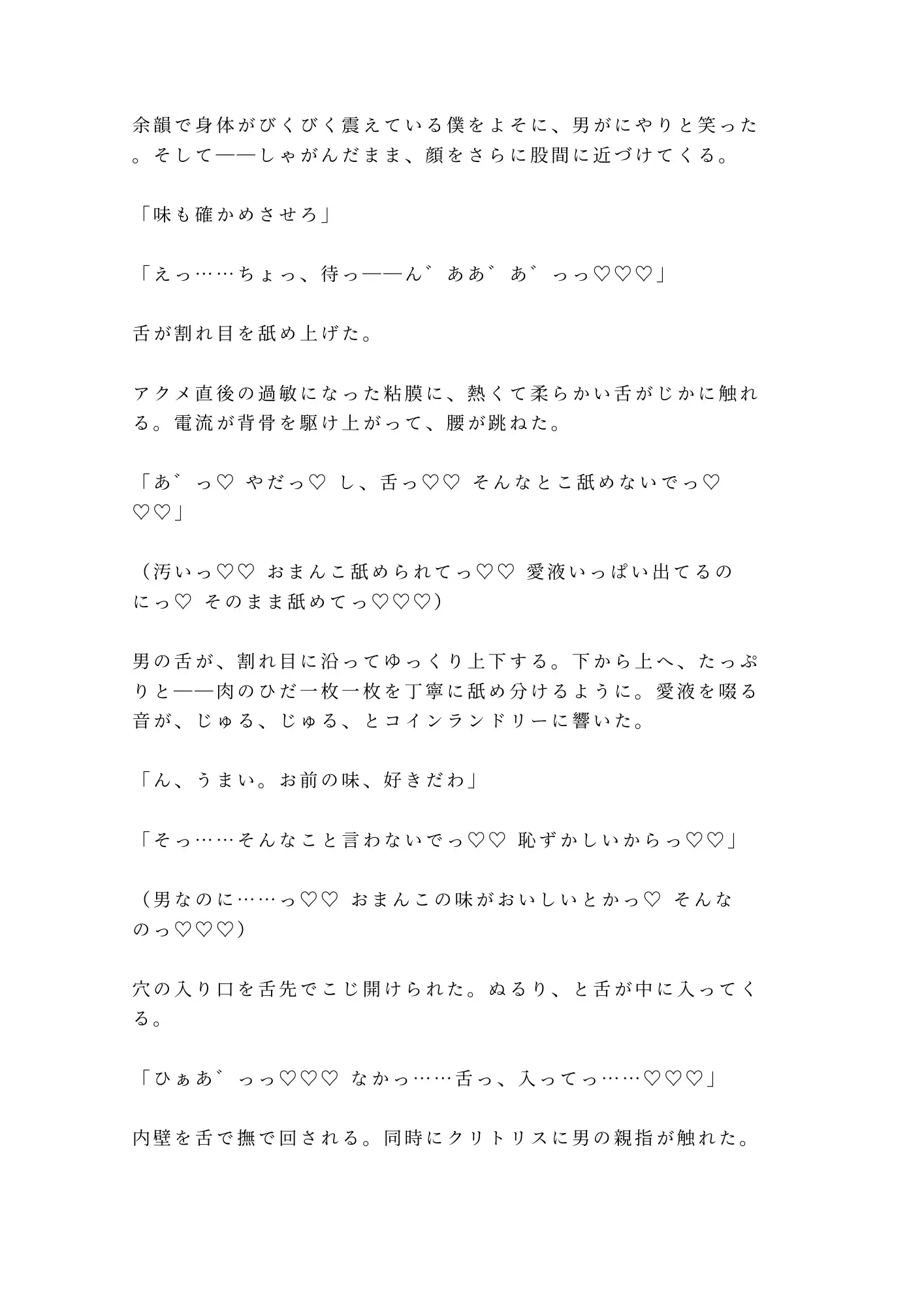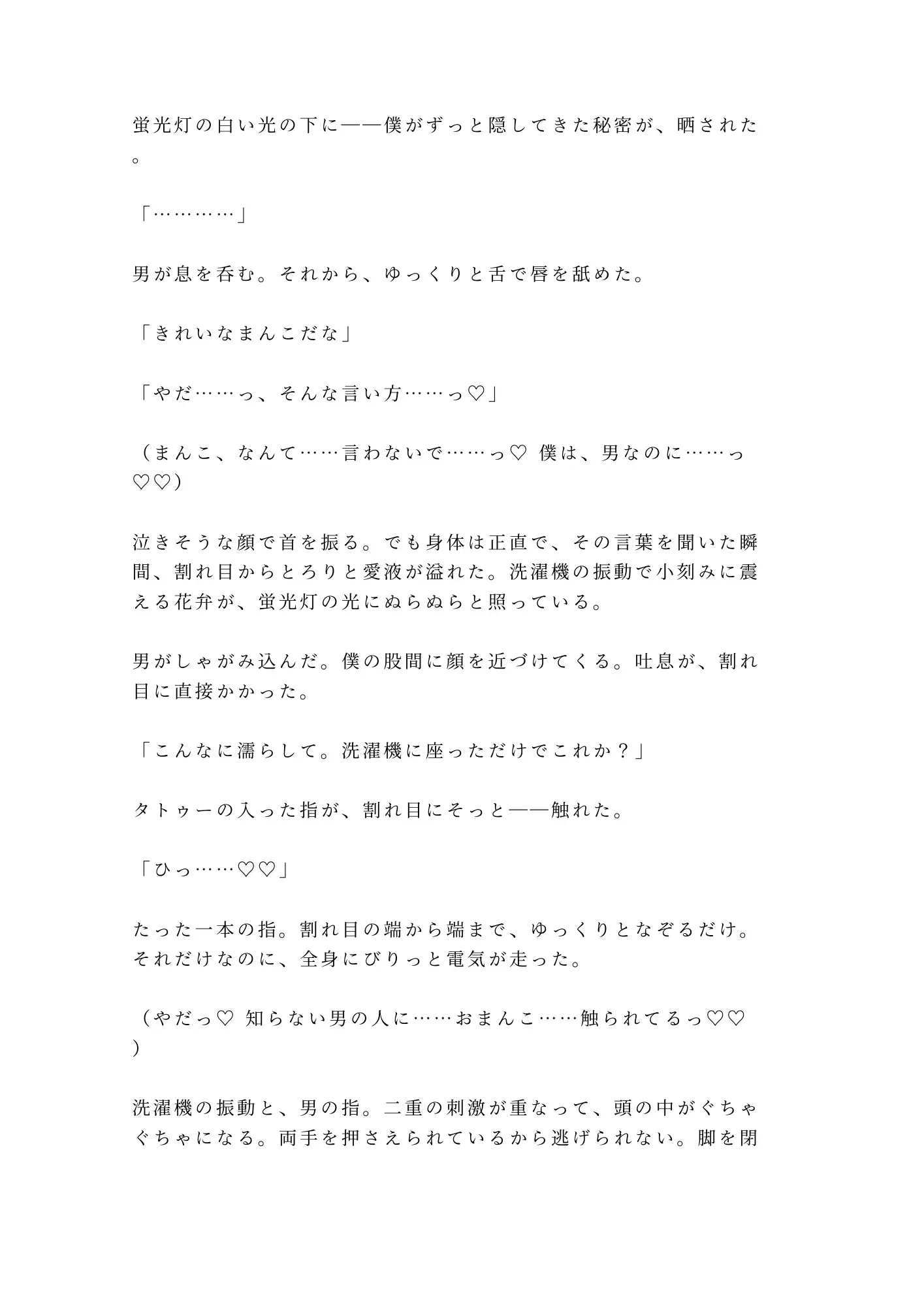 深夜3時のコインランドリー。誰にも会わないはずの時間帯で、僕はずっと秘密を守ってきた。男の身体に生まれながら、股の間にある「もうひとつの器官」——誰にも知られてはいけない、僕だけの秘密。「濡れるからだろ?」