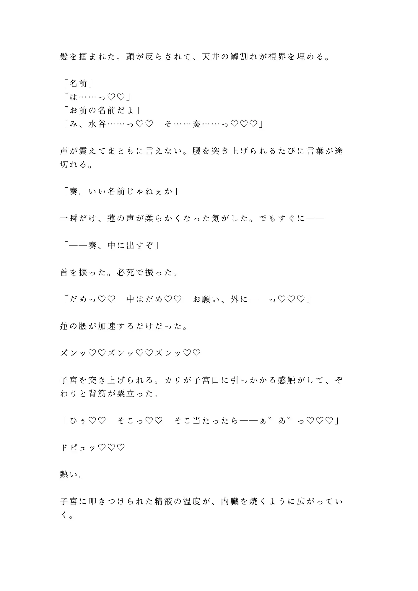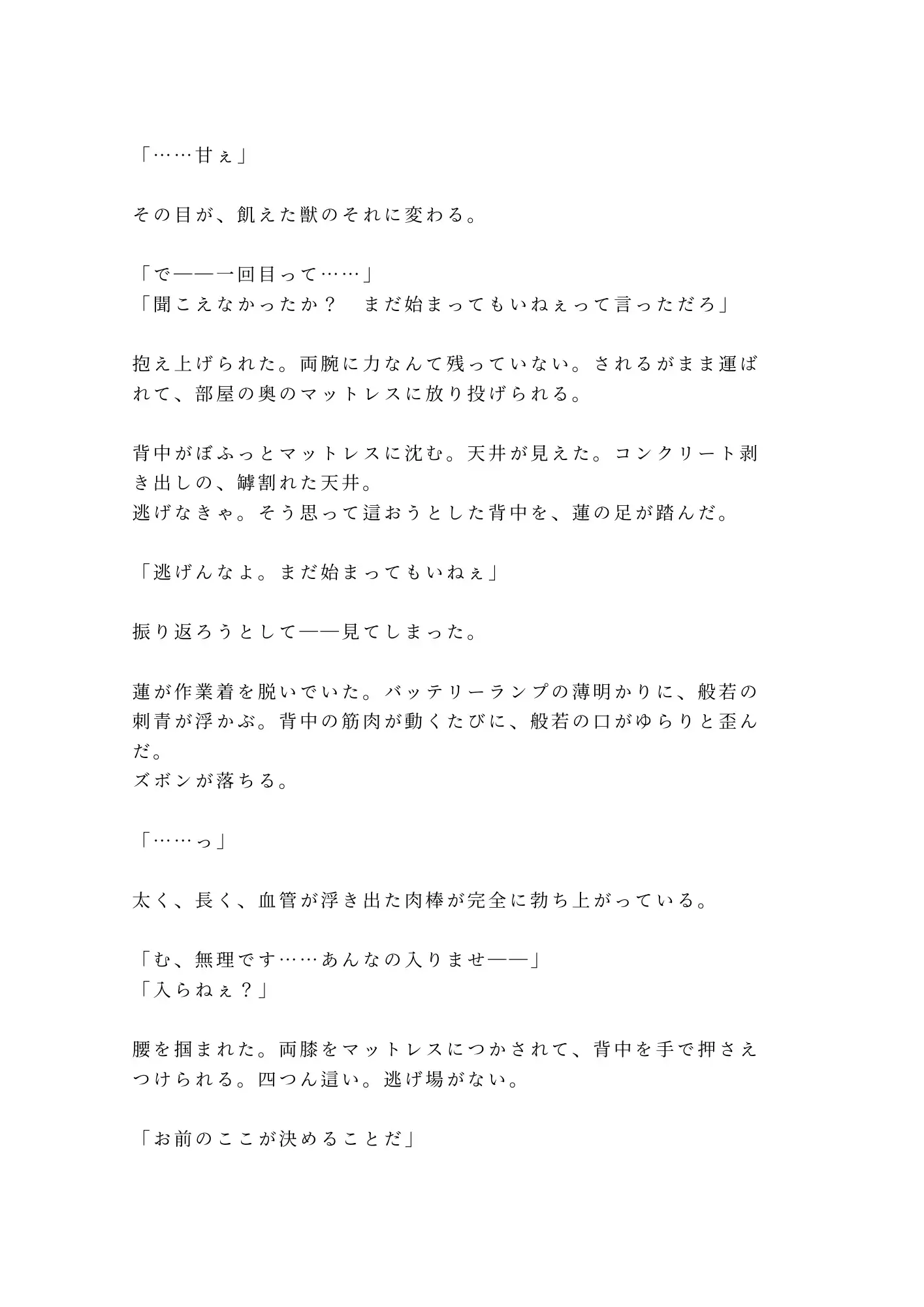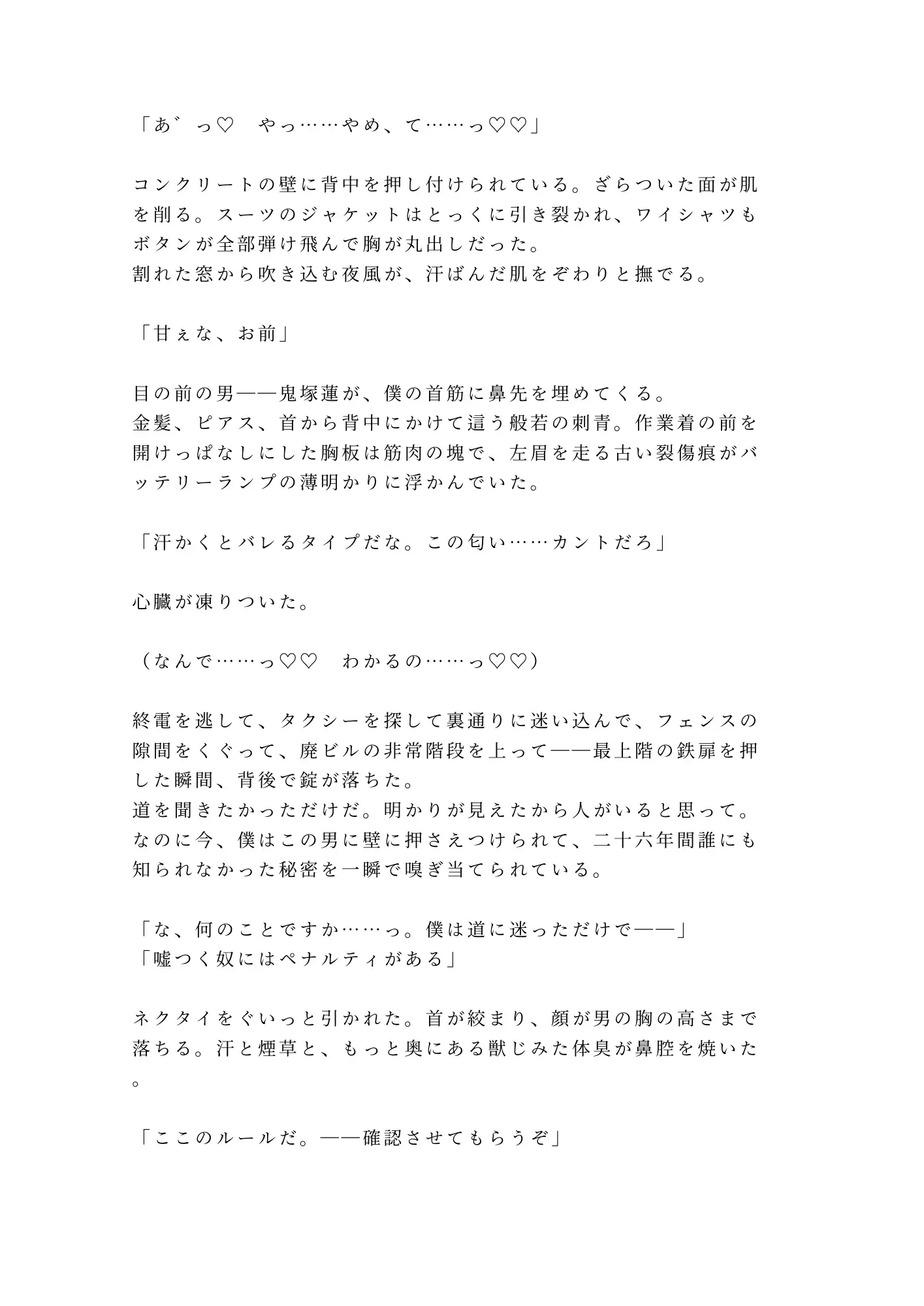 金髪、般若の刺青、拳ダコだらけの太い指。粗暴で野蛮で、けれどどこか獣じみた色気を纏う蓮に壁へ押しつけられ、奏の理性は一枚ずつ剥がされていく。触れられたことのない場所を無遠慮にこじ開けられ、知らなかった快感を叩き込まれ、抵抗する声はいつしか甘い嬌声に変わっていた。
