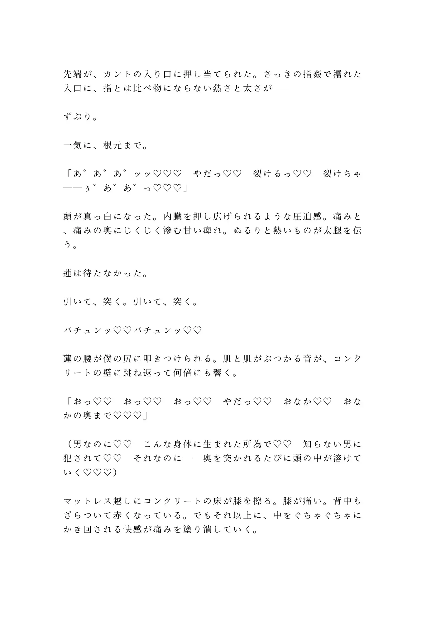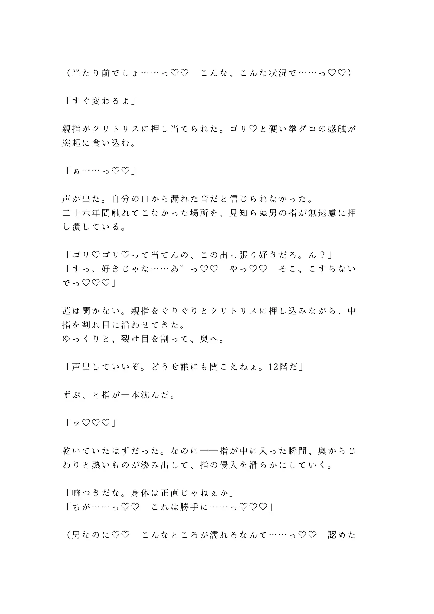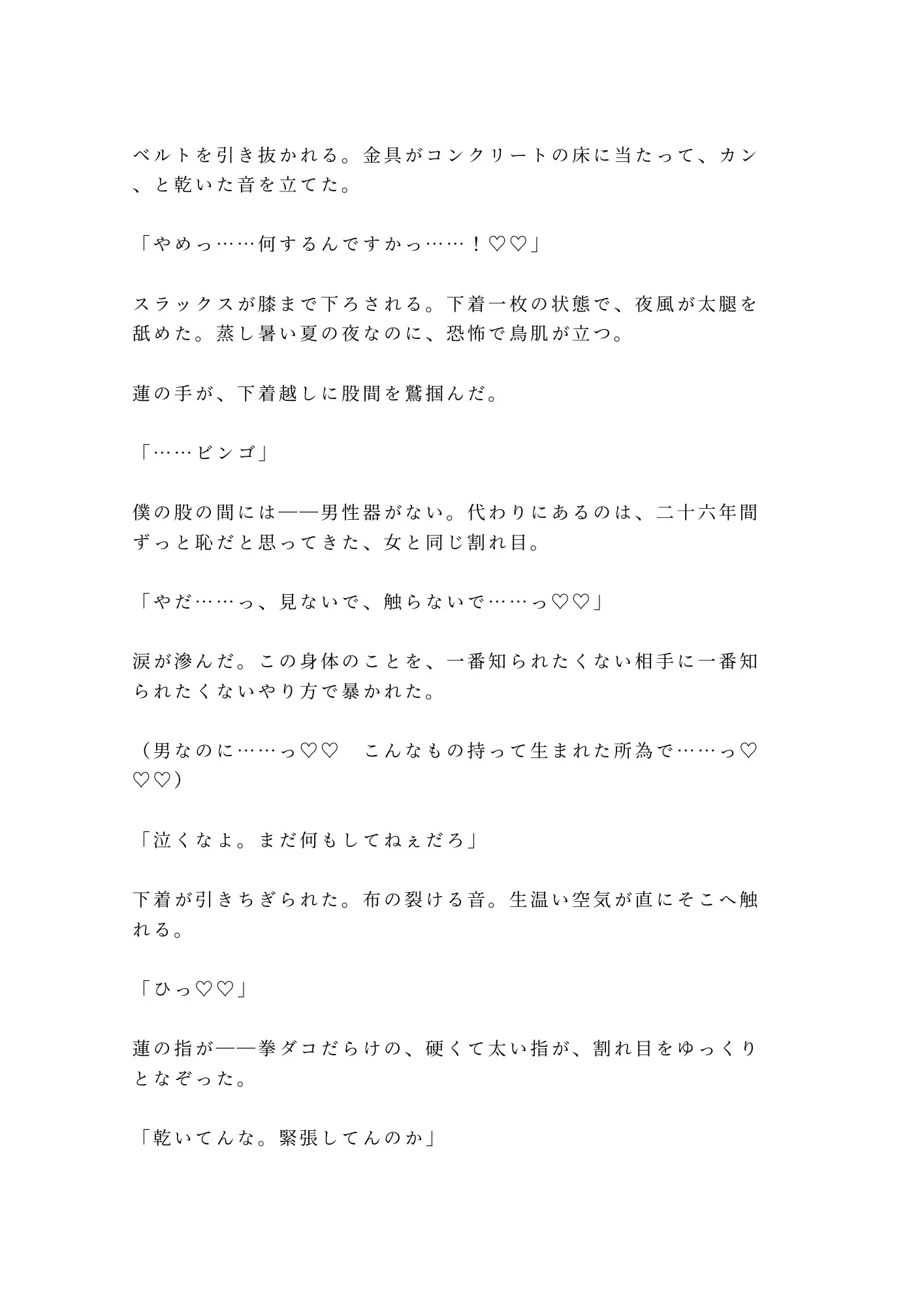 終電を逃した夜、迷い込んだ廃ビルの最上階——そこは、逃げ場のない密室だった。会社員の水谷奏には、二十六年間ひた隠しにしてきた秘密がある。男の身体に生まれながら、股の間にあるのは女と同じ割れ目。誰にも知られてはならない。知られたら終わりだと、ずっと自分に言い聞かせてきた。