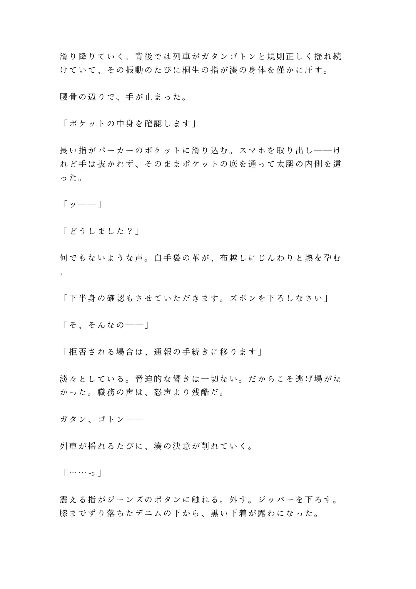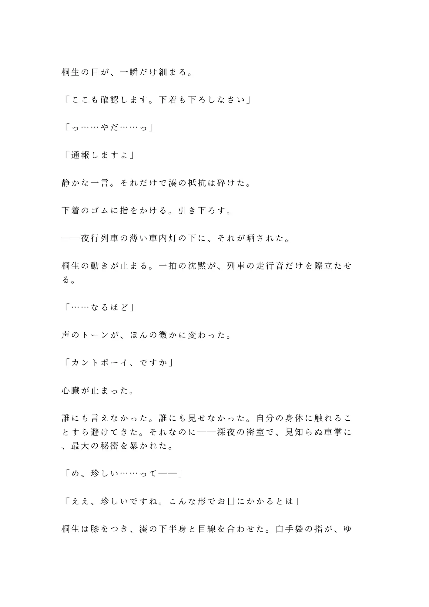 車掌・桐生の低い声。背後で鍵が落ちる音。カチリ。深夜の寝台特急、幅70センチの密室に閉じ込められた湊に、桐生は穏やかな職務口調のまま告げる。