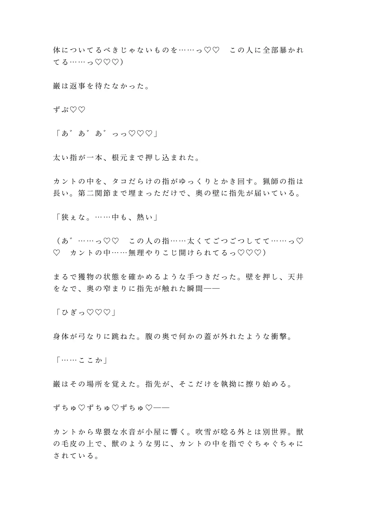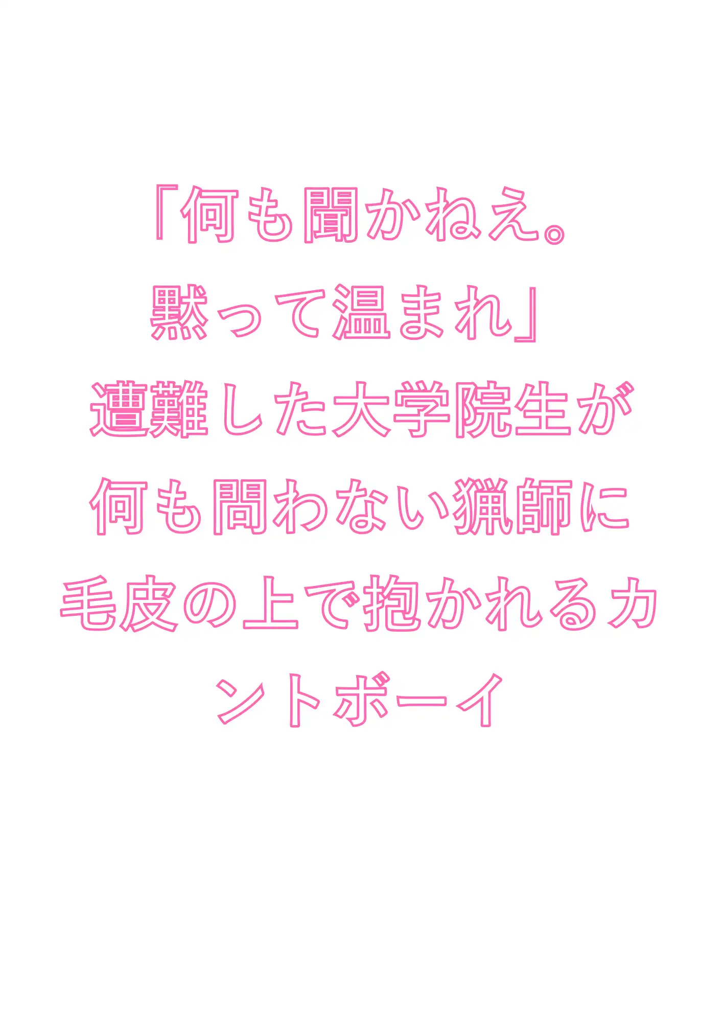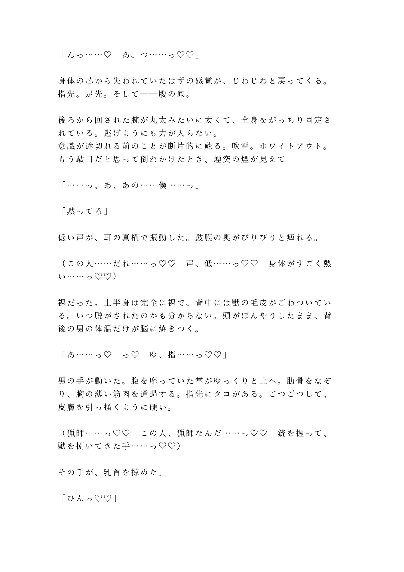 吹雪の夜、死にかけた僕を拾ったのは――山奥に棲む、熊みたいな猟師だった。凍えた身体を温めるという名目で始まった「処置」は、いつしか獣の毛皮の上での蹂躙に変わっていく。猟銃のタコだらけの太い指がカントをこじ開け、人生で初めての絶頂を無理やり引きずり出される。抵抗する力なんか残っていない。そもそも、抵抗したいのかどうかすら分からない。