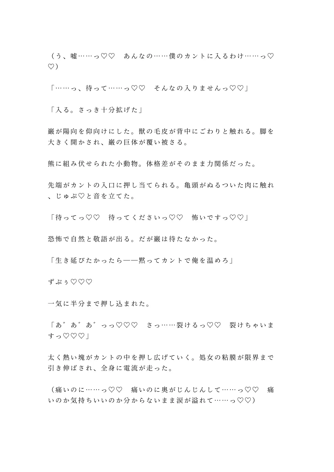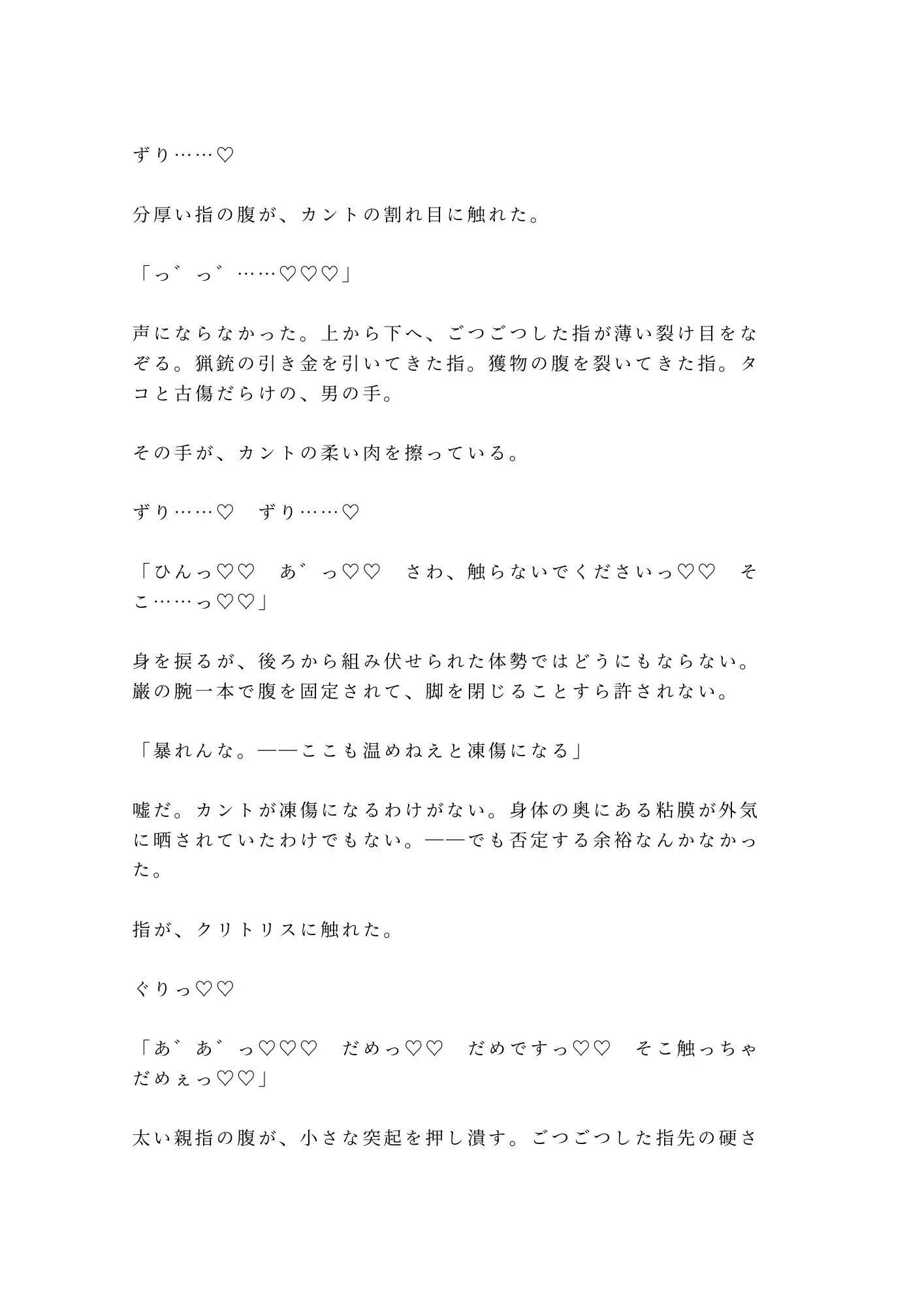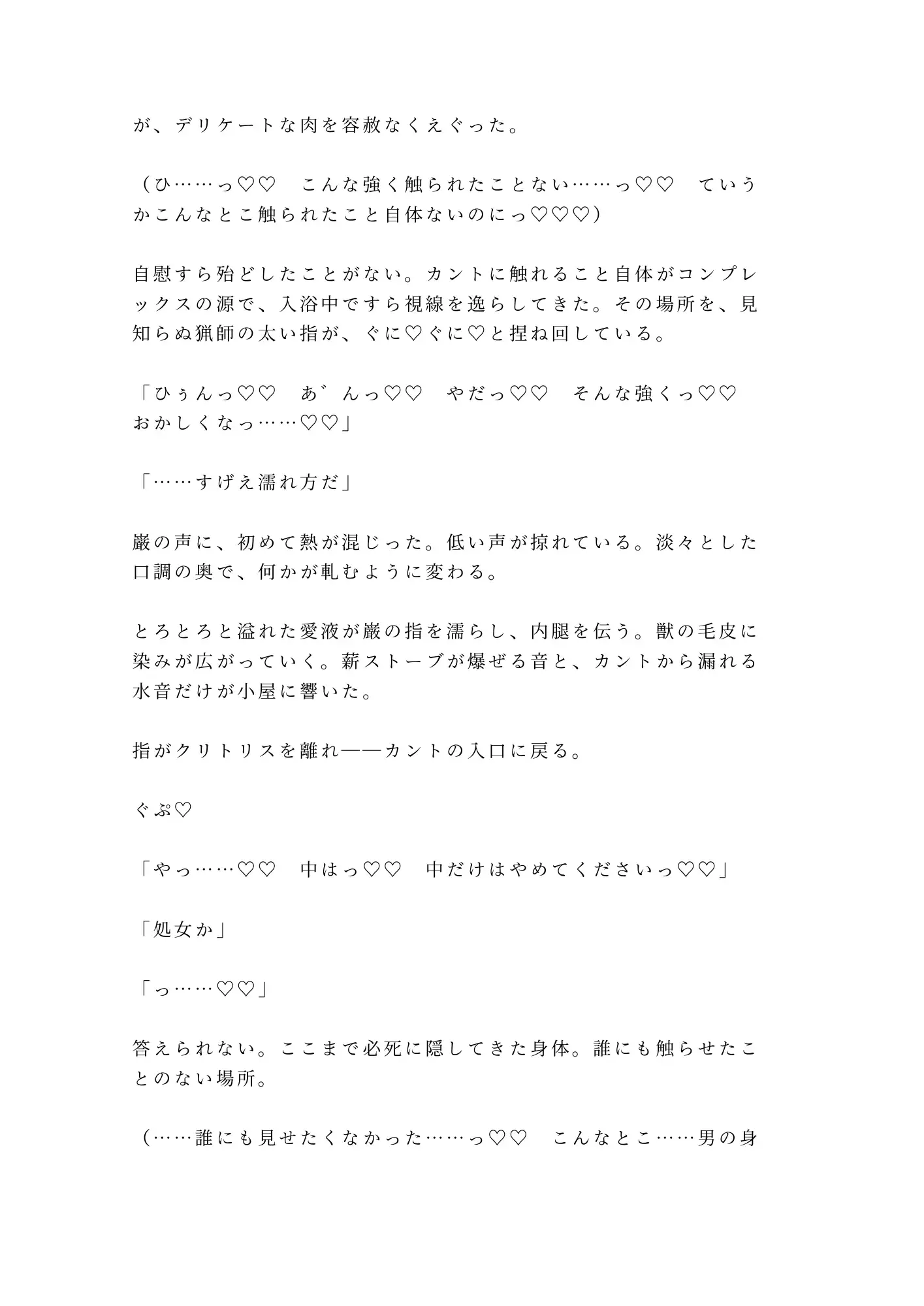 獲物を仕留める目で見下ろされ、逃げ場のない山小屋で処女を散らされる。痛みと快楽の境目が溶けて、涙と愛液がぐちゃぐちゃに混ざる頃には、もう自分が何を懇願しているのかも分からない。怖い。怖いのに、カントが勝手にこの男を求めてしまう。