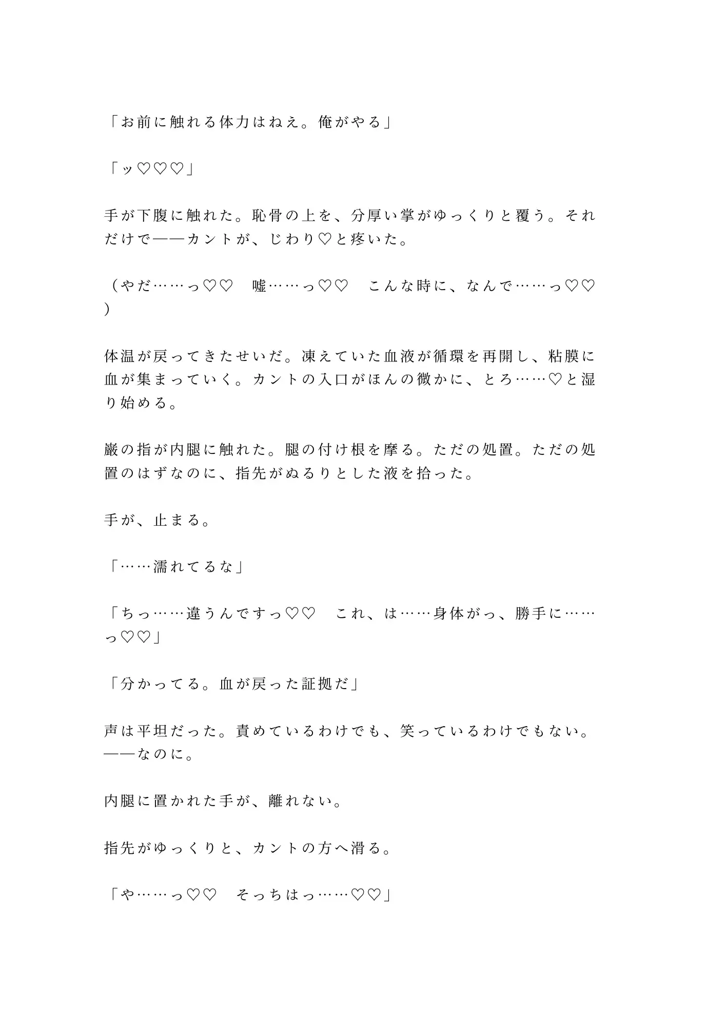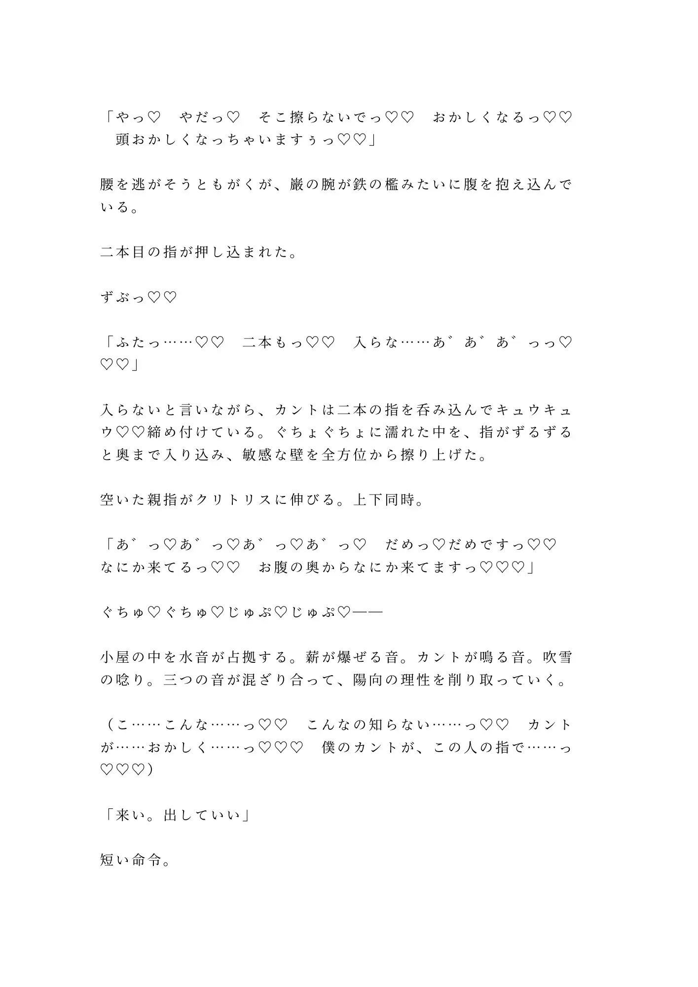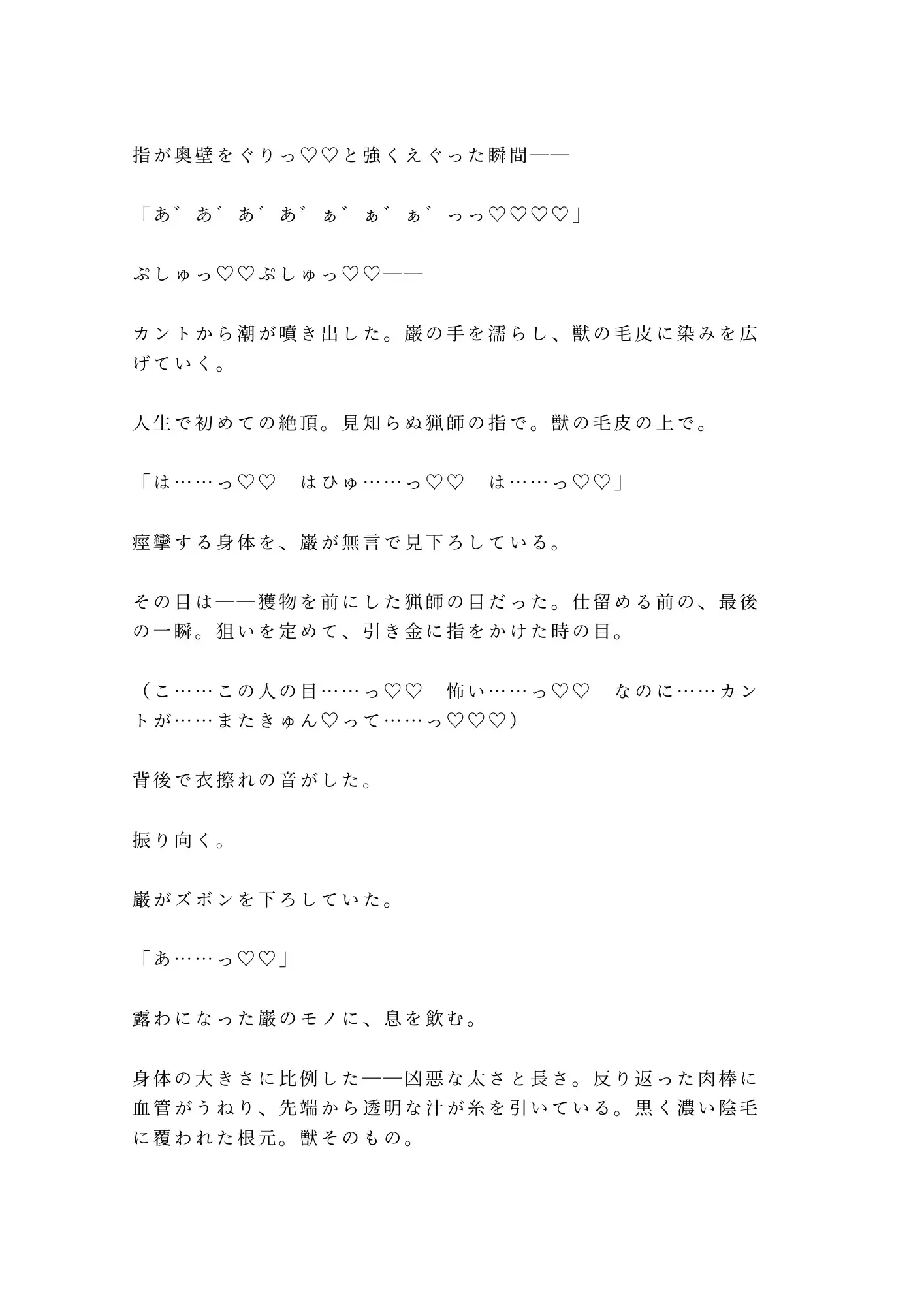 獲物を仕留める目で見下ろされ、逃げ場のない山小屋で処女を散らされる。痛みと快楽の境目が溶けて、涙と愛液がぐちゃぐちゃに混ざる頃には、もう自分が何を懇願しているのかも分からない。怖い。怖いのに、カントが勝手にこの男を求めてしまう。
