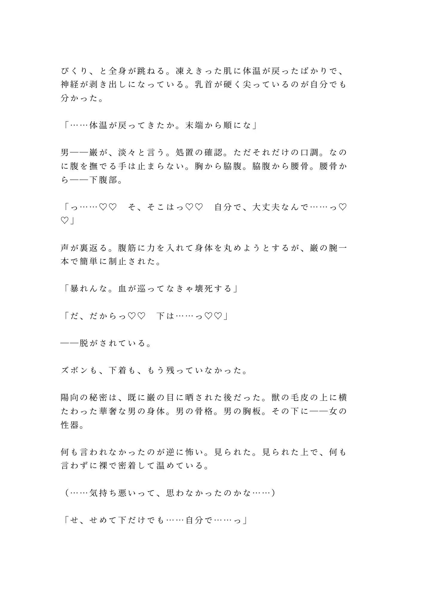 男の身体に女の性器を持つコンプレックス。誰にも見せたくなかった秘密を、この猟師は一瞥しただけで何も言わなかった。気持ち悪いとも、珍しいとも。ただ黙って触れてきた。その無言が、陽向の心の壁を内側から壊していく。