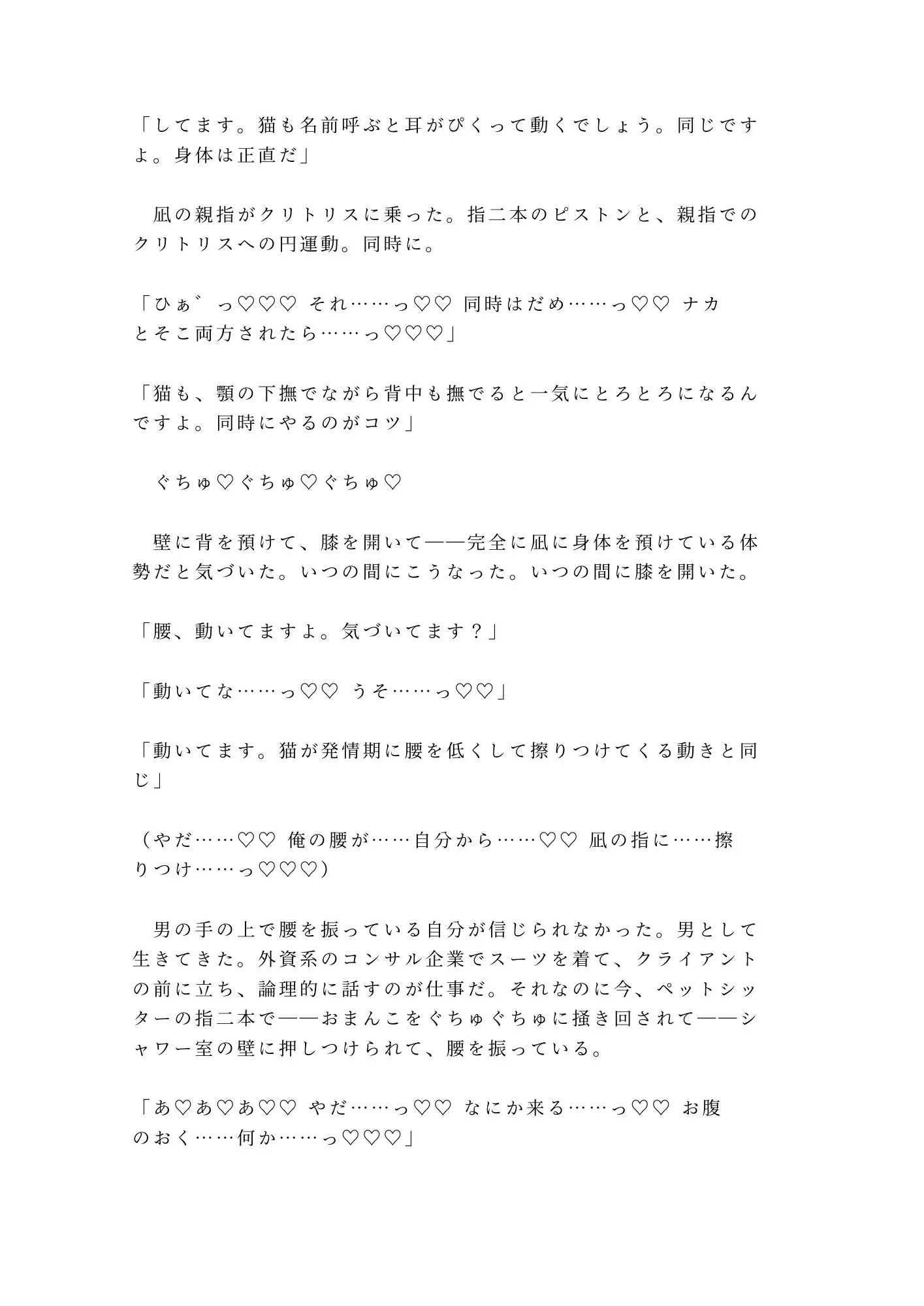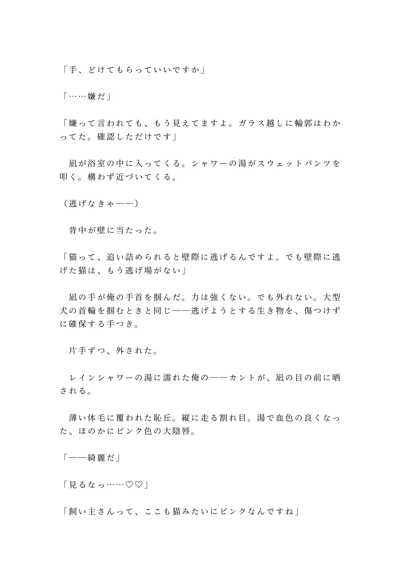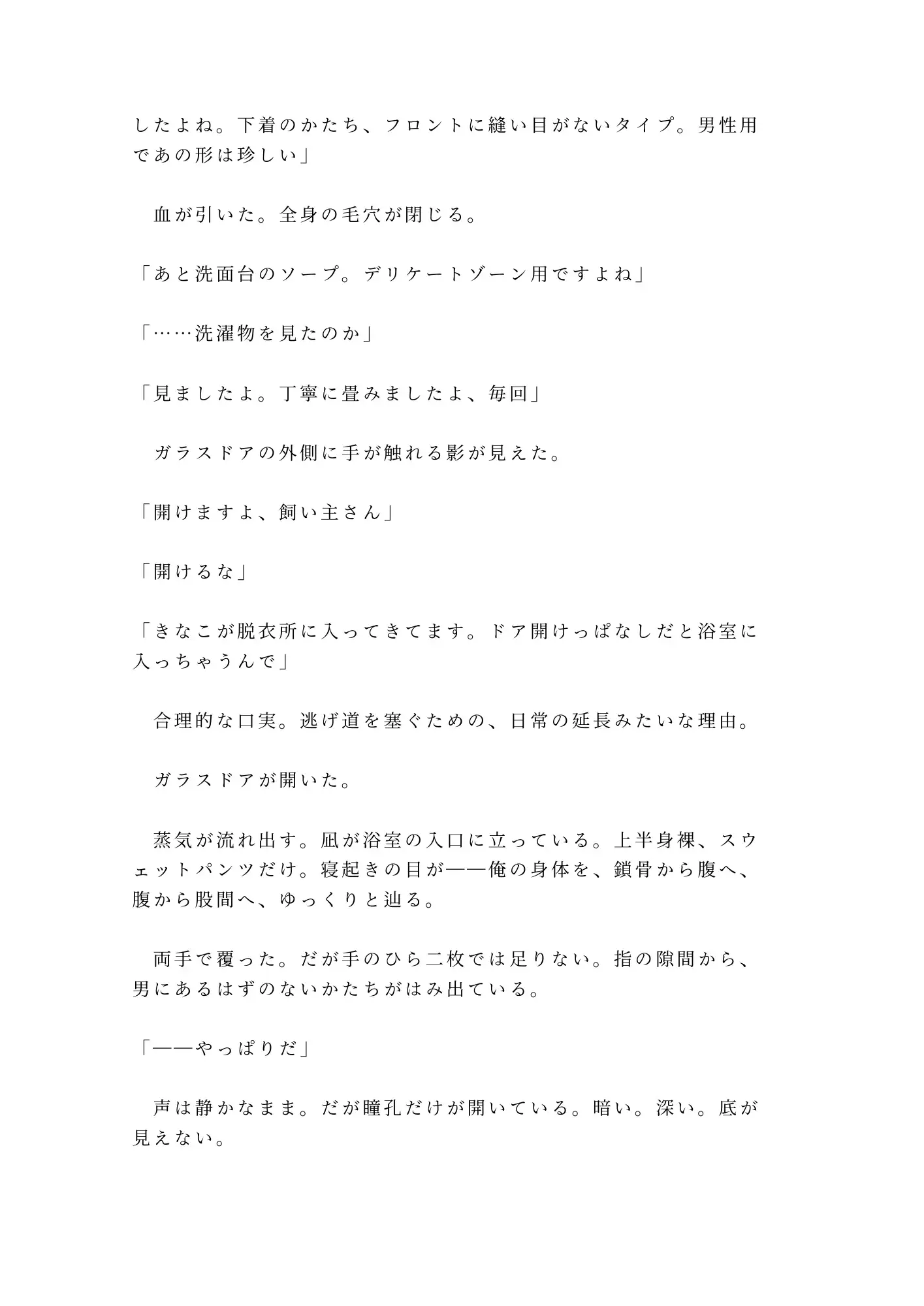 外資系コンサルの三十歳。出張中の愛猫・きなこの世話を、ペットシッターの朝比奈凪に任せている。合鍵を渡し、Googleカレンダーを共有し、寝室のベッドで凪が寝泊まりする契約。出張から早めに帰宅した夜、シャワーを浴びていた俺の前に、凪が現れた。「ガラス越しに見えてます。前から気になってたんです。飼い主さんの下着、フロントに縫い目がないタイプ」