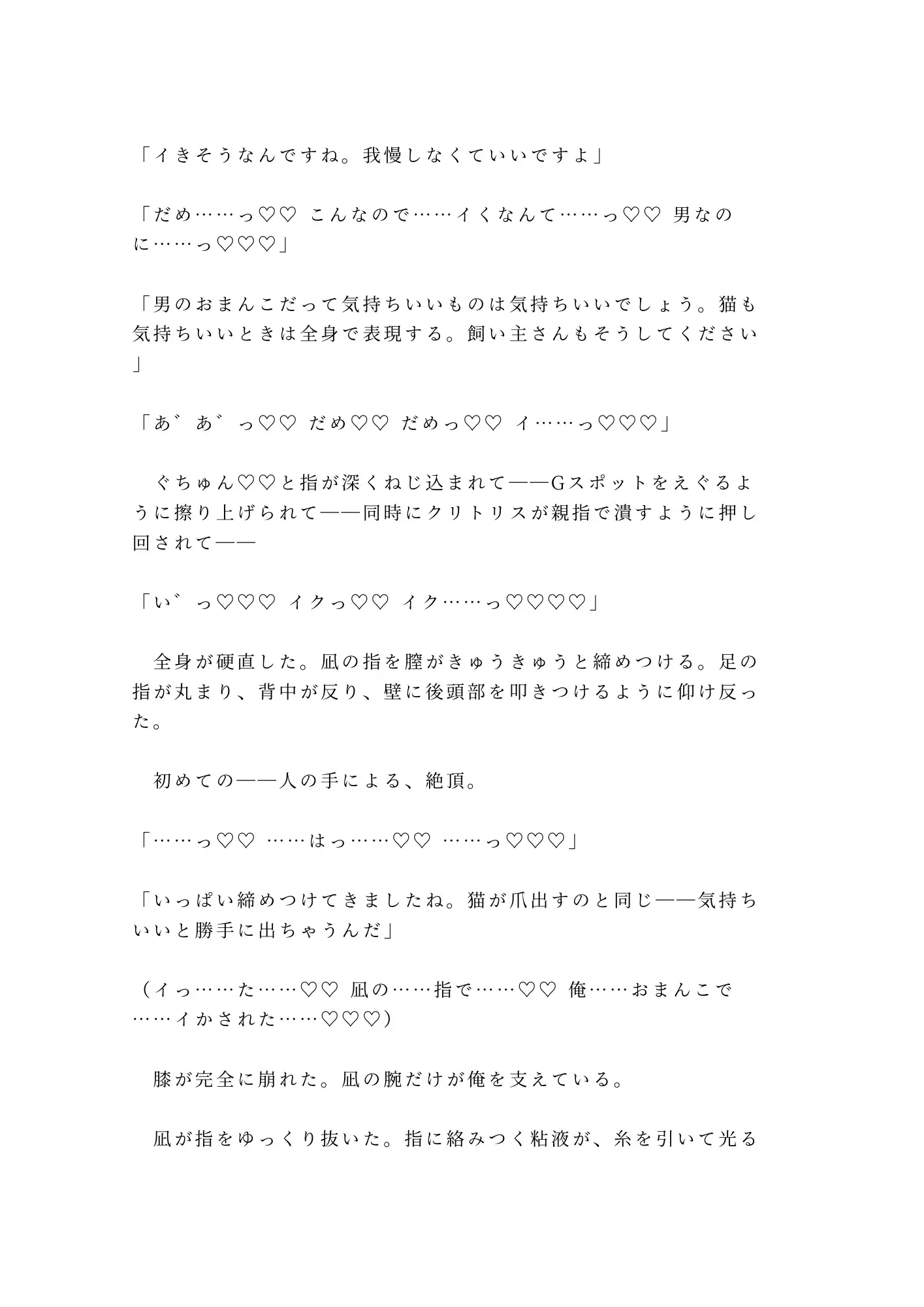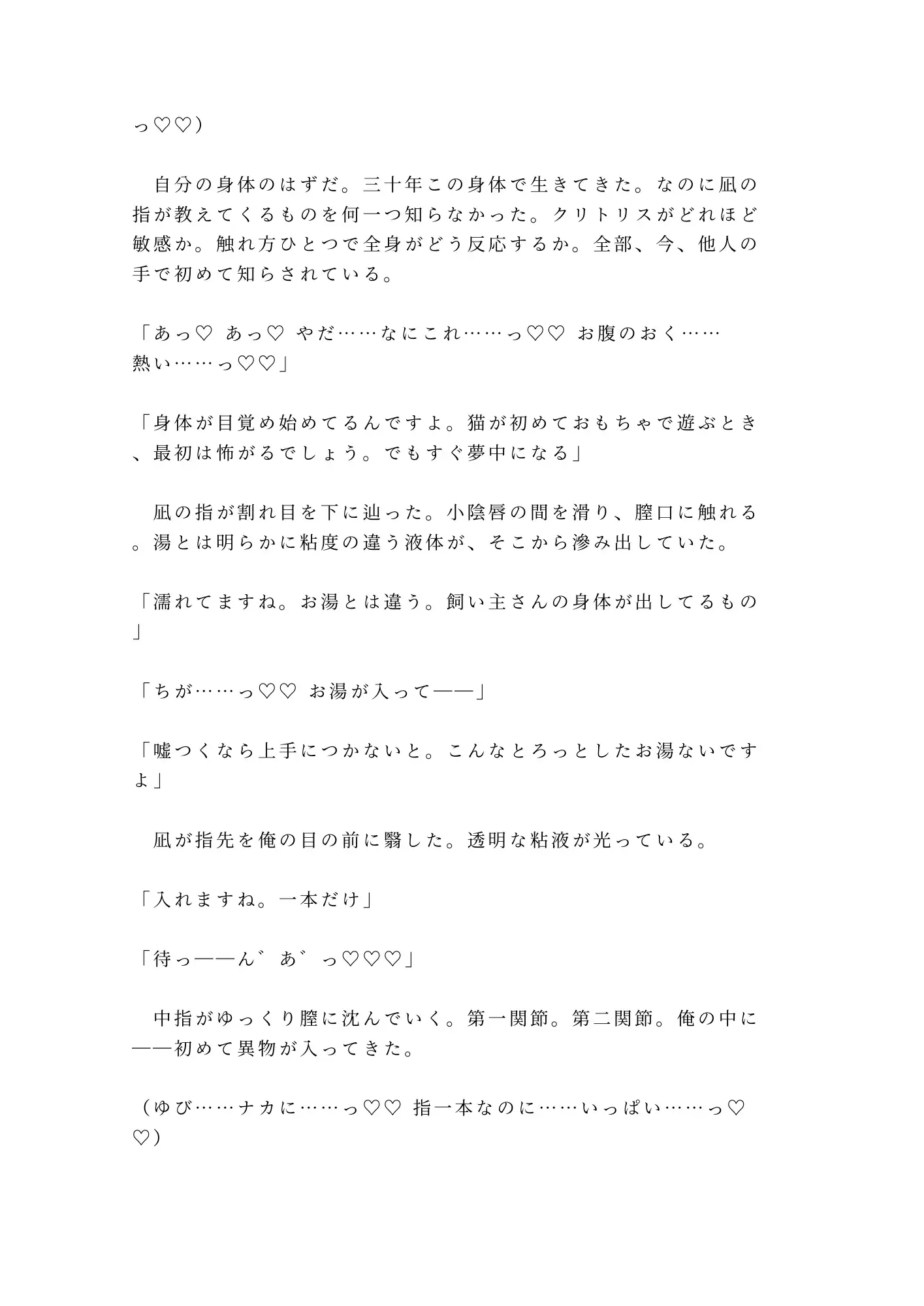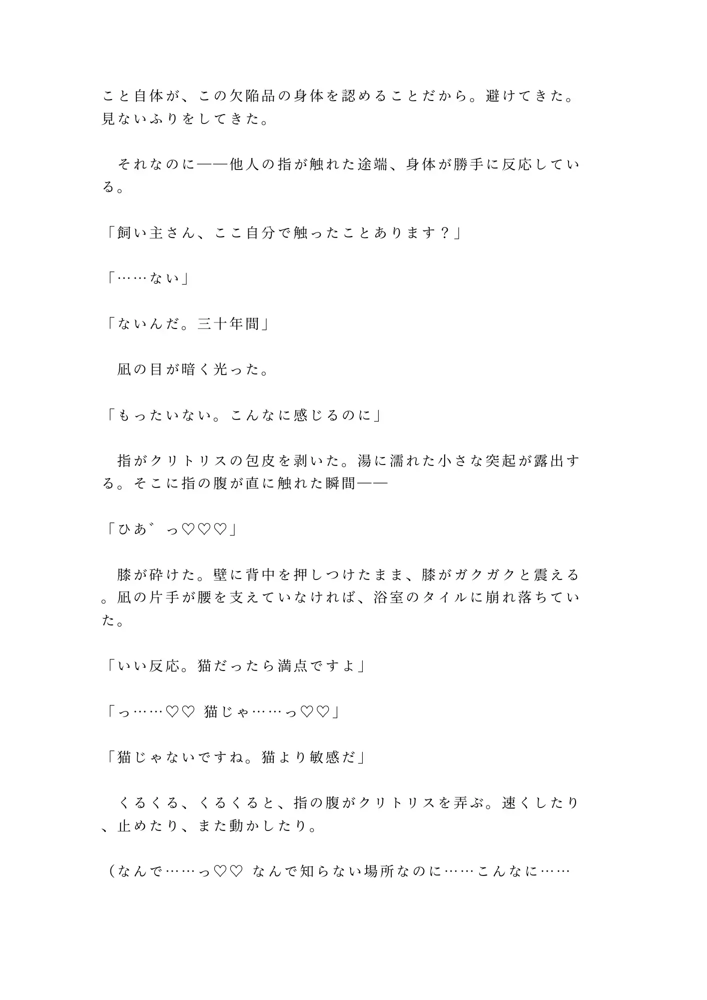 外資系コンサルの三十歳。出張中の愛猫・きなこの世話を、ペットシッターの朝比奈凪に任せている。合鍵を渡し、Googleカレンダーを共有し、寝室のベッドで凪が寝泊まりする契約。出張から早めに帰宅した夜、シャワーを浴びていた俺の前に、凪が現れた。「ガラス越しに見えてます。前から気になってたんです。飼い主さんの下着、フロントに縫い目がないタイプ」