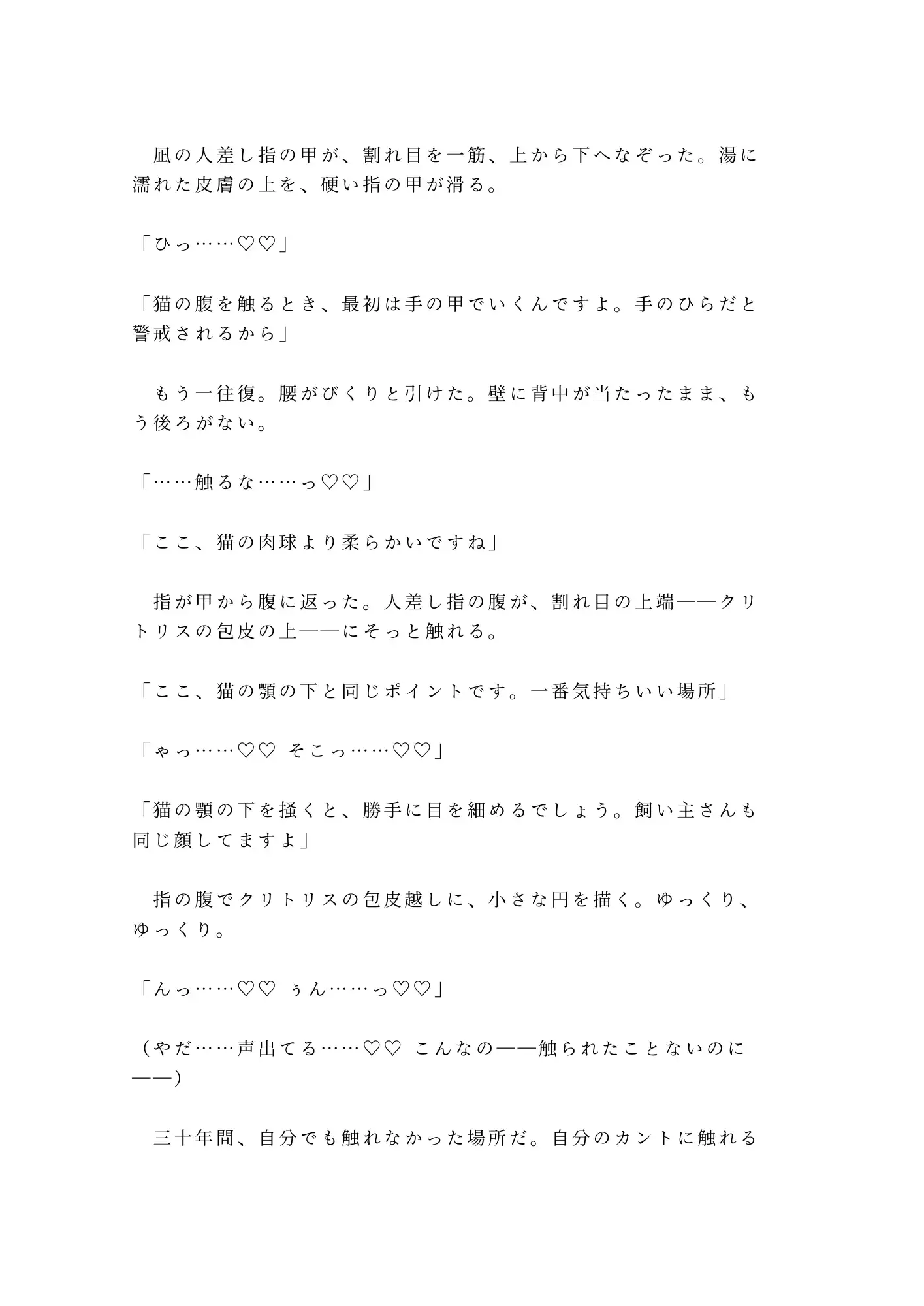 三十年間触れたことのないカントを、動物を扱うプロの手で開かれていく。舌で味見され、指でGスポットを見つけられ、「身体に気持ちいいを覚え込ませていく。猫のトレーニングと同じ」と初めての絶頂を叩き込まれる。