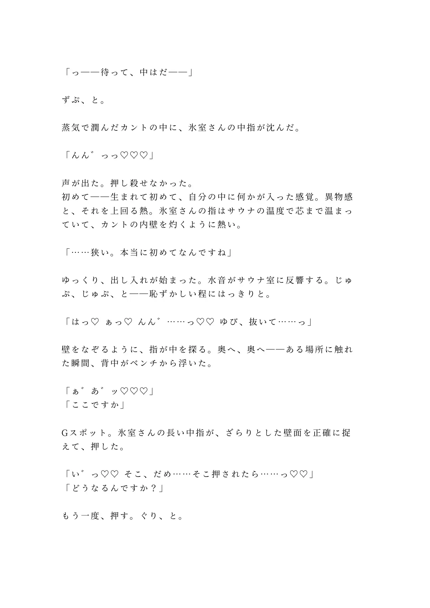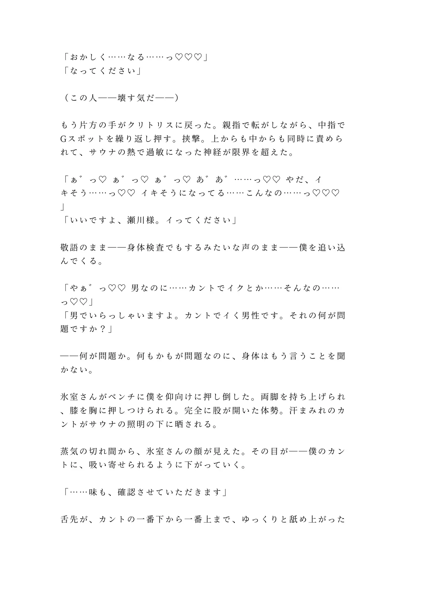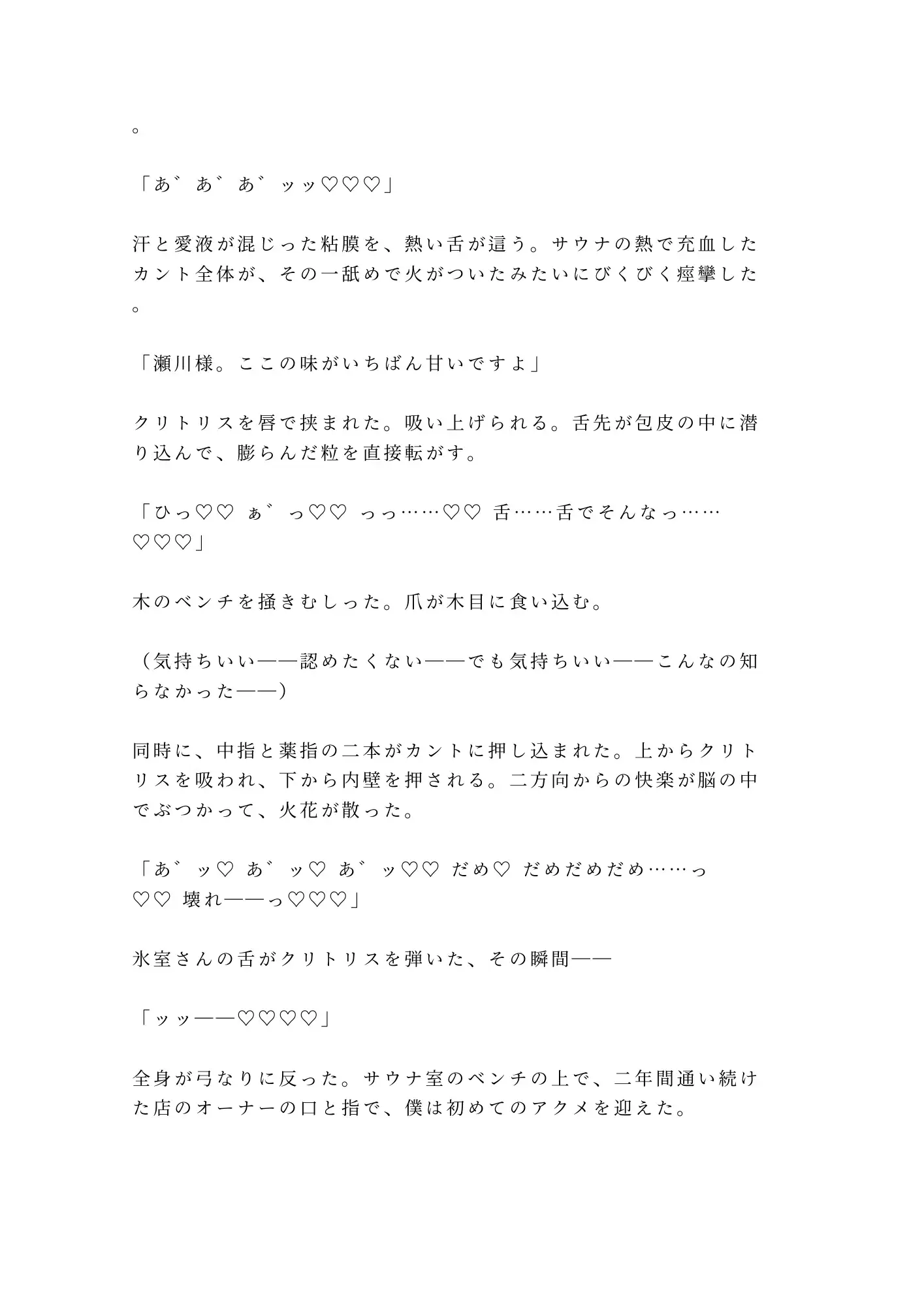 全ては仕組まれていた。二年間、防犯カメラでタオルに隠れる仕草を観察し続けていたオーナーが、この夜のために個室を封鎖した。サウナの蒸気の中でクリトリスを責められ、水風呂の冷水で研ぎ澄まされた感覚で指を突き込まれ、温冷交代の度にカントを開かされていく。