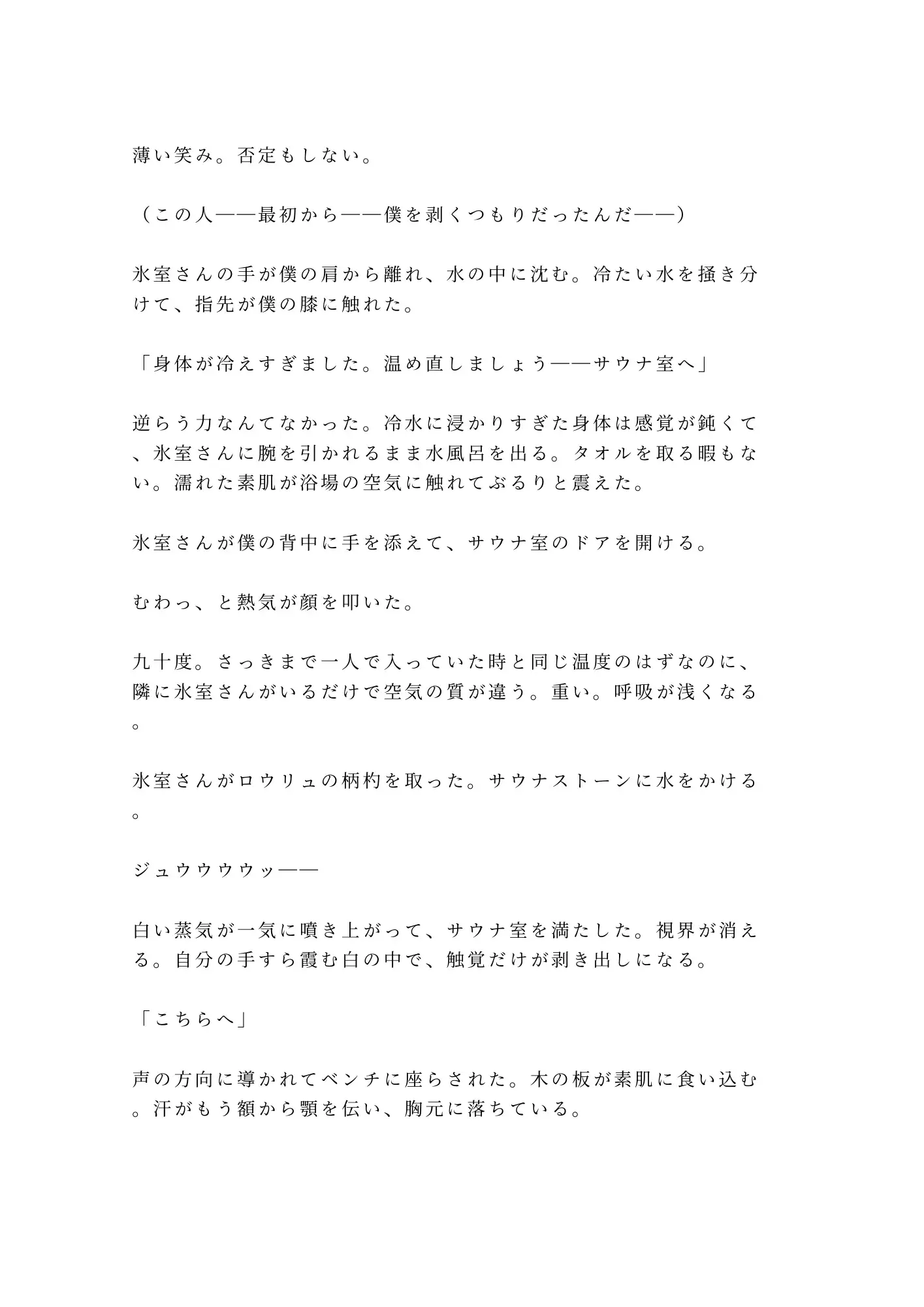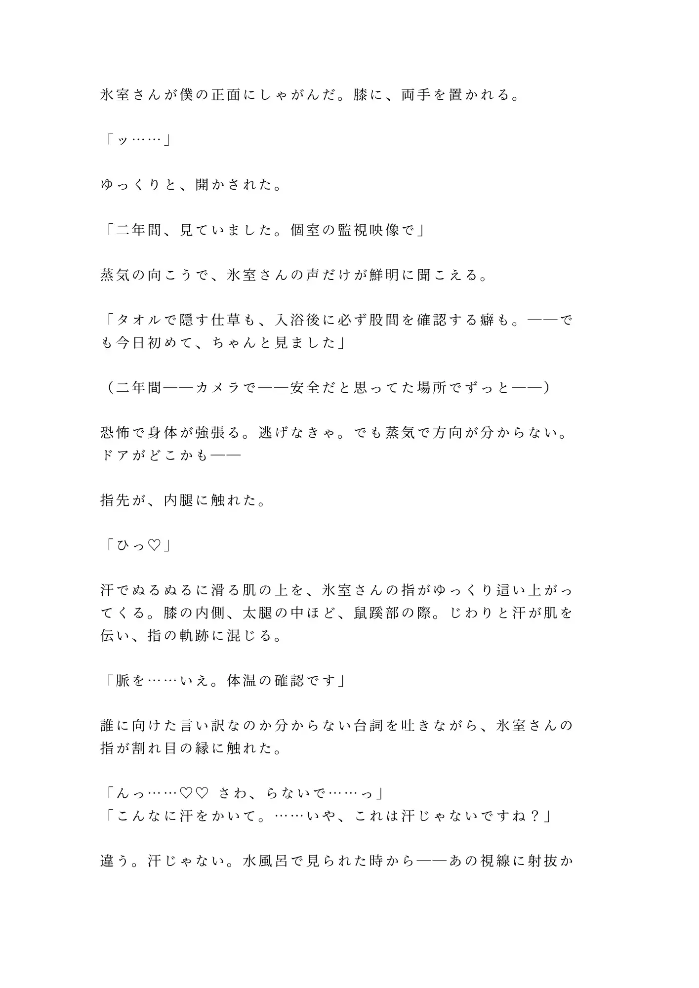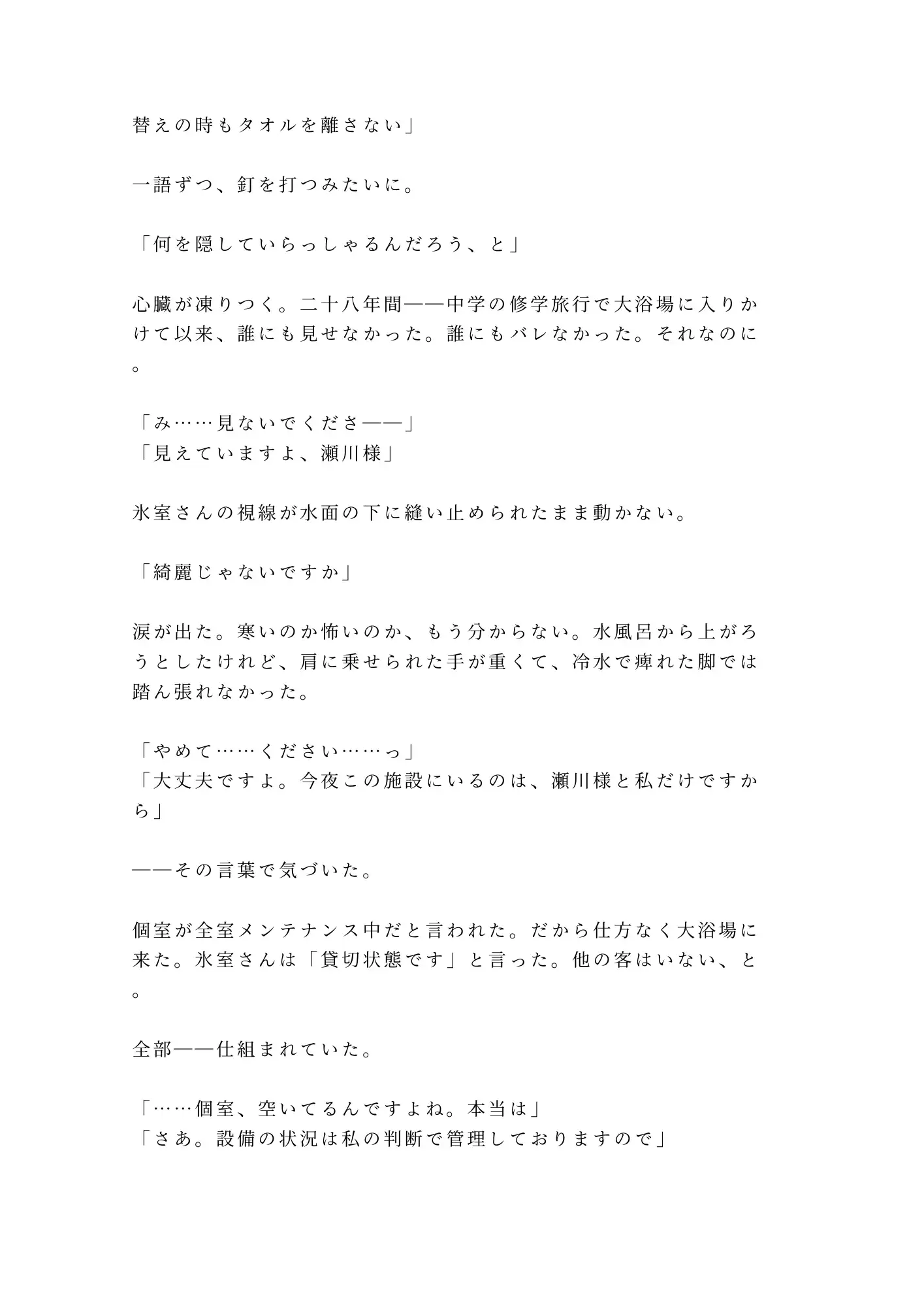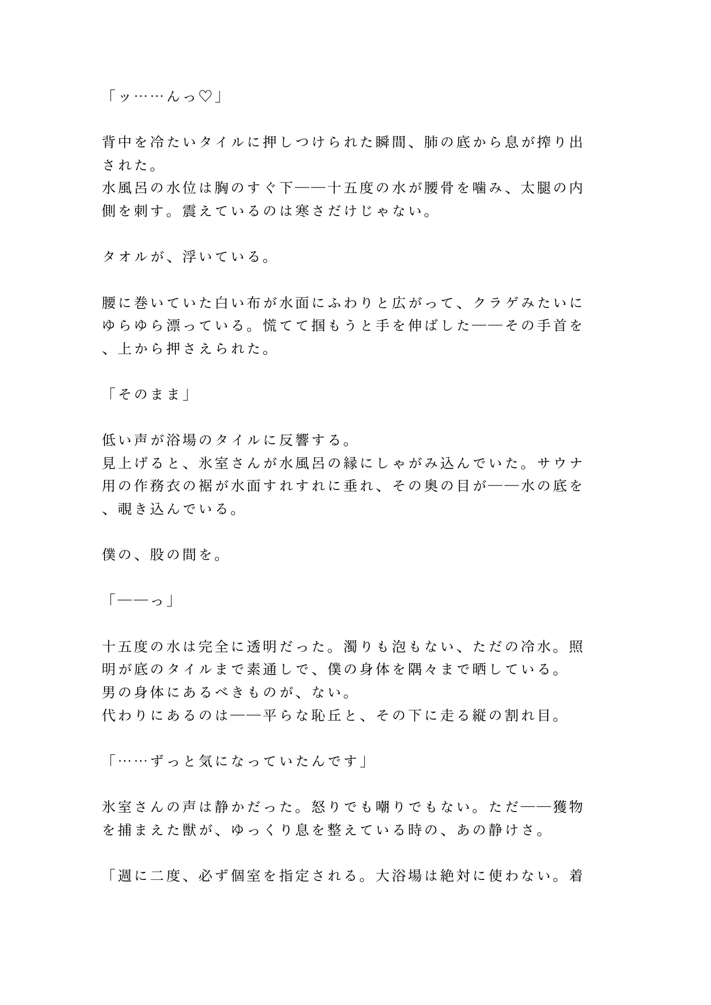 二十八歳の瀬川は、二年間このサウナに通い続けてきた。必ず個室を指定し、大浴場は絶対に使わず、着替えの時もタオルを離さない。隠していたのは、男の身体についたカントだ。その夜、個室は全室メンテナンス中だと告げられた。「貸切状態です」というオーナー・氷室の言葉を信じて大浴場に入り、水風呂に沈んだ瞬間――腰に巻いたタオルが浮いた。十五度の透明な冷水が、カントを底のタイルまで丸見えにする。