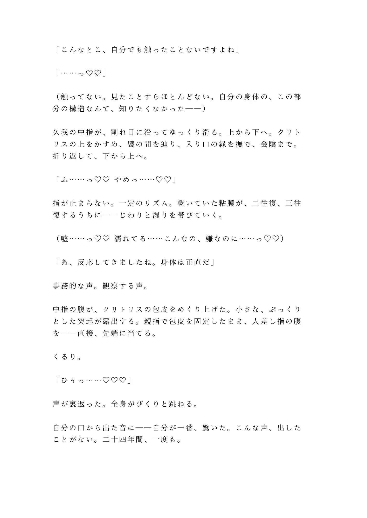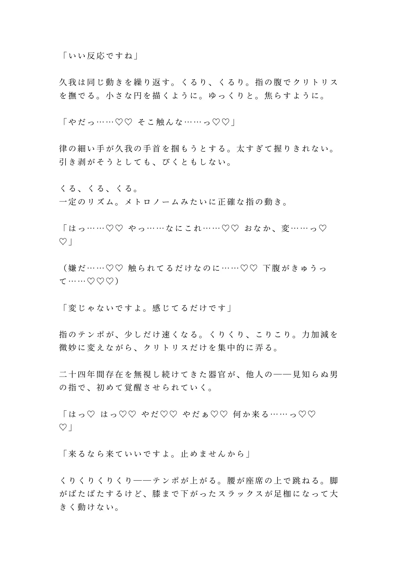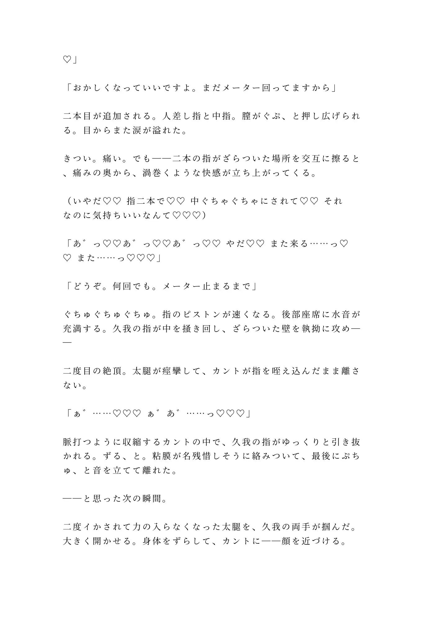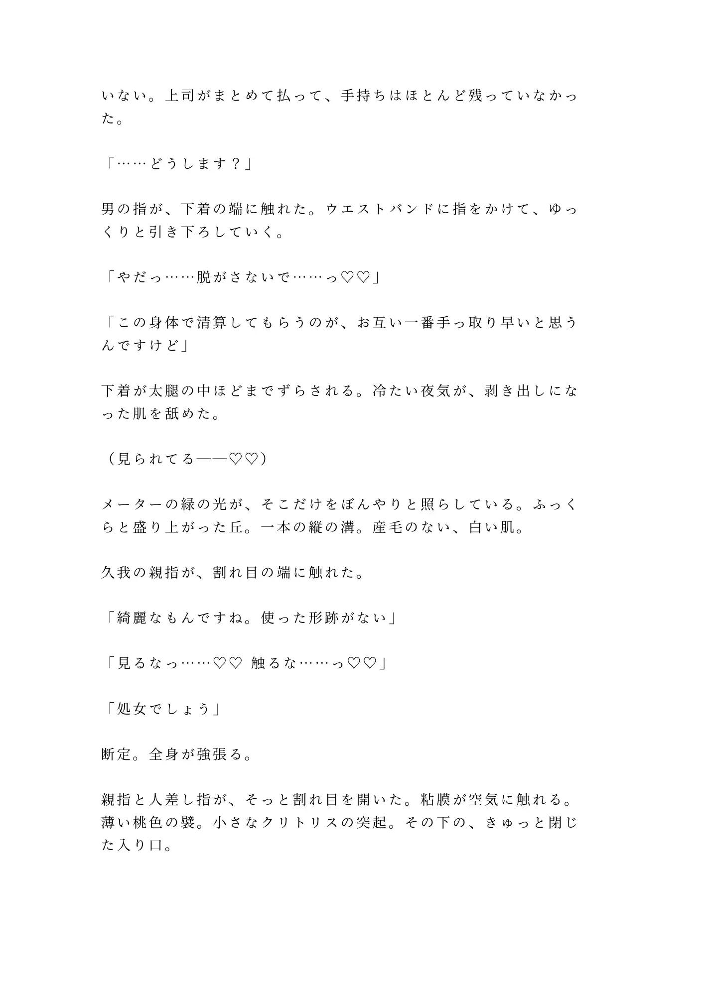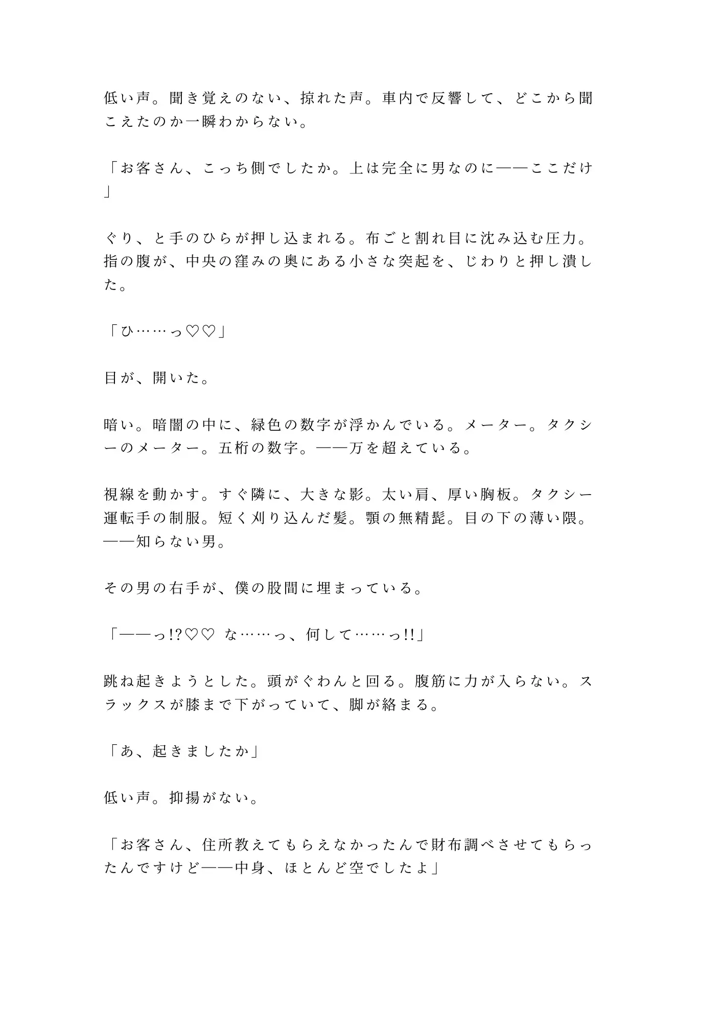 歓迎会帰り、終電を逃して乗ったタクシー。泥酔して後部座席で寝落ちした先に待っていたのは、住所も言えない客の財布を調べ、ついでにカントまで見つけた無愛想な運転手・久我。チャイルドロックで閉じ込められた暗い車内。メーターは万を超えている。「この身体で清算してもらうのが手っ取り早い」。酔いで力の入らない身体を布越しの愛撫で覚醒させられ、クリトリスだけで初めてのアクメに堕とされる。
