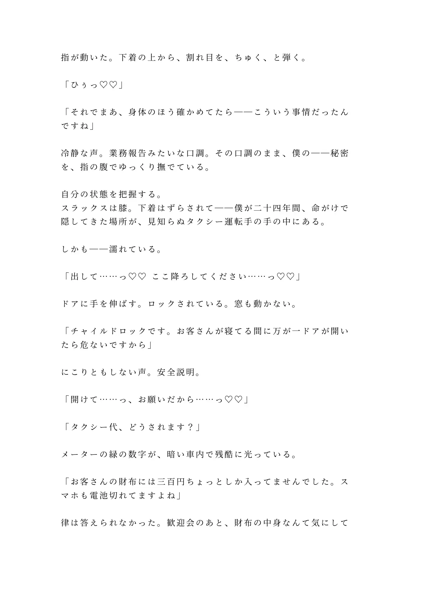 BL/カントボーイ/タクシー/運転手/後部座席/チャイルドロック/中出し/密室/執着/泥酔