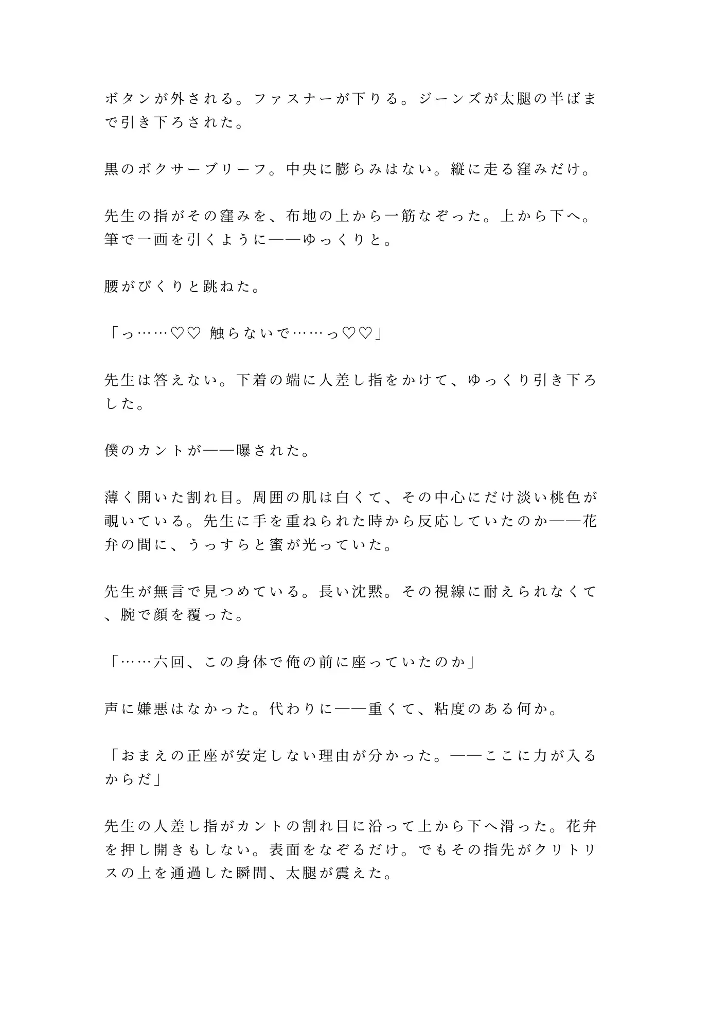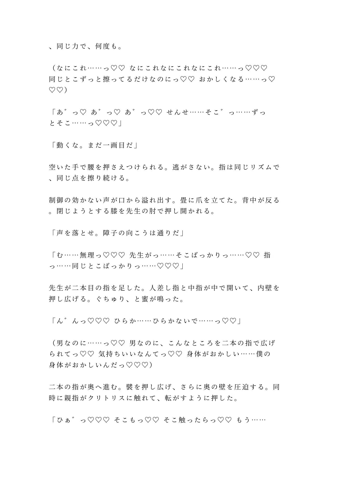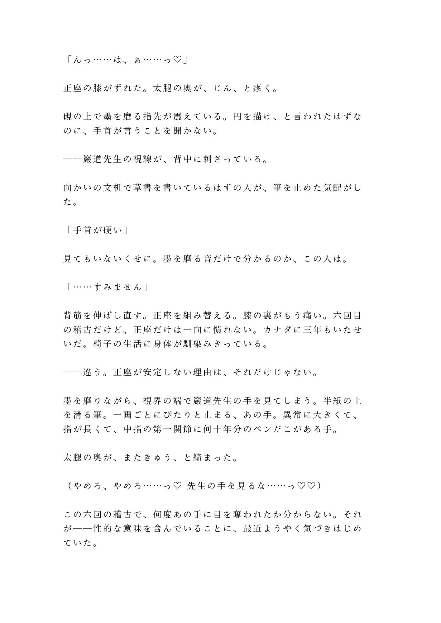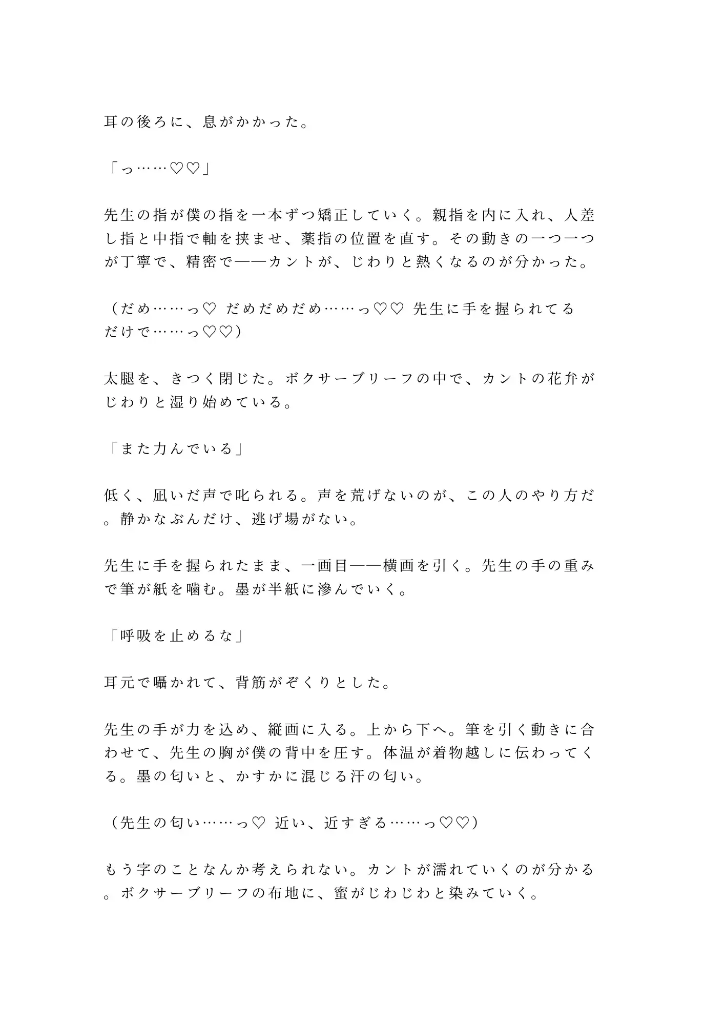 書道教室の個人稽古。六回目。巖道先生の大きな手が僕の筆を矯正するたび、カントがじわりと湿る。ペンだこのある指、墨の匂い、耳のすぐ後ろにかかる息。六回分、先生の手を見るたびにカントを濡らしていた。正座が崩れて先生の膝の上に倒れ込んだ瞬間、太腿越しに全てが伝わった。「六回、この身体で俺の前に座っていたのか」。畳の上で仰向けにされ、カントの割れ目を筆で一画引くようになぞられる。書道家の指が膣内を探り、ざらついた壁を横画のリズムで正確に擦り続けて潮吹き。