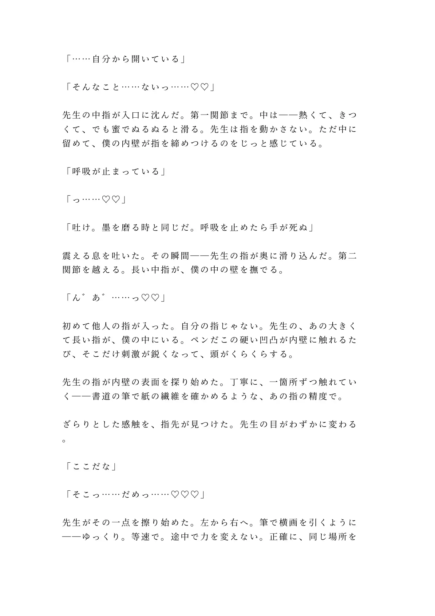 墨を含んだ筆の穂先でクリトリスを弄られ、竹の軸をカントに挿し込まれる筆プレイ。そして永字八法の一画目とともにペニスが沈む。四つん這いで筆を持たされ、一画ごとに連動するピストン。子宮に精液を注がれた身体には、先生が筆で書いた文字が残っている。