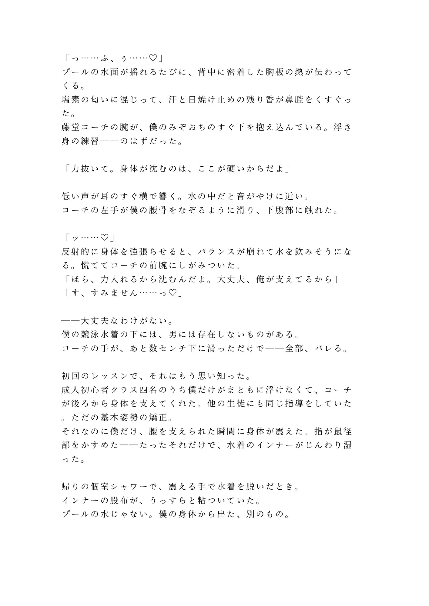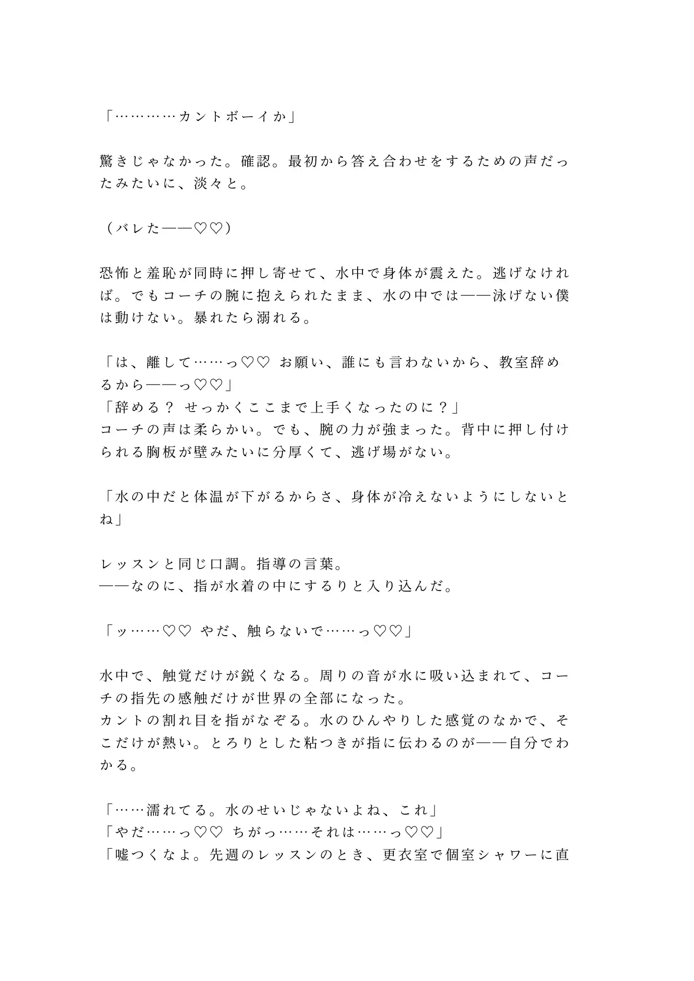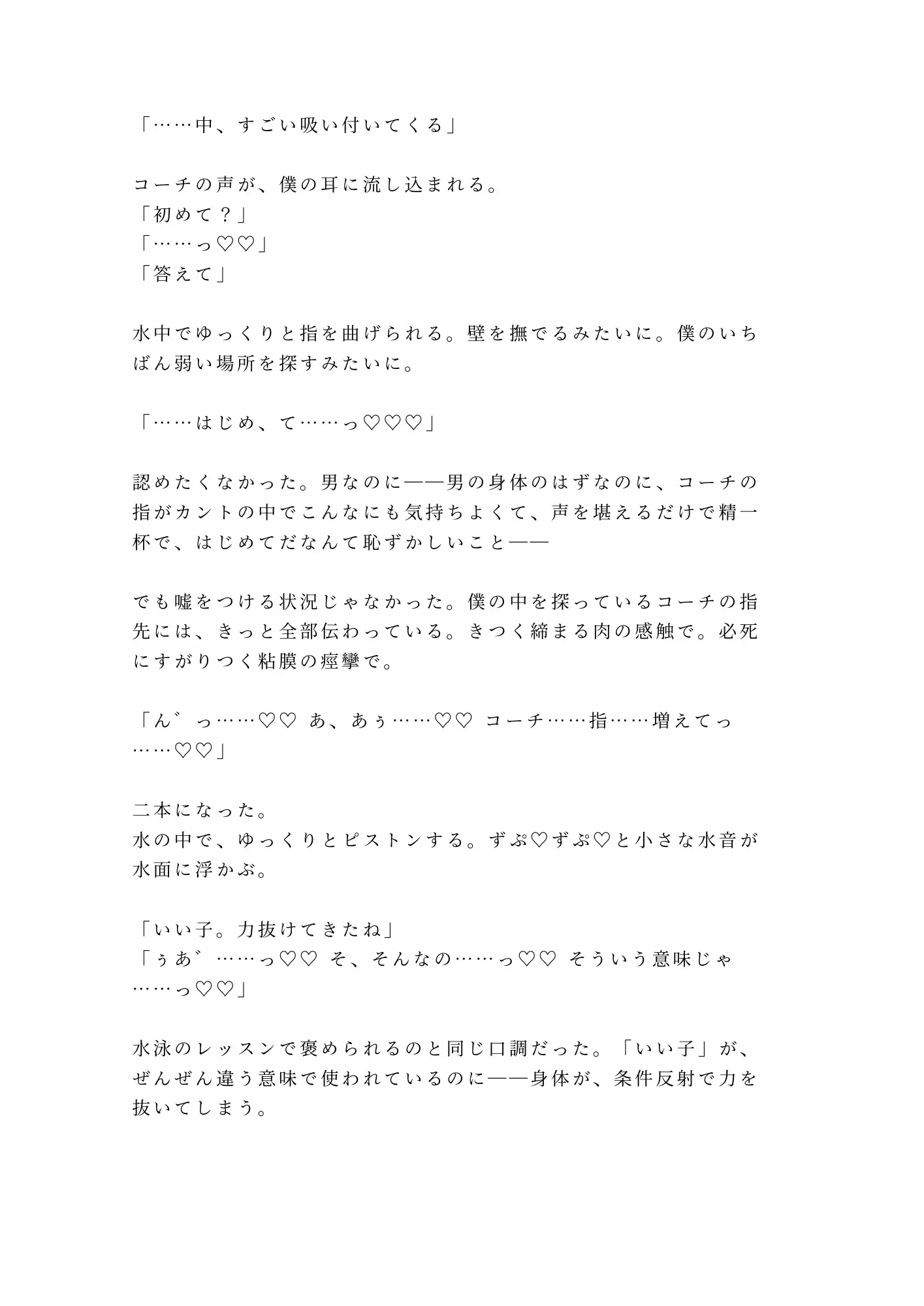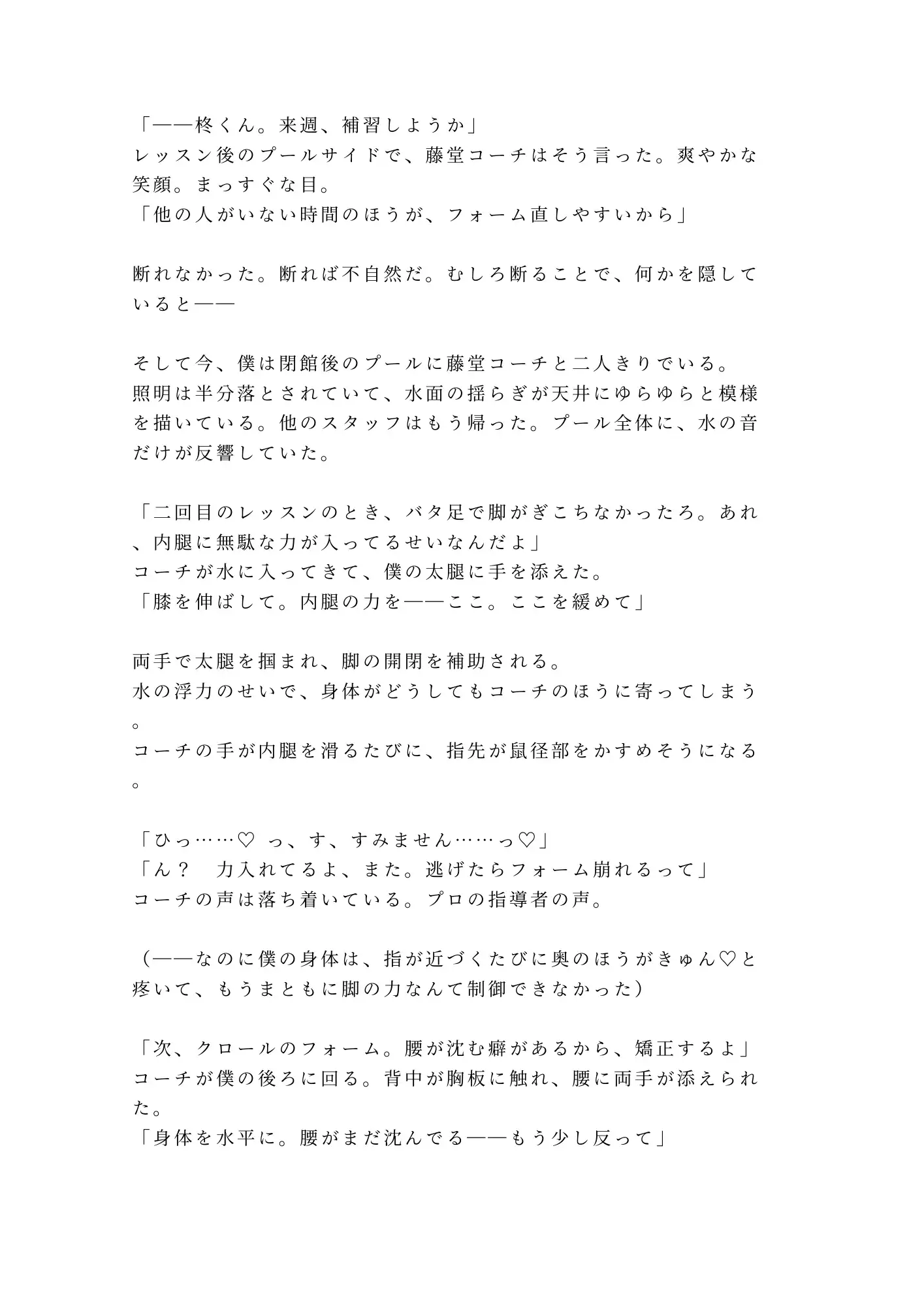 水着で隠れる位置だけにキスマークを残すコーチは、最初からすべて計算していた。毎週木曜、閉館後のプールには二人だけ。水泳教室は、もう辞められないBLカントボーイ官能小説。