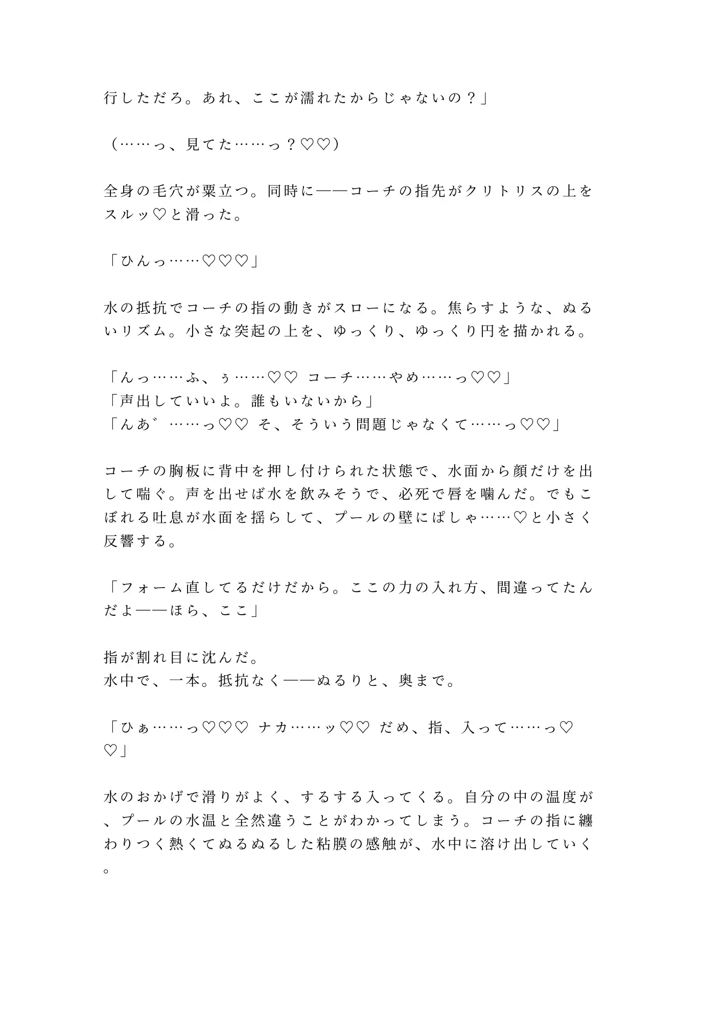 「力抜いて。俺に任せて」――何度も聞いたレッスンの言葉が、水着の中に指を滑り込ませながら繰り返される。抵抗が快感に変わる瞬間まで、コーチは完璧にプロの口調を崩さない。水中で指をねじ込まれ、プールサイドに引き上げられて舌で嬲られ、マットの上で初めてのカントに太い肉棒を受け入れさせられる。