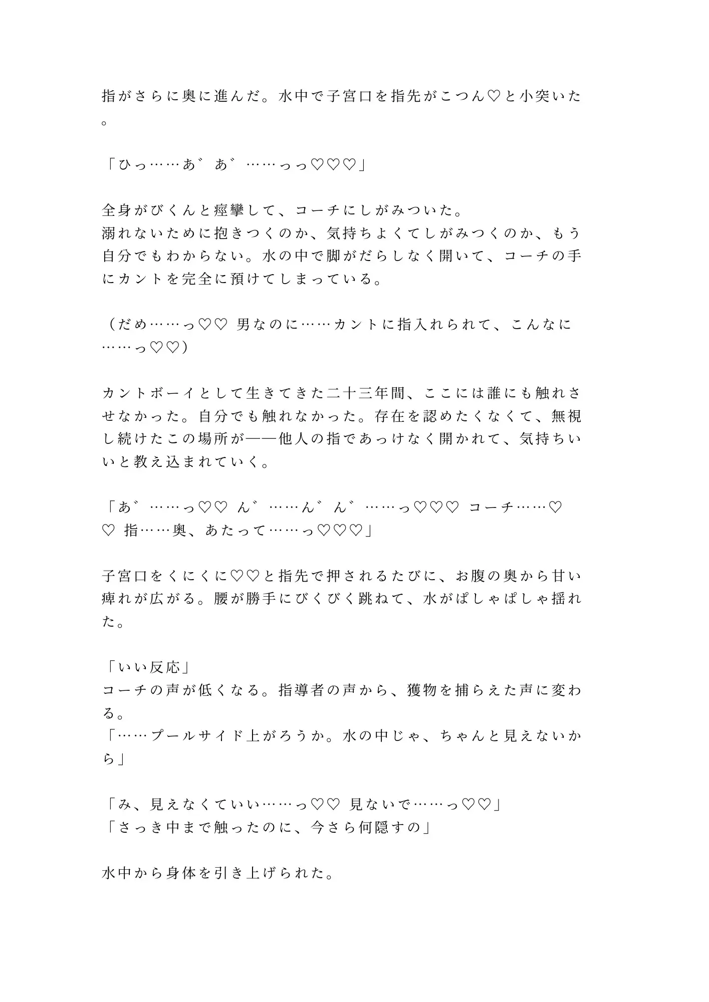 泳げないコンプレックスを克服したくて、成人水泳教室に通い始めた23歳のカントボーイ・柊。競泳水着の下に隠した秘密を、担当の藤堂コーチは初回レッスンから見抜いていた。水着越しに触れた鼠径部の違和感。レッスン後に個室シャワーへ駆け込む不自然な仕草。全部知った上で「補習しようか」と二人きりの時間を提案してくる。閉館後、照明が半分だけ灯るプール。水の浮力に逆らえない身体を背後から抱え込まれ、「フォーム矯正」の名目で内腿を揉みほぐされる。逃げようにも泳げない。コーチの腕にしがみつくしか選択肢がない。