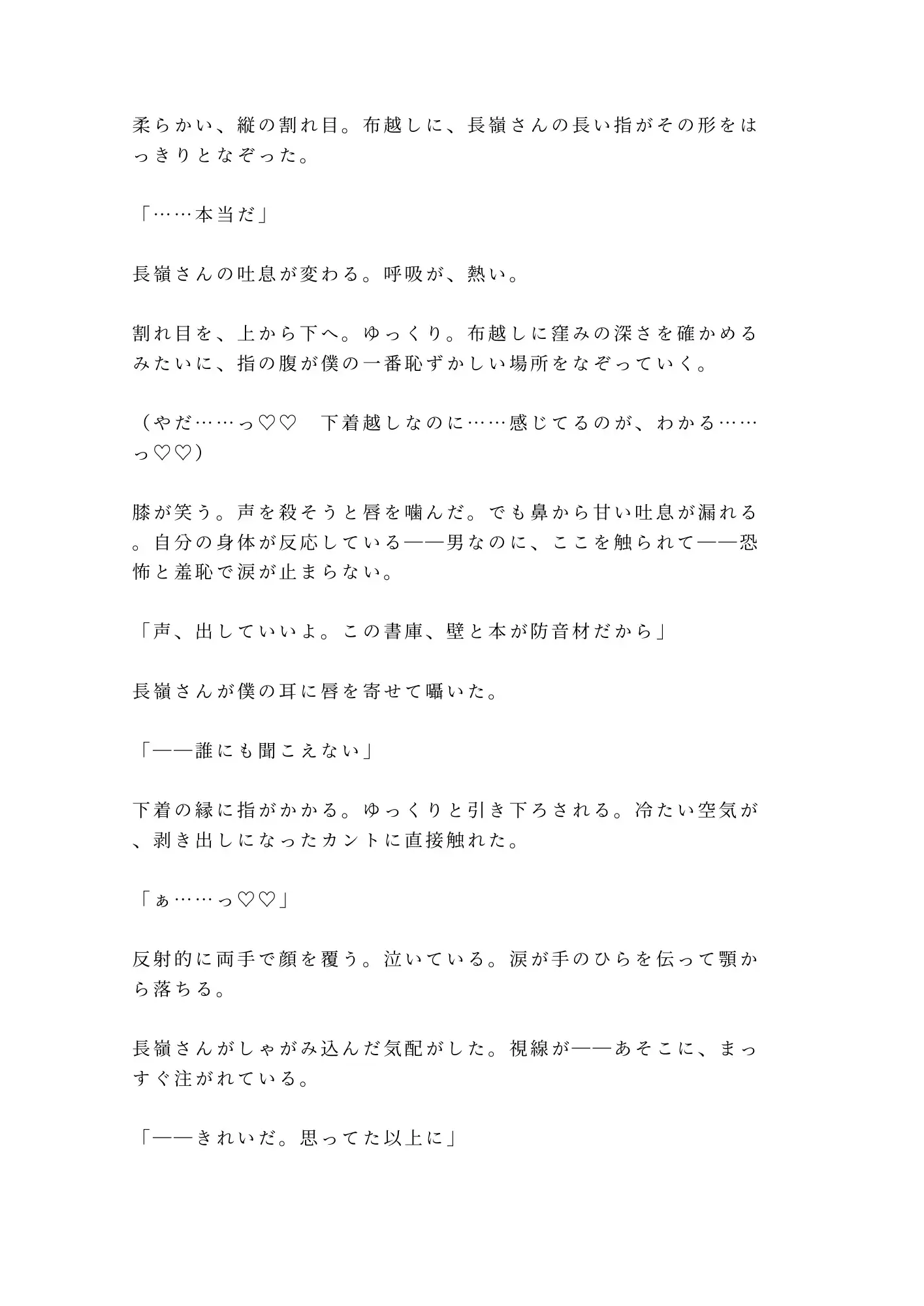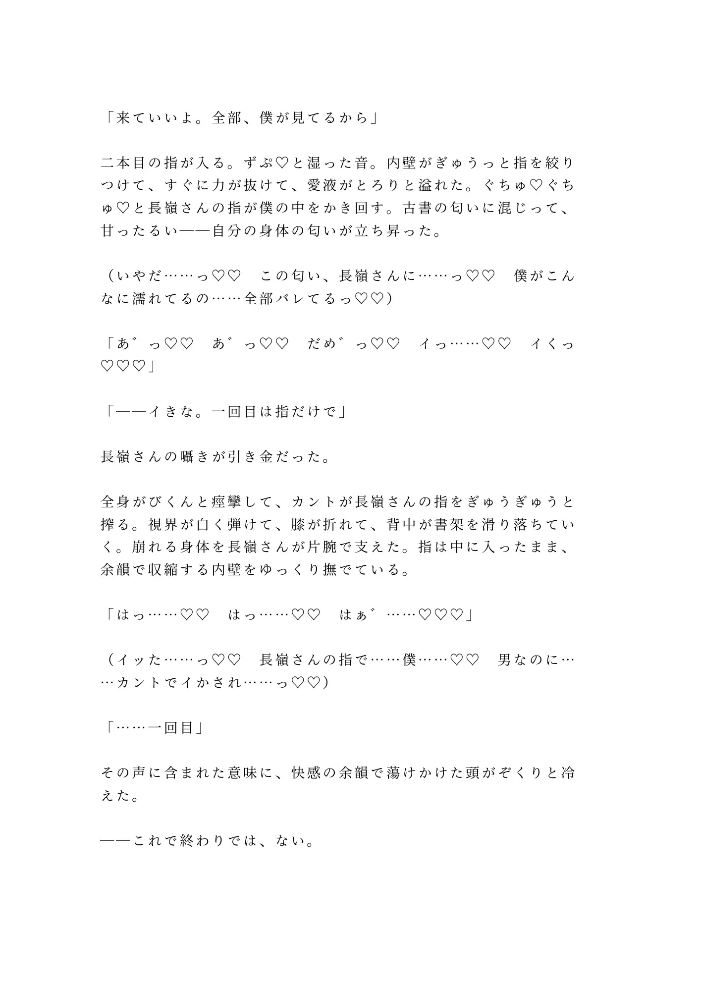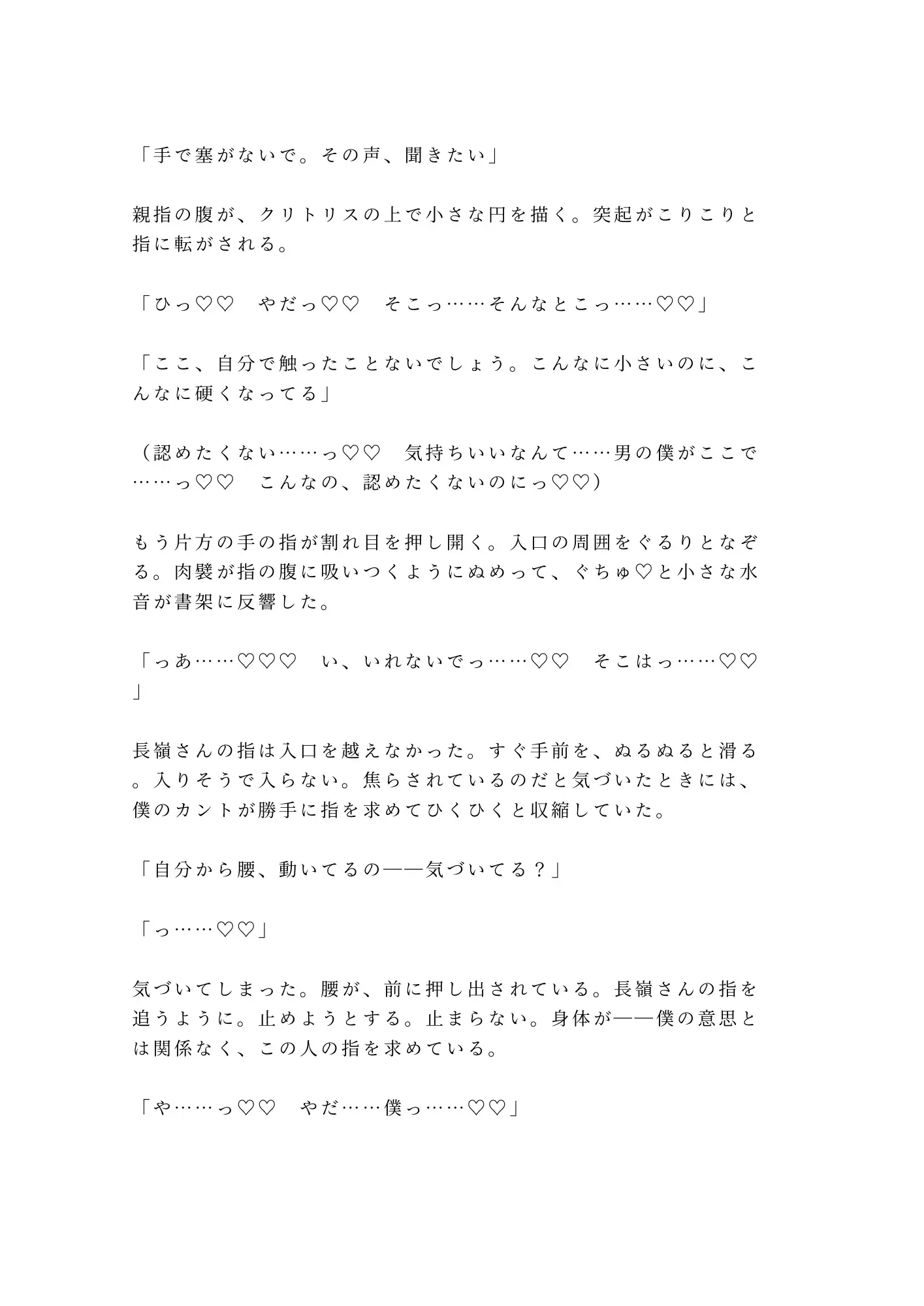 半年間、毎日閉館まで大学図書館に通い詰める大学院生・都築透。修士論文のためにリクエストし続けた閉架資料の向こう側で、銀縁の丸眼鏡の司書・長嶺宗真はすべてを観察していた。トイレは必ず個室。座るときは膝をぴったり閉じる。半年分の違和感が、脚立から落ちた都築の腰を抱いた瞬間に確信に変わる。「カントボーイだよね、都築さん」——防犯カメラの死角、閉館5分前。朝まで開かない書庫の鍵が閉まった。書架と身体のあいだに挟まれ、古書のページを繰るような手つきで一枚ずつ衣服を剥がされる。重い書架を毎日動かしてきた腕力に抵抗は無意味。割れ目をなぞる指、クリトリスを転がす親指、Gスポットを掻き上げる中指——司書の丁寧さで、隠し続けた身体が暴かれていく。