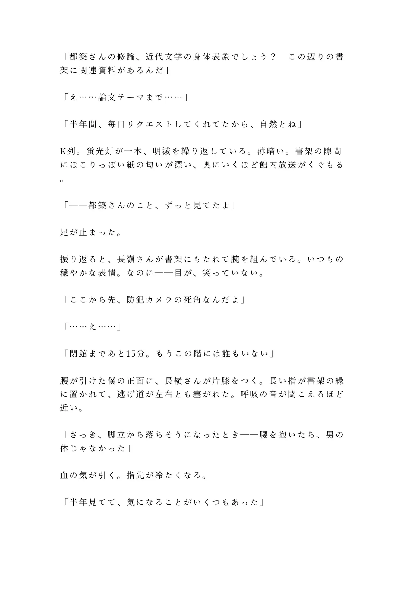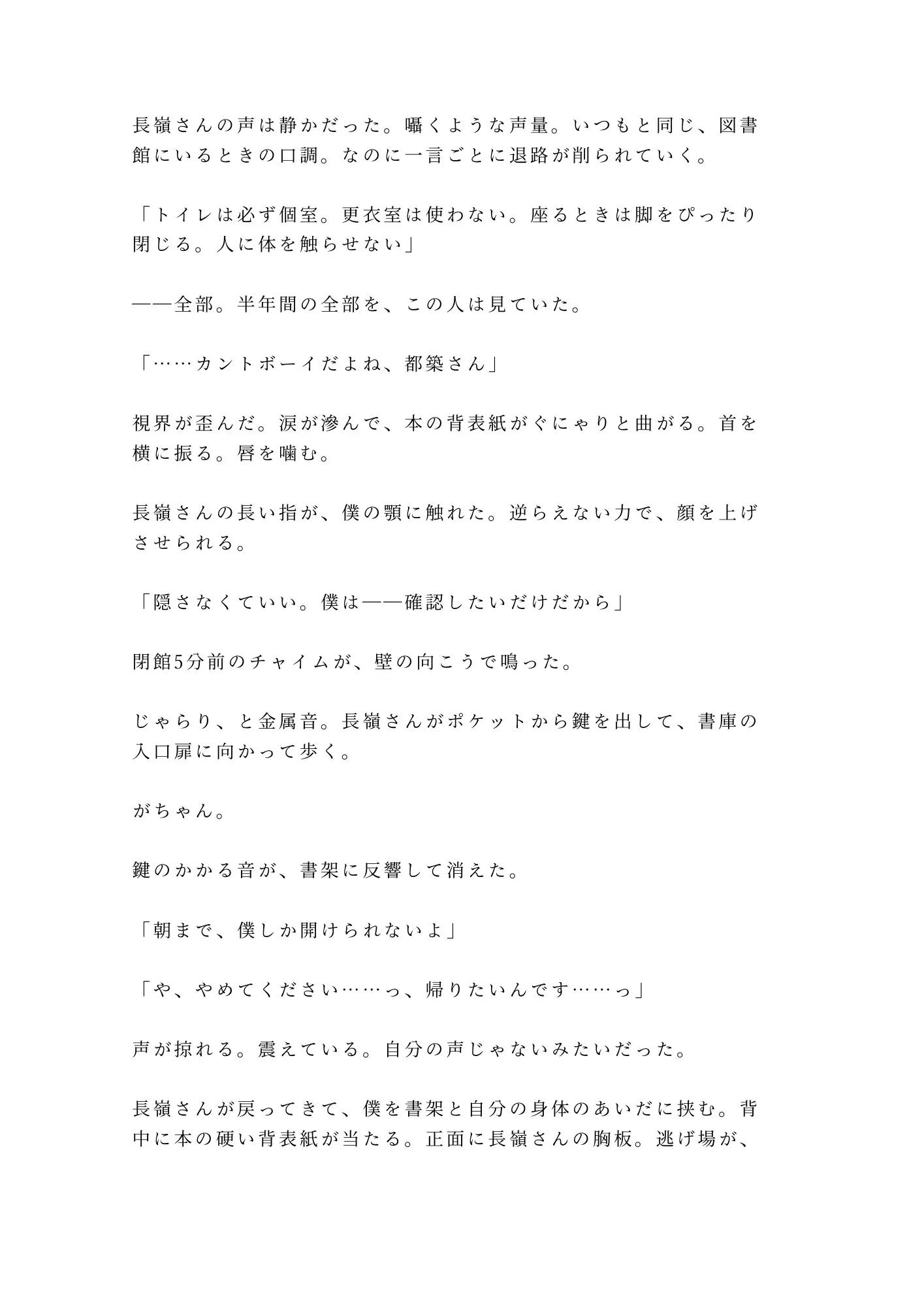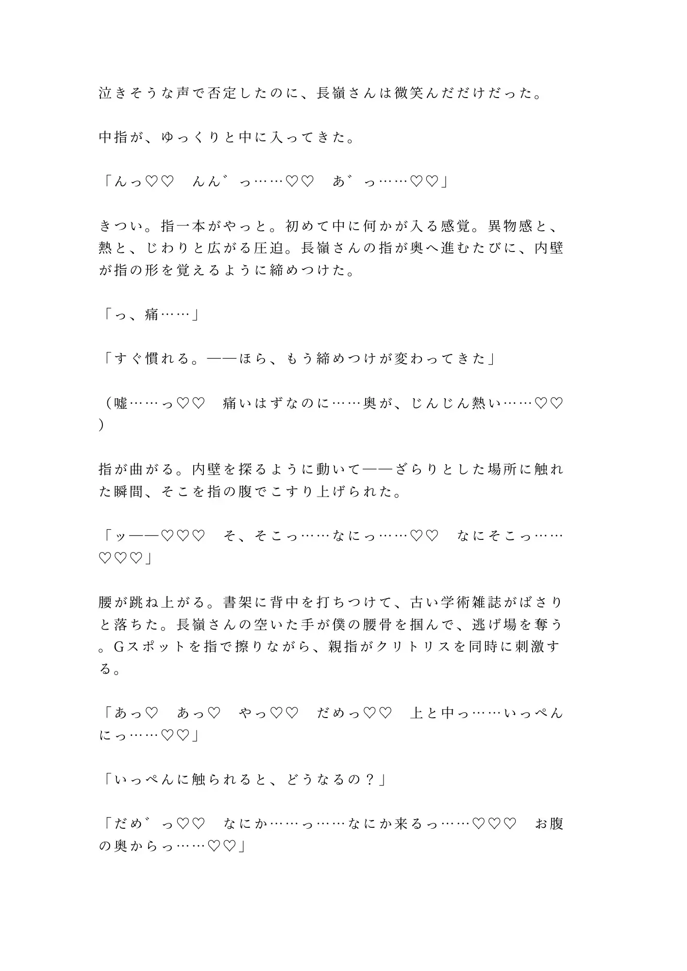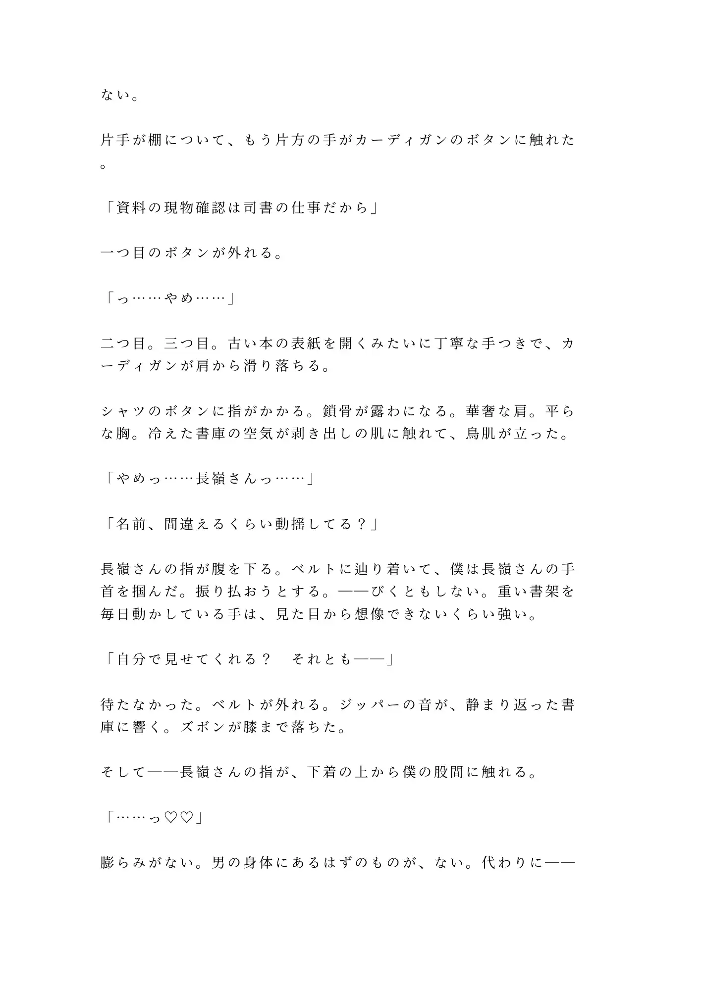 半年間、毎日閉館まで大学図書館に通い詰める大学院生・都築透。修士論文のためにリクエストし続けた閉架資料の向こう側で、銀縁の丸眼鏡の司書・長嶺宗真はすべてを観察していた。トイレは必ず個室。座るときは膝をぴったり閉じる。半年分の違和感が、脚立から落ちた都築の腰を抱いた瞬間に確信に変わる。「カントボーイだよね、都築さん」——防犯カメラの死角、閉館5分前。朝まで開かない書庫の鍵が閉まった。書架と身体のあいだに挟まれ、古書のページを繰るような手つきで一枚ずつ衣服を剥がされる。重い書架を毎日動かしてきた腕力に抵抗は無意味。割れ目をなぞる指、クリトリスを転がす親指、Gスポットを掻き上げる中指——司書の丁寧さで、隠し続けた身体が暴かれていく。