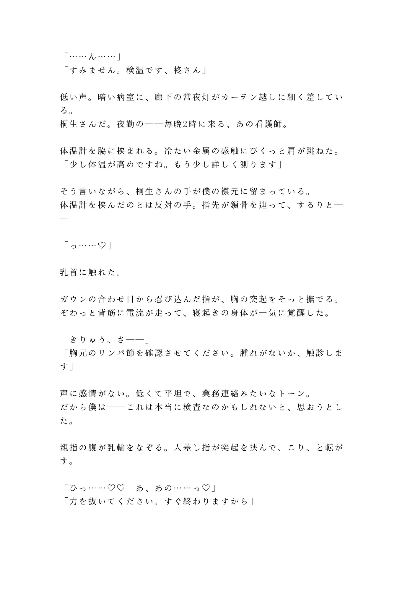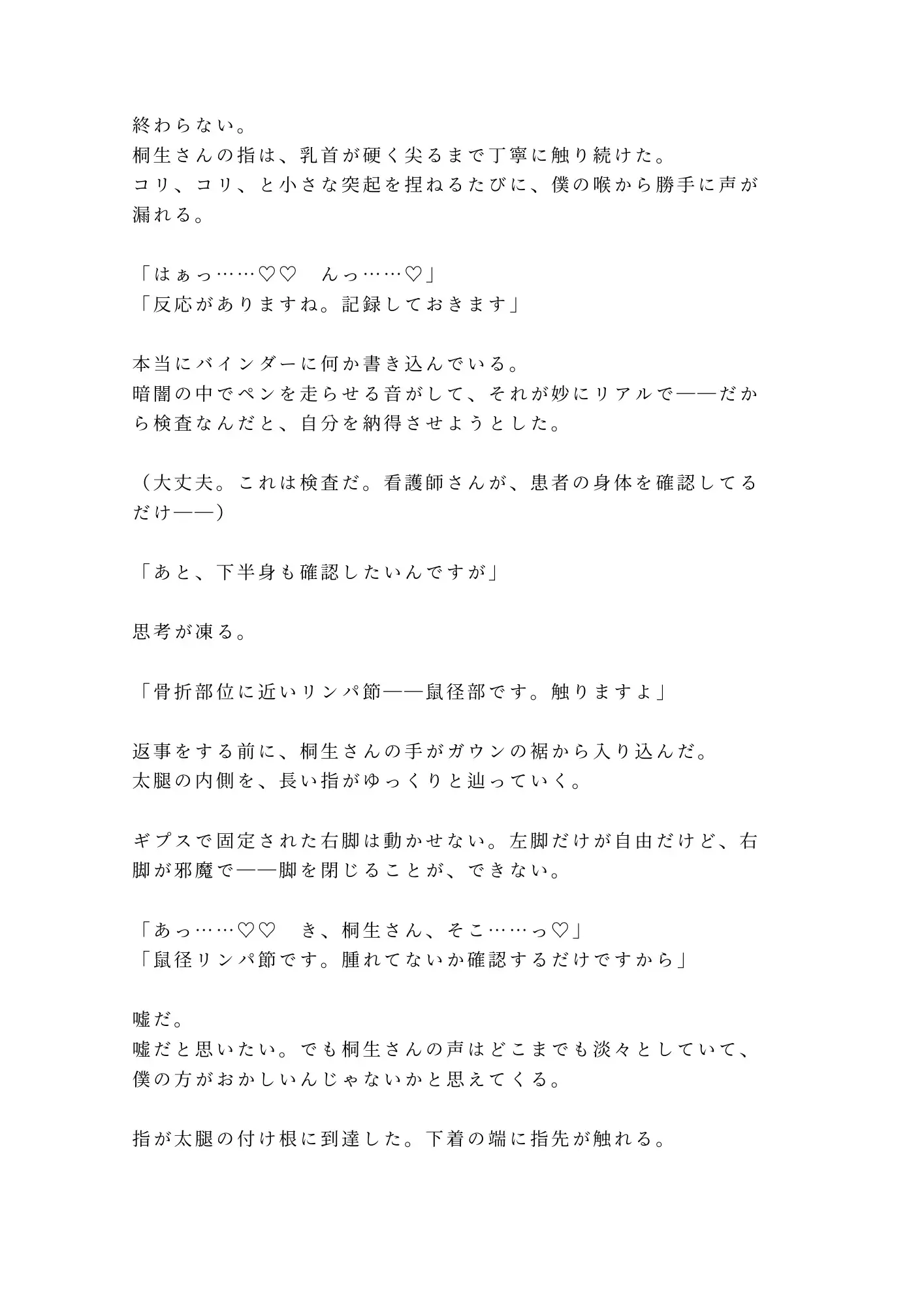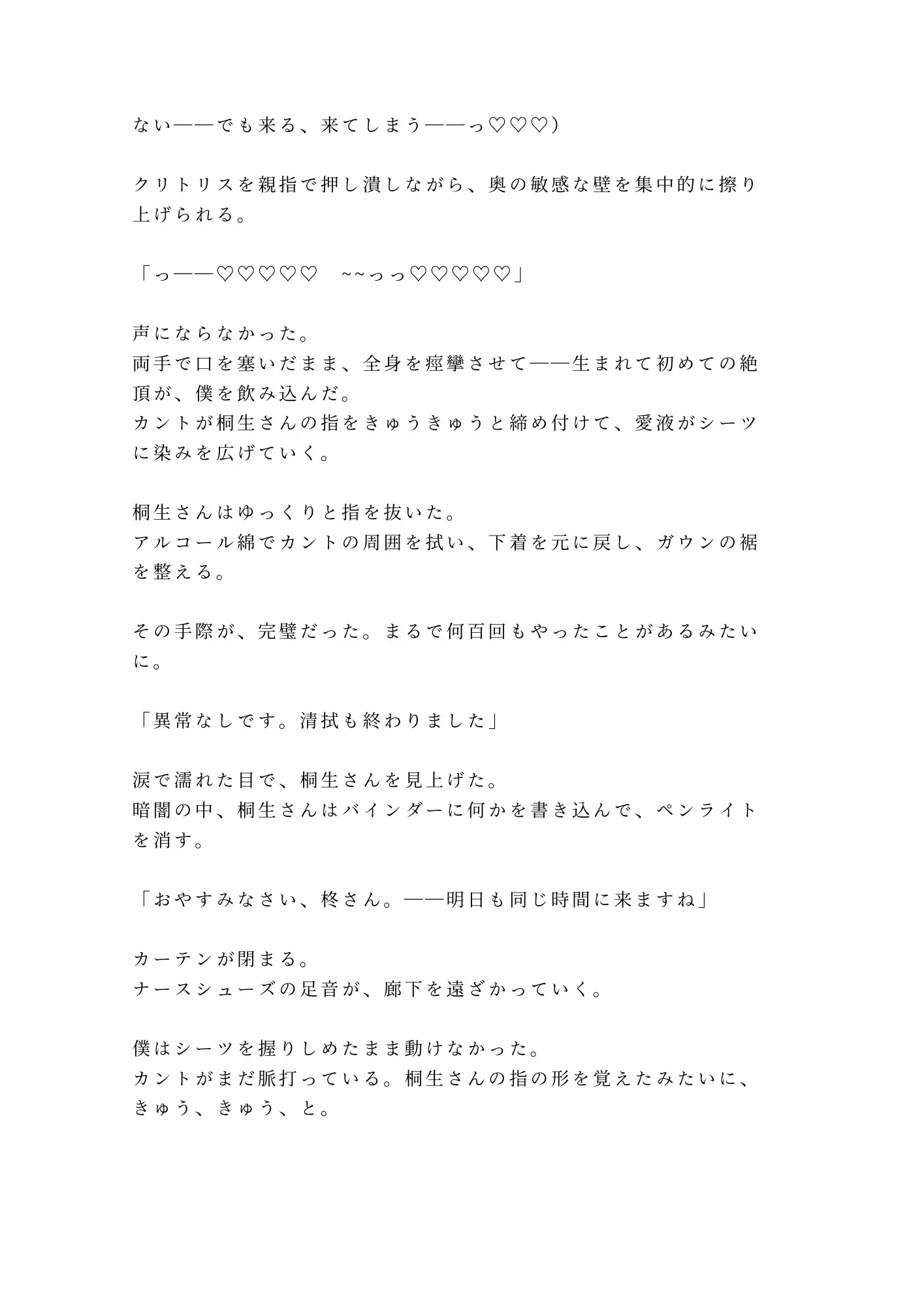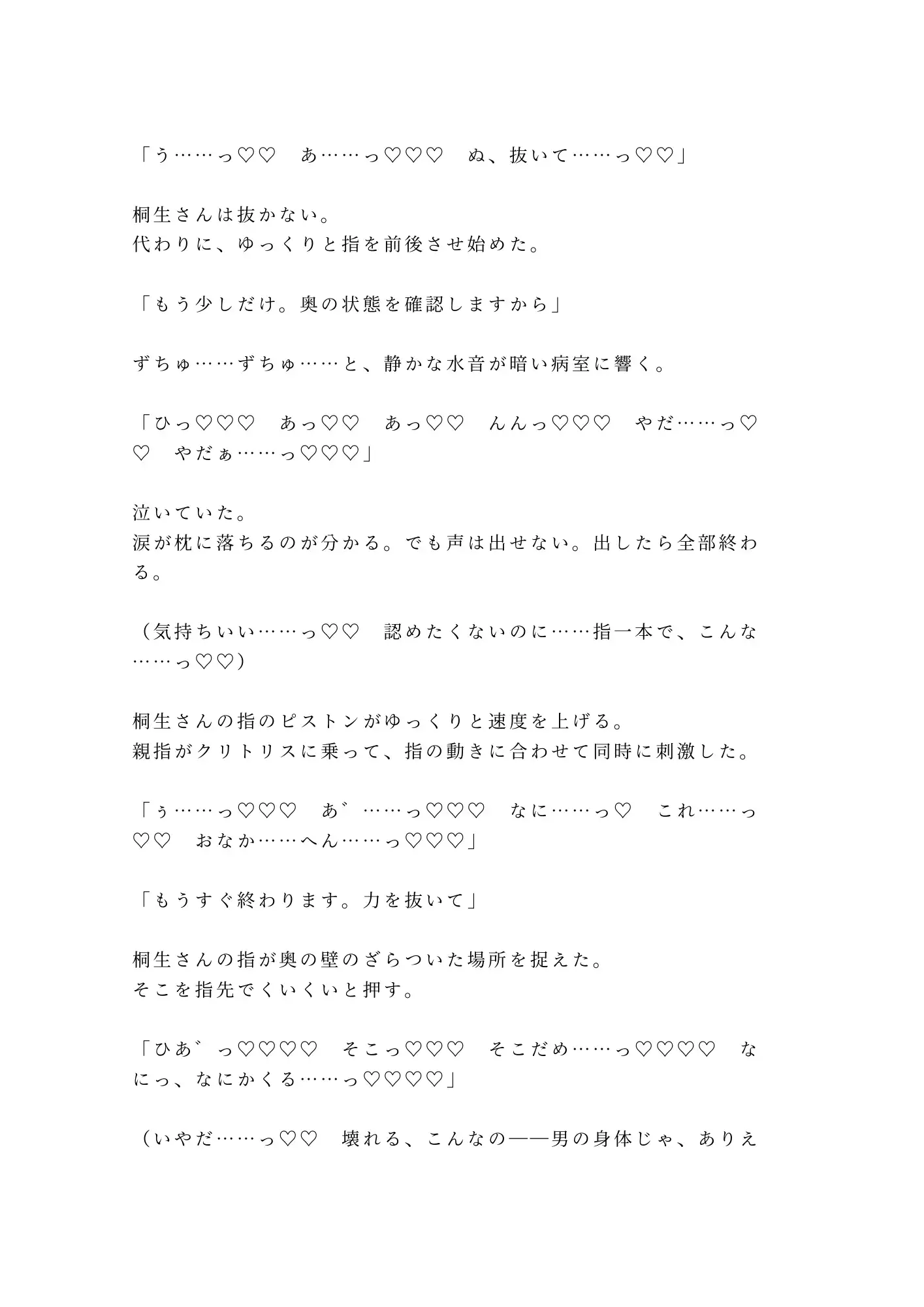 骨折で入院した病棟。毎晩深夜2時に来る夜勤の看護師・桐生蓮。検温のはずの手が乳首を転がし、鼠径リンパ節の触診と称して下着の端に指をかける。ギプスで脚を閉じられない身体の下着をずらされた瞬間、二十二年間隠し続けたカントが暴かれた。「検査」は夜ごとにエスカレートする。初日は指一本でカントの中を探られ、声を殺しながら初めてのアクメ。二日後は指二本でGスポットを抉られ、脈拍計で反応を読み上げられる。翌日はペンライトでカントを照らされ、クリトリスだけで潮吹き。