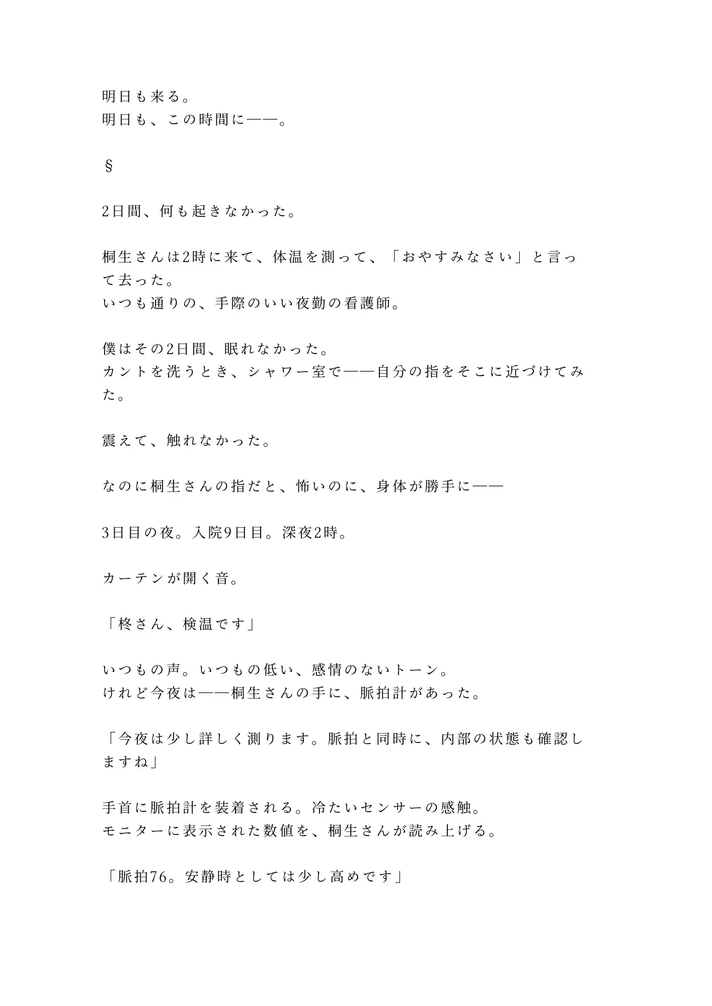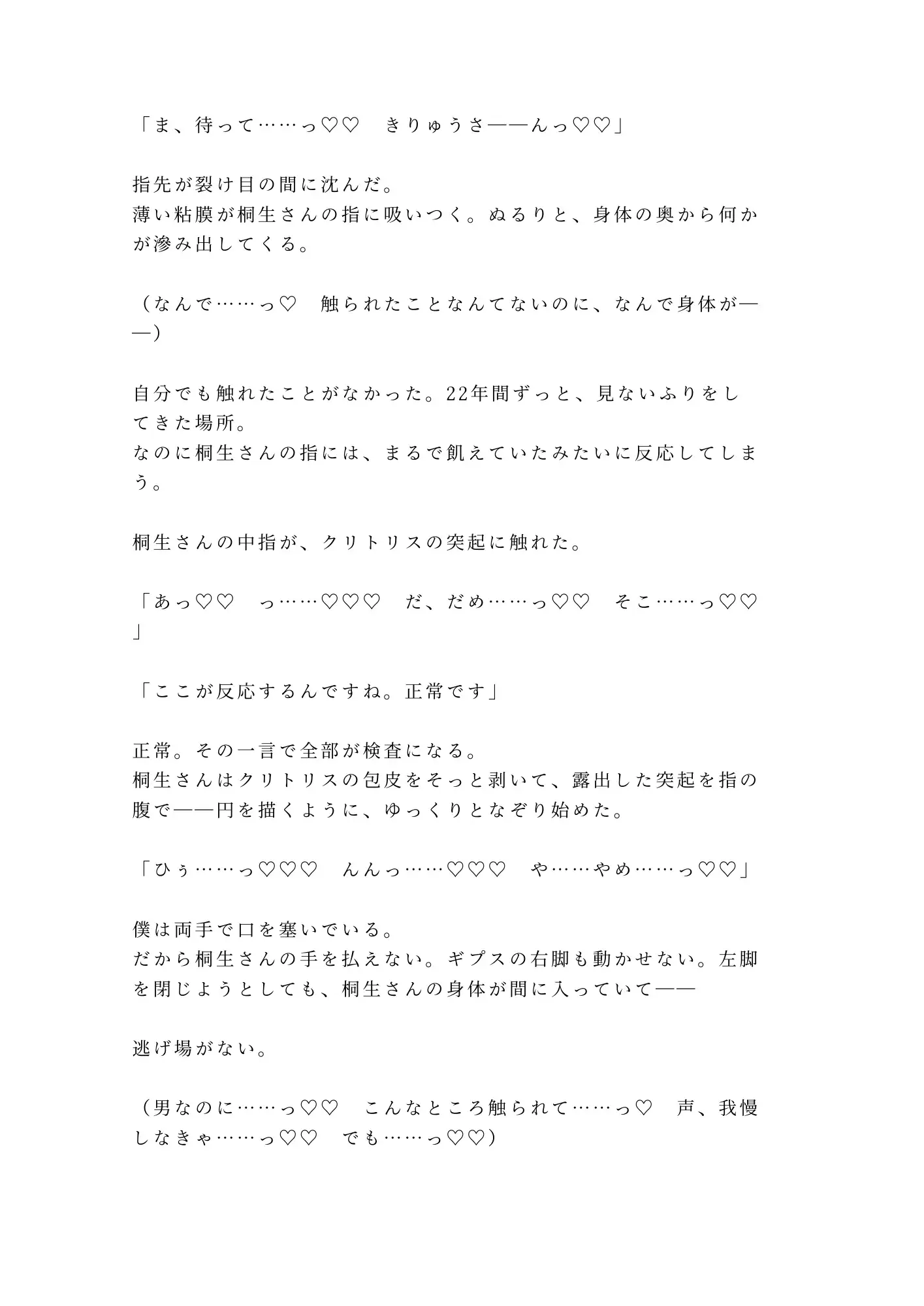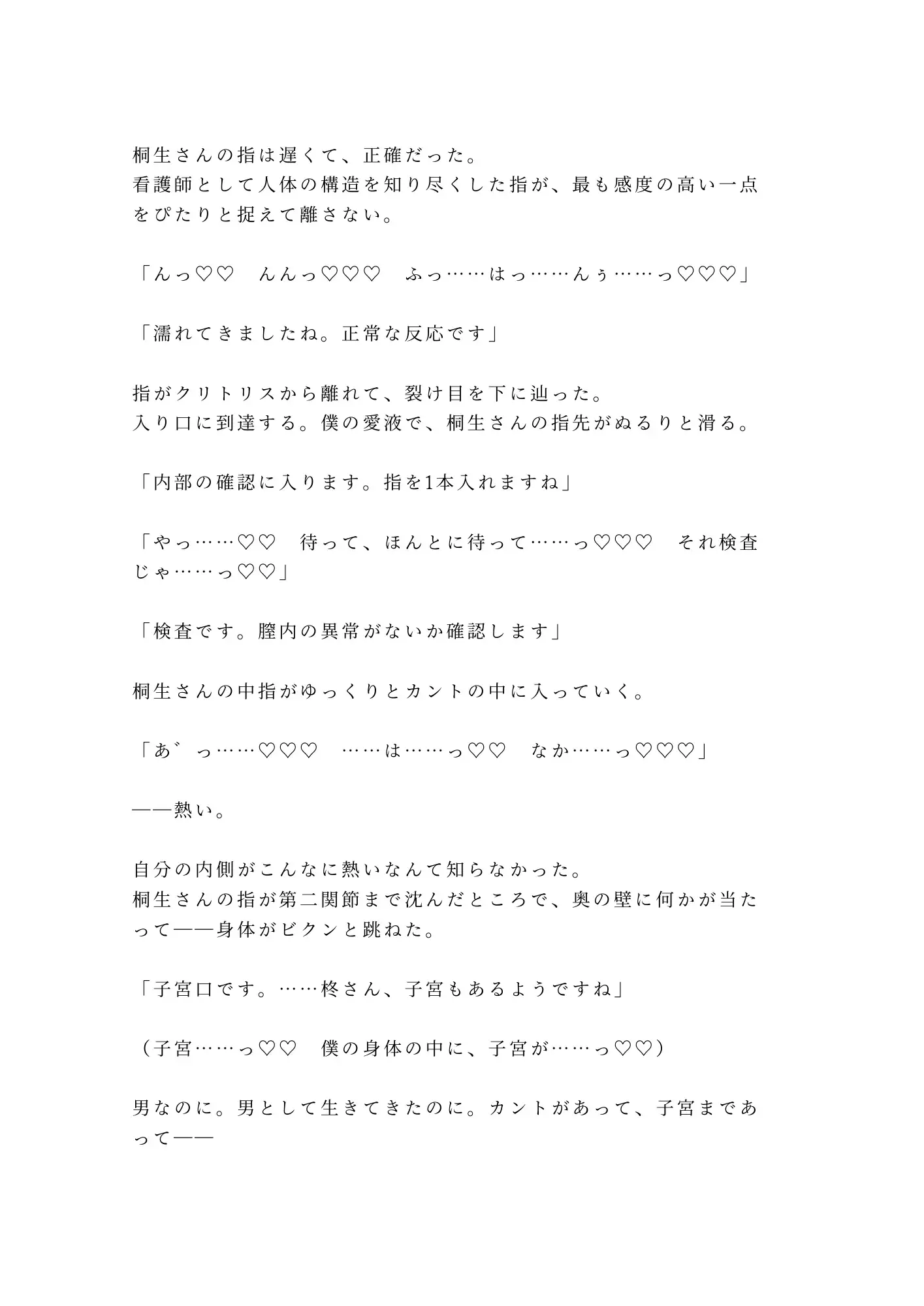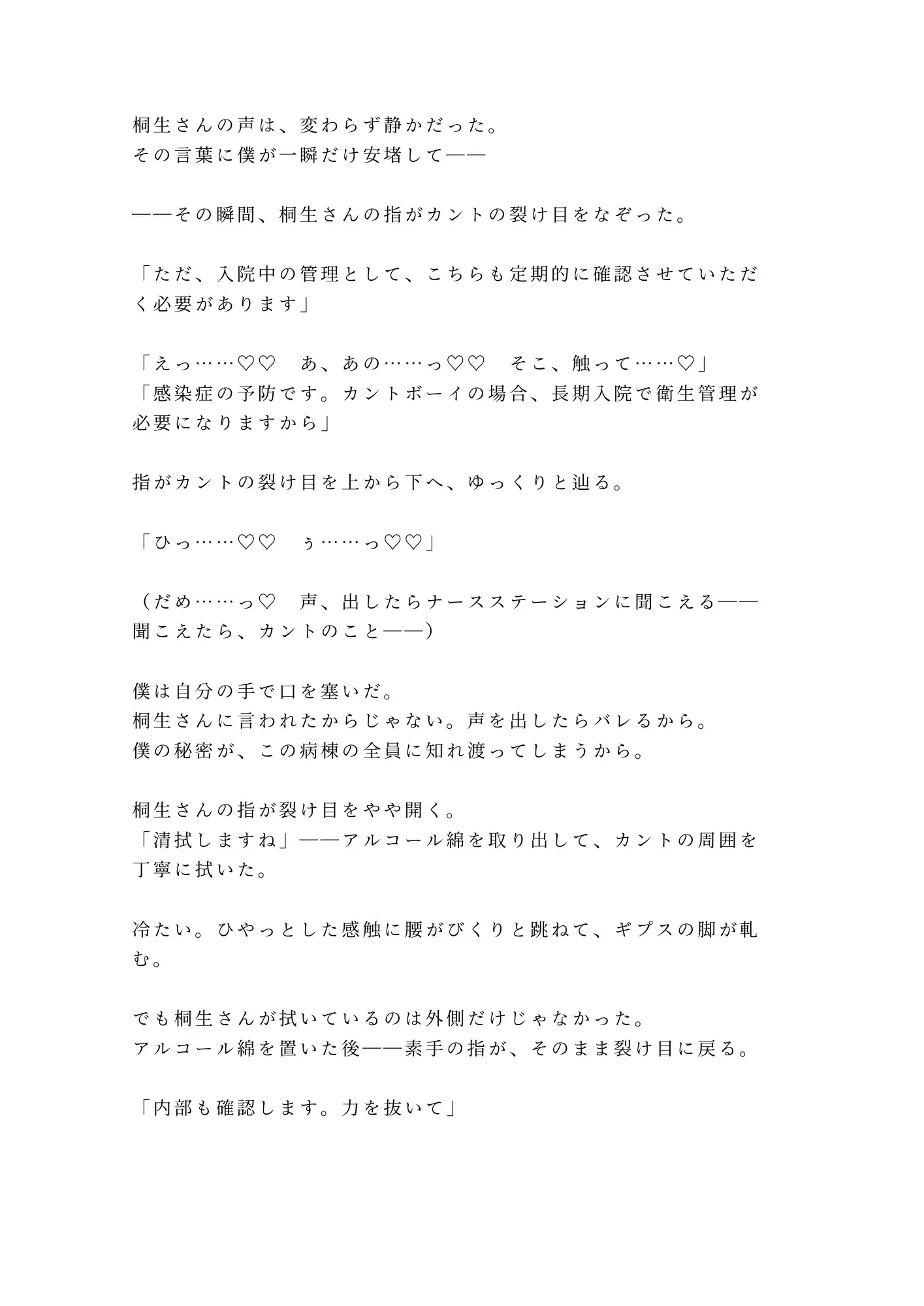 骨折で入院した病棟。毎晩深夜2時に来る夜勤の看護師・桐生蓮。検温のはずの手が乳首を転がし、鼠径リンパ節の触診と称して下着の端に指をかける。ギプスで脚を閉じられない身体の下着をずらされた瞬間、二十二年間隠し続けたカントが暴かれた。「検査」は夜ごとにエスカレートする。初日は指一本でカントの中を探られ、声を殺しながら初めてのアクメ。二日後は指二本でGスポットを抉られ、脈拍計で反応を読み上げられる。翌日はペンライトでカントを照らされ、クリトリスだけで潮吹き。