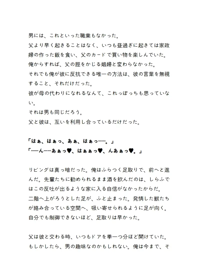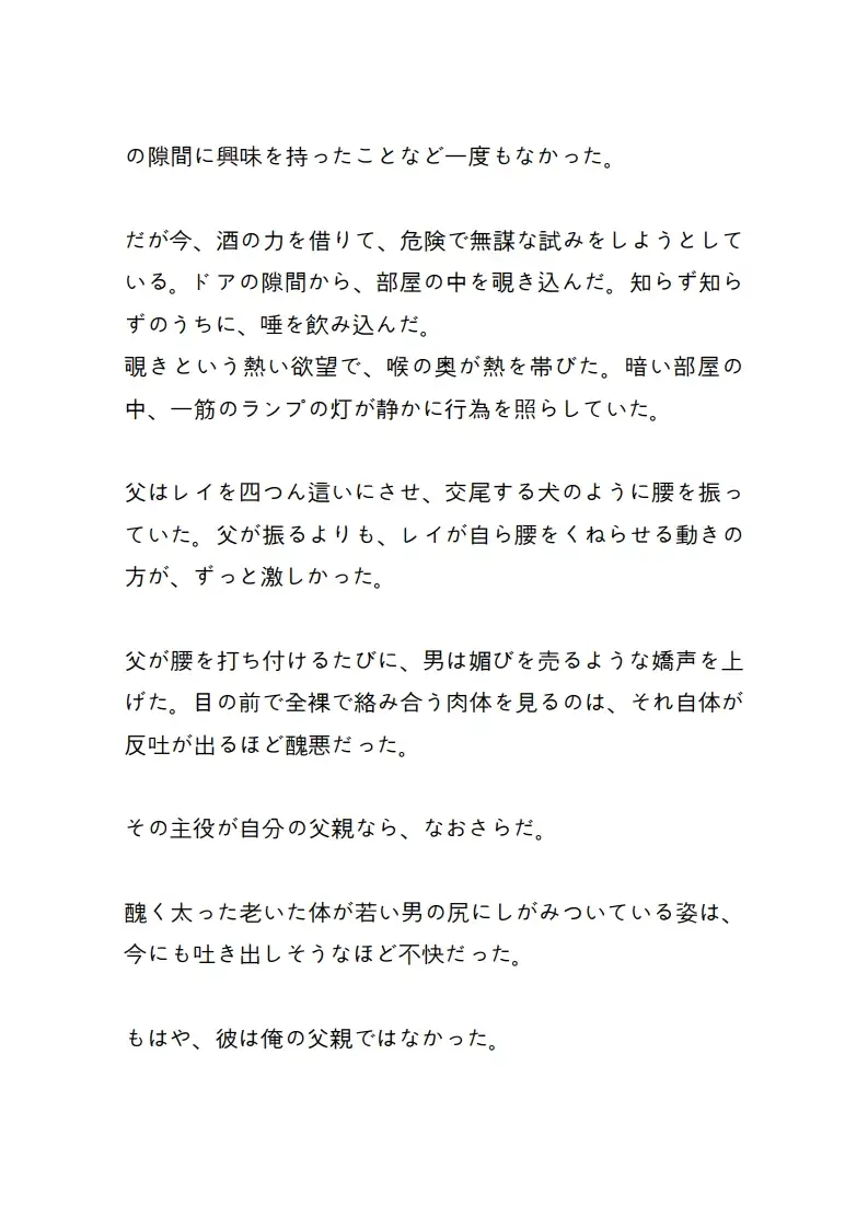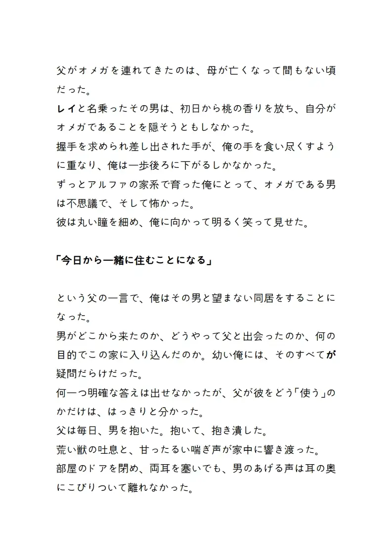 親父が最も寵愛するオメガ、レイ。 彼の秘密を暴こうとした傲慢なアルファの湊(みなと)は、 逆にレイが仕掛けた加虐的な罠に自ら足を踏み入れてしまう。赤い録画ランプが点滅するカメラの前で、 アルファとしてのプライドは無残に砕かれ、 湊は親父が欲したその熱い肉体に束縛されたまま、 己の本能を切り刻まれていく。