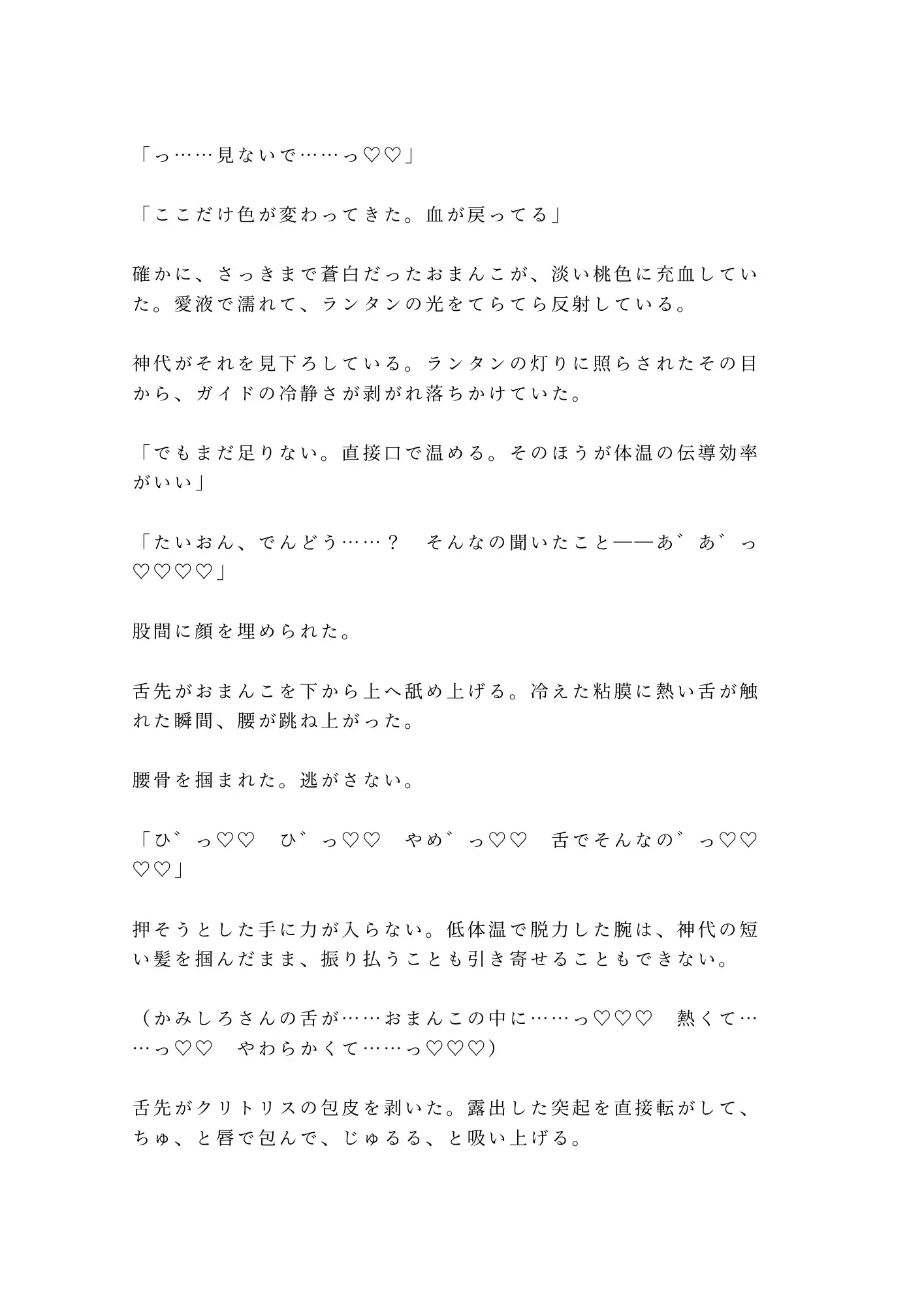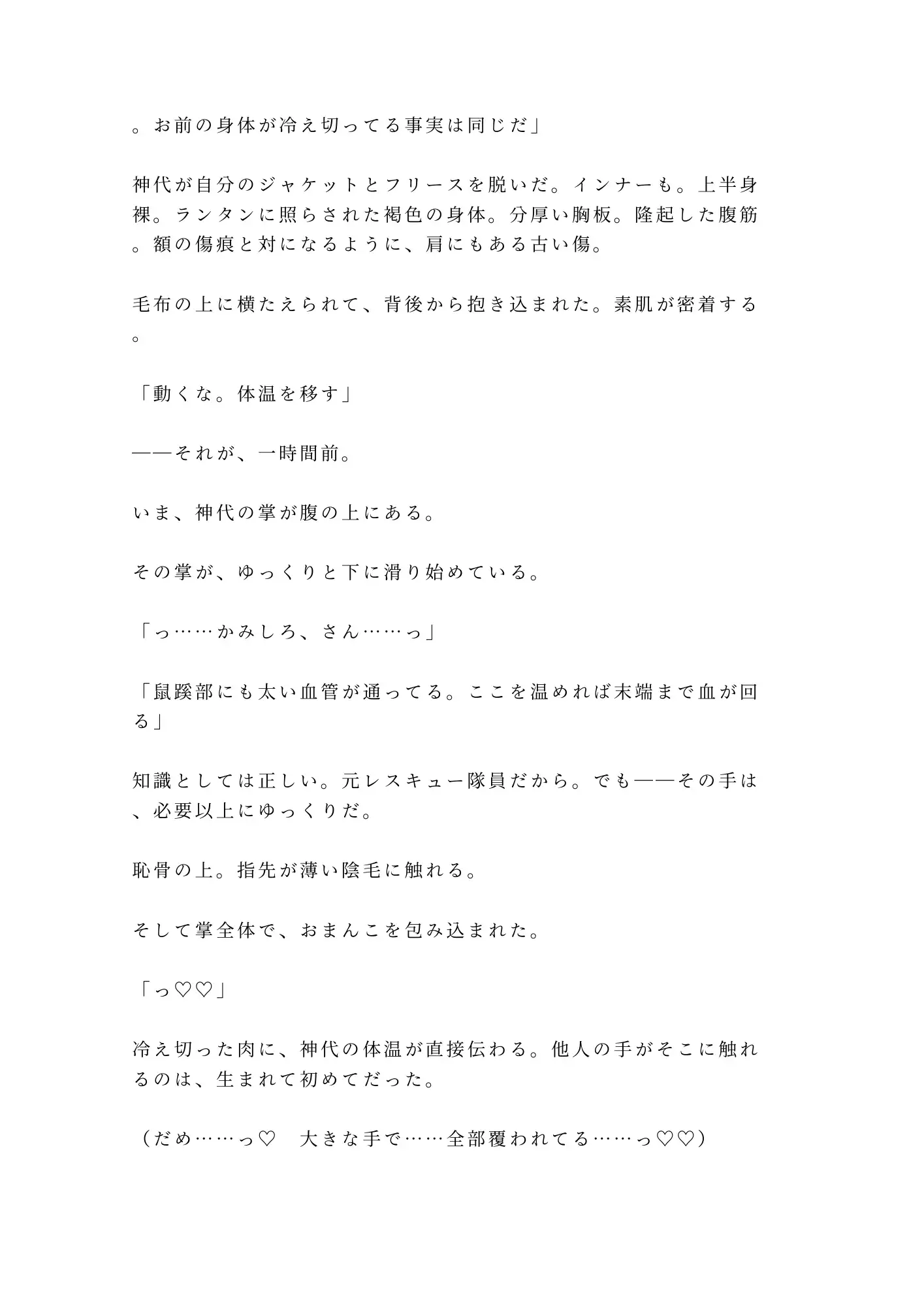 稜線の上で吹雪が襲った。他の参加者を先に下山させ、膝を壊した僕と残ったのは、山岳ガイドの神代征四郎。半ば背負われて辿り着いた四畳半の避難小屋、灯油ランタンが揺れる中、翌日の昼まで動けないと告げられる。「服を脱げ。濡れた服は体温を奪う」