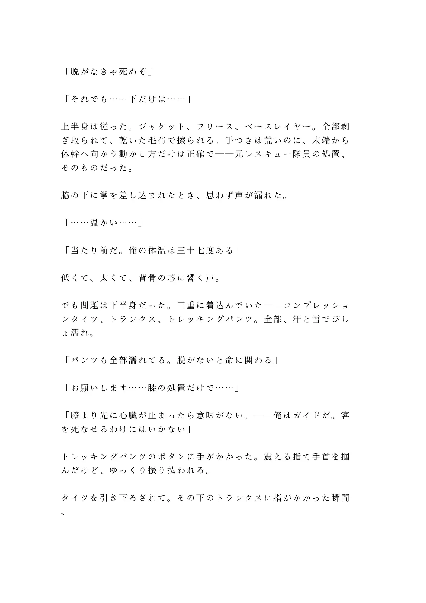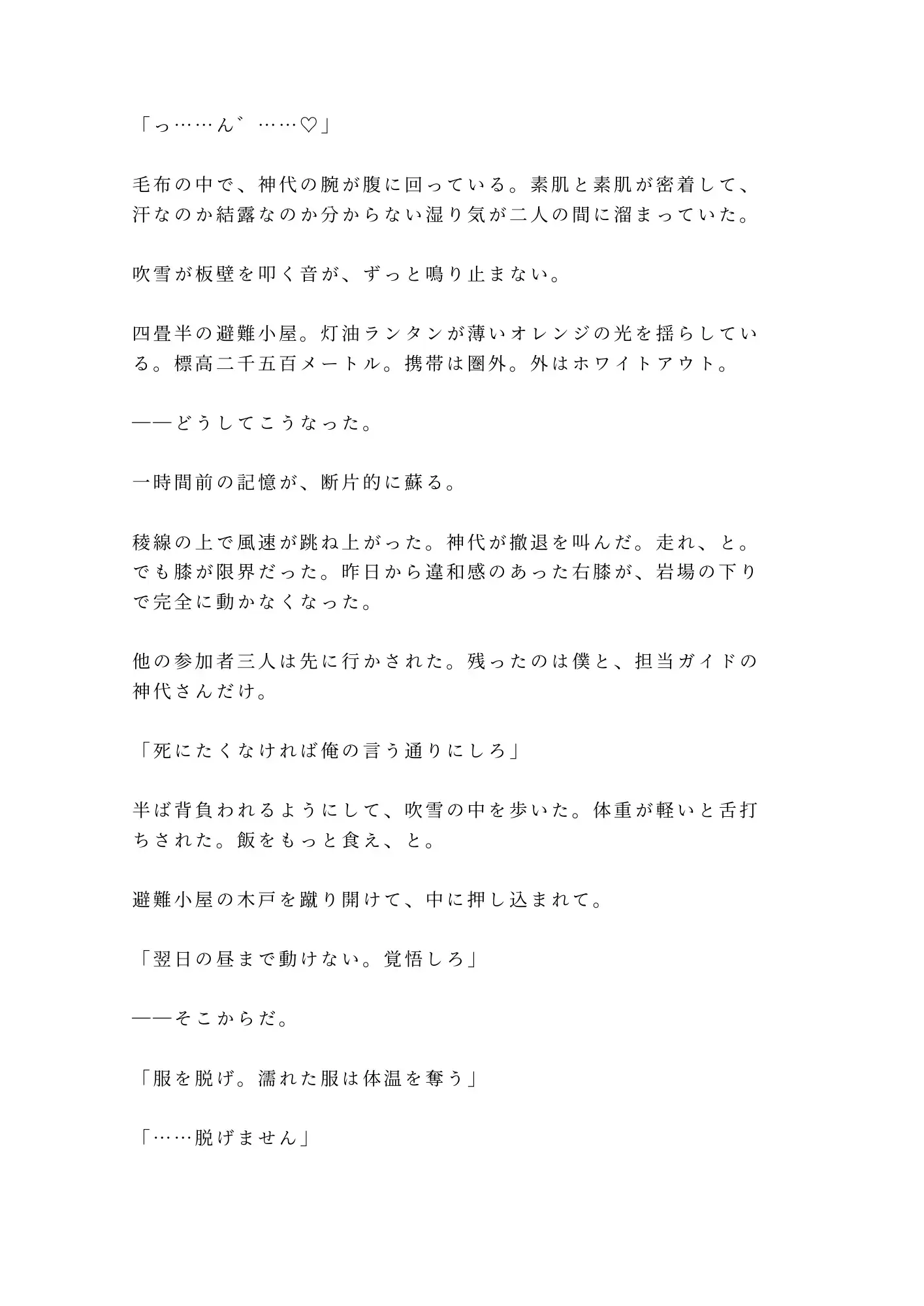 「来週も山に来い。俺のプライベートガイドで」――吹雪の避難小屋から始まる、逃げ場のない関係。