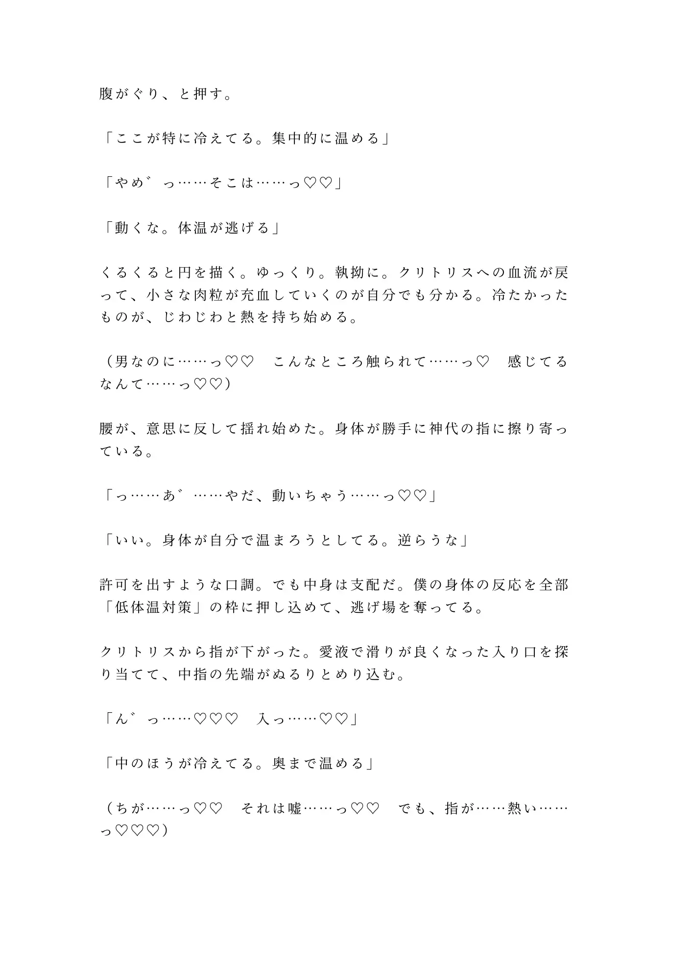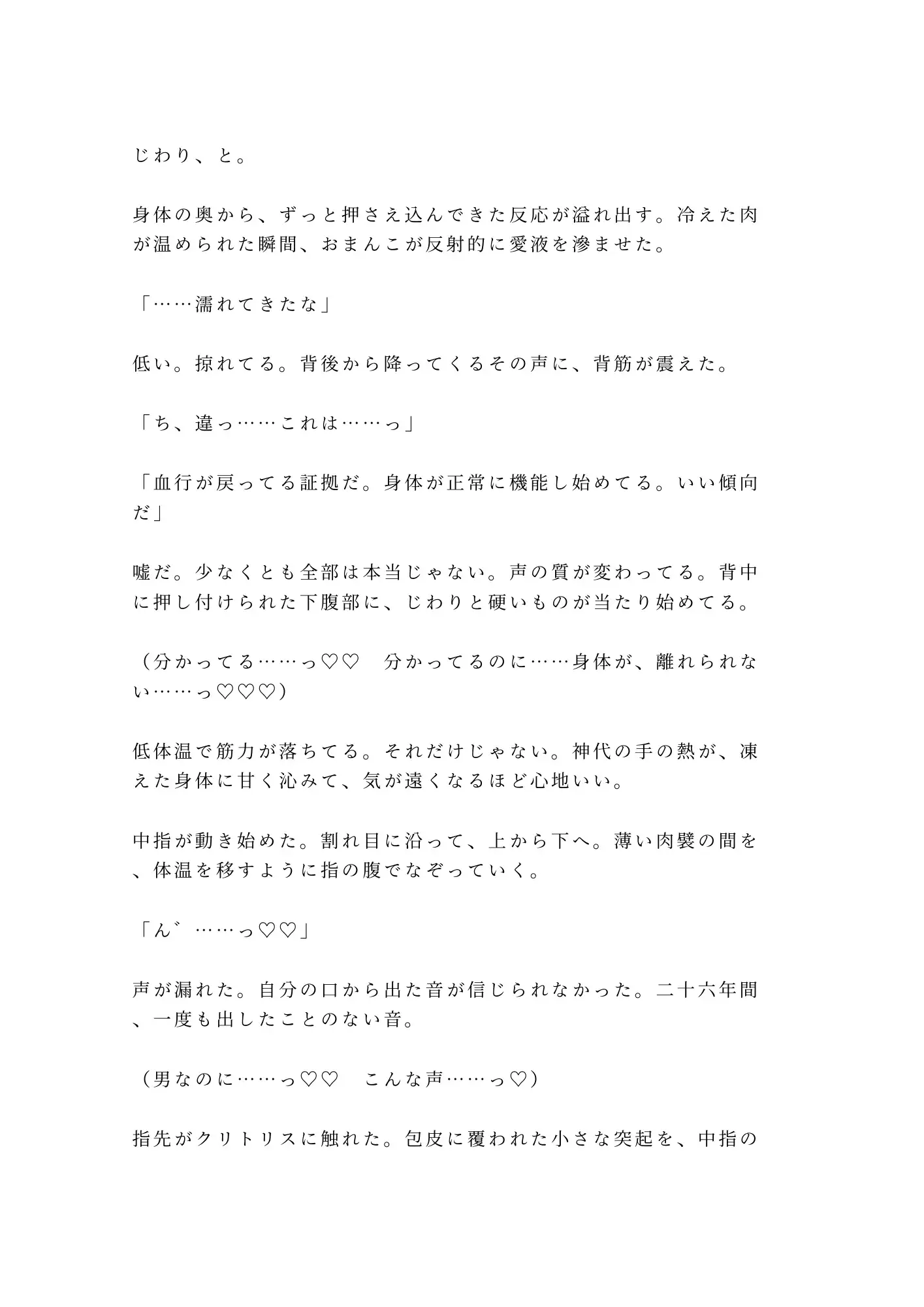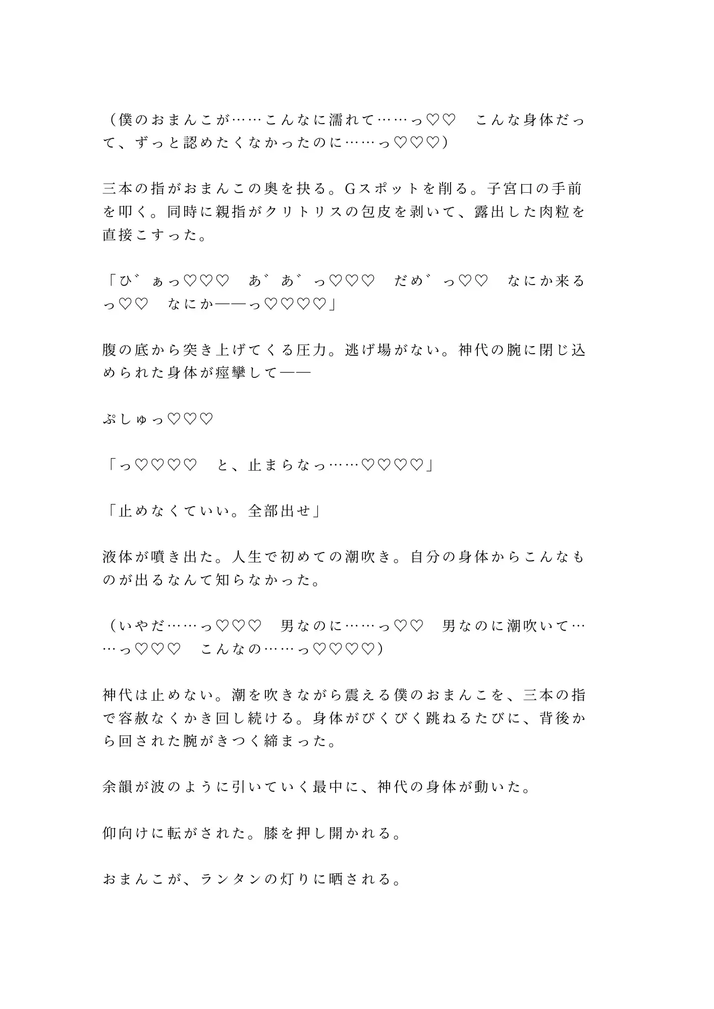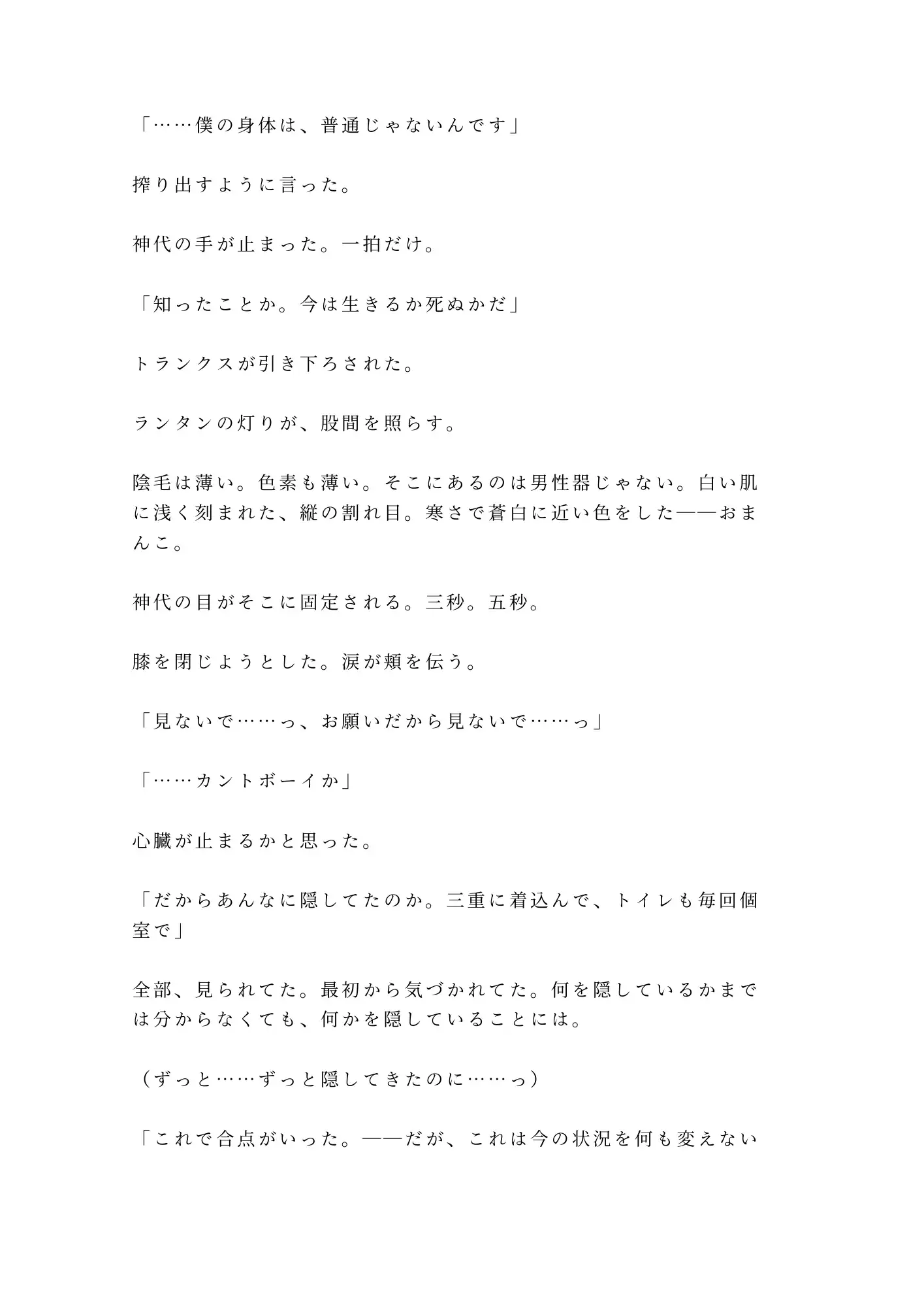 上半身は従った。だが下だけは――三重に着込んだ下着の下に隠していたカントを、見せるわけにはいかない。しかし神代は容赦なくトランクスまで引き下ろす。ランタンに照らされた股間に、男性器の代わりにあったのは縦の割れ目。