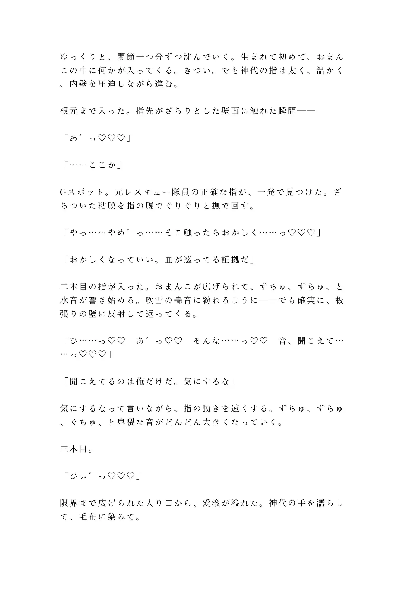 体温を移すと称して素肌を密着させ、「鼠蹊部の太い血管を温める」と言いながらカントを掌で包み込む。冷え切った肉に体温が伝わった瞬間、身体が勝手に濡れ始める。元レスキュー隊員の正確な指がGスポットを一発で見つけ出し、初めての潮吹きを強いられる。