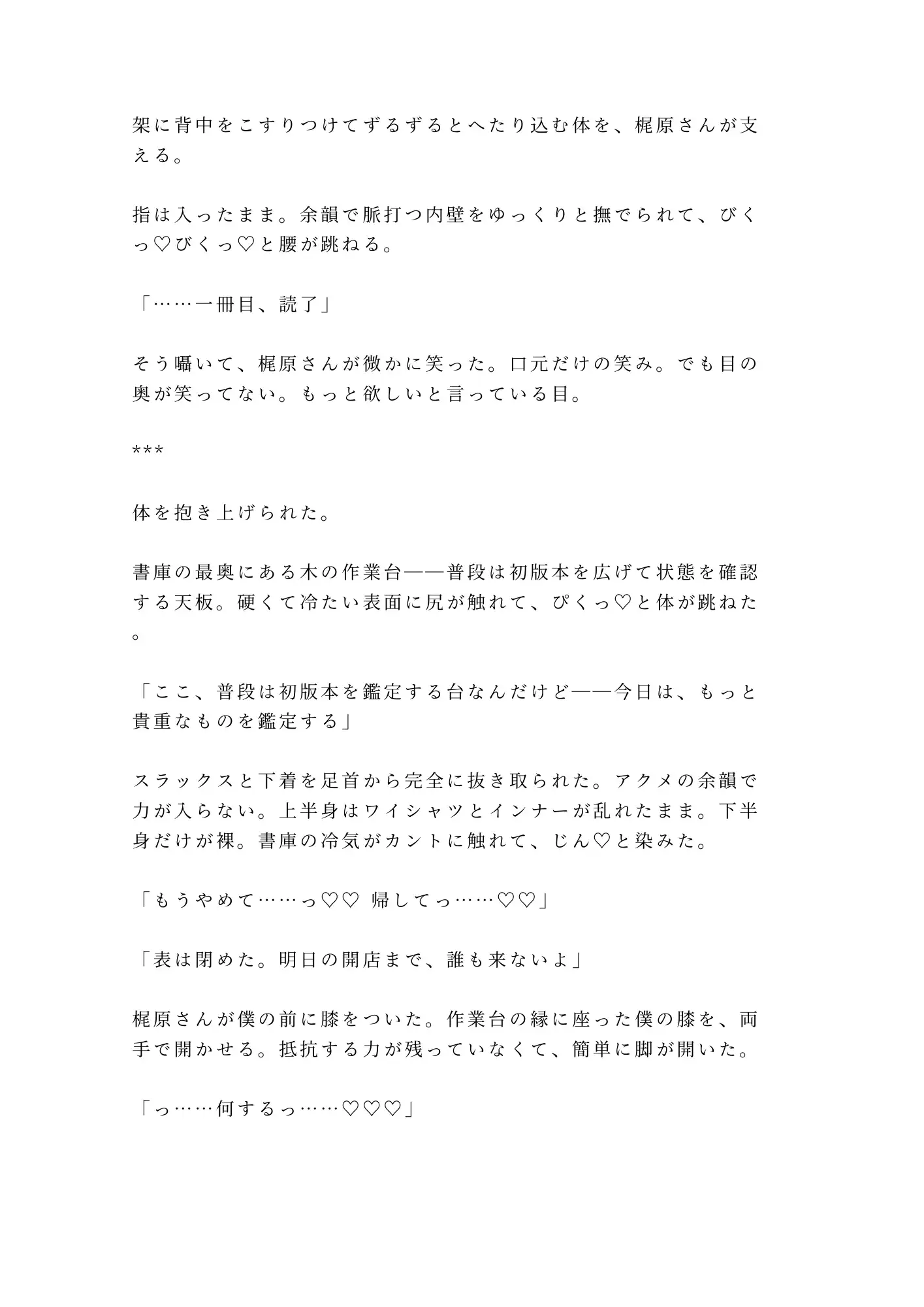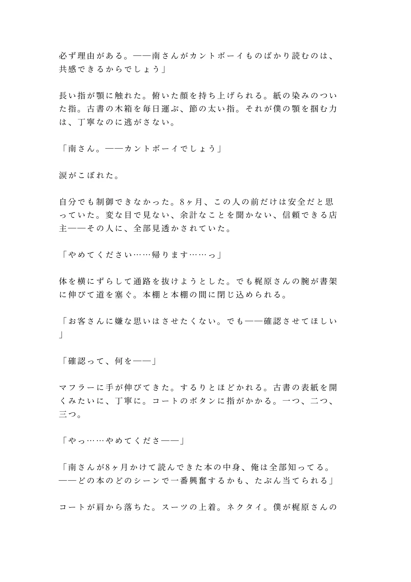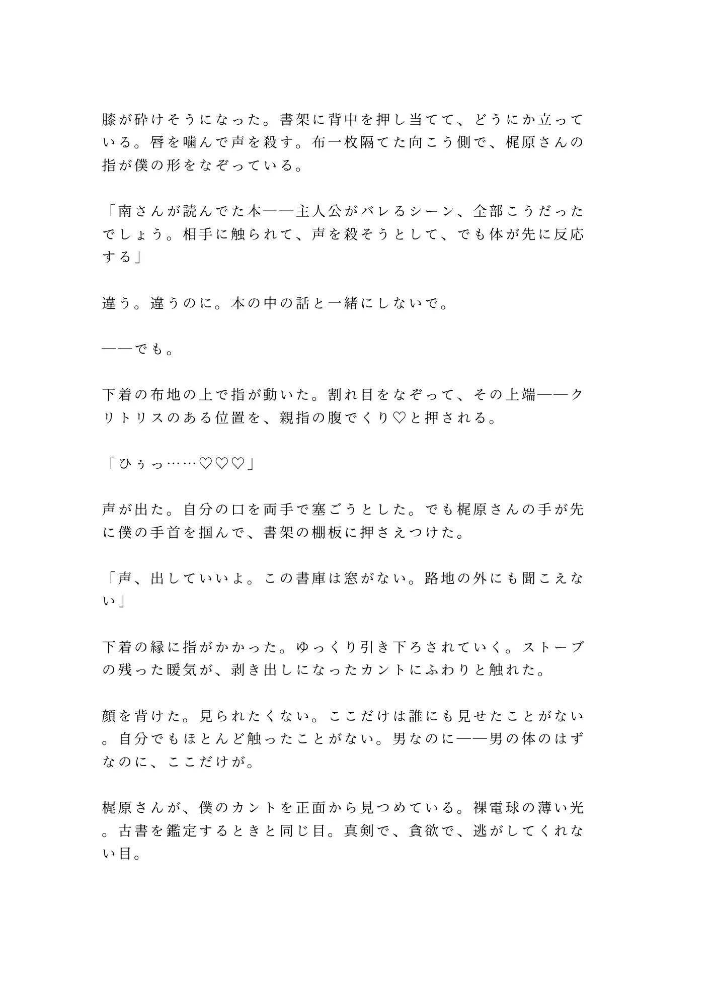 閉店後の書庫。窓のない密室。天井まで伸びる書架に囲まれた薄暗い空間で、梶原は南の体を初版本より丁寧に鑑定していく。古書を扱う長い指で、紙の手触りを確かめるように。匂いで真贋を見極めるように。一頁ずつ読み進めるように、焦らし、暴き、貪る。