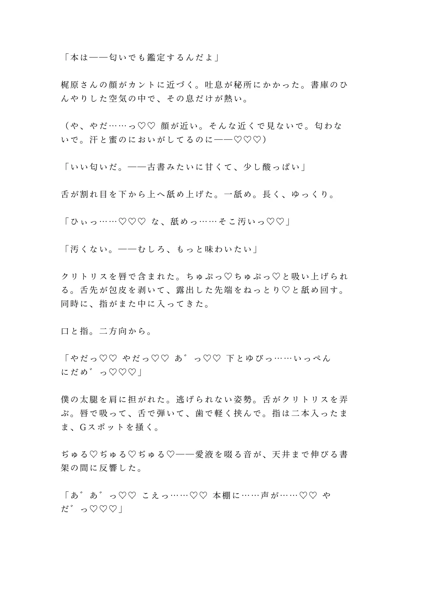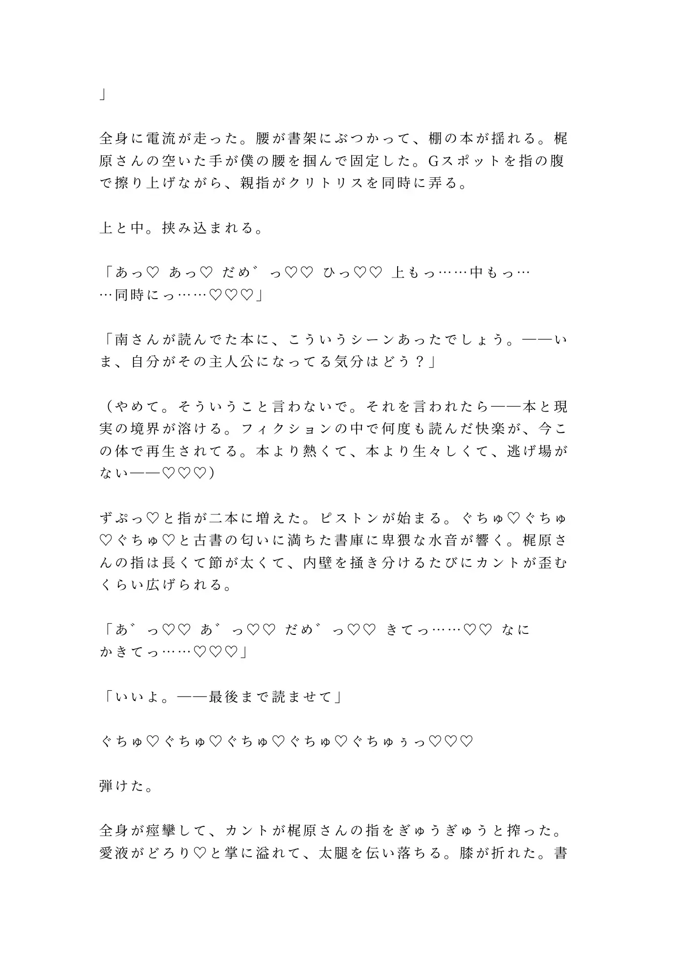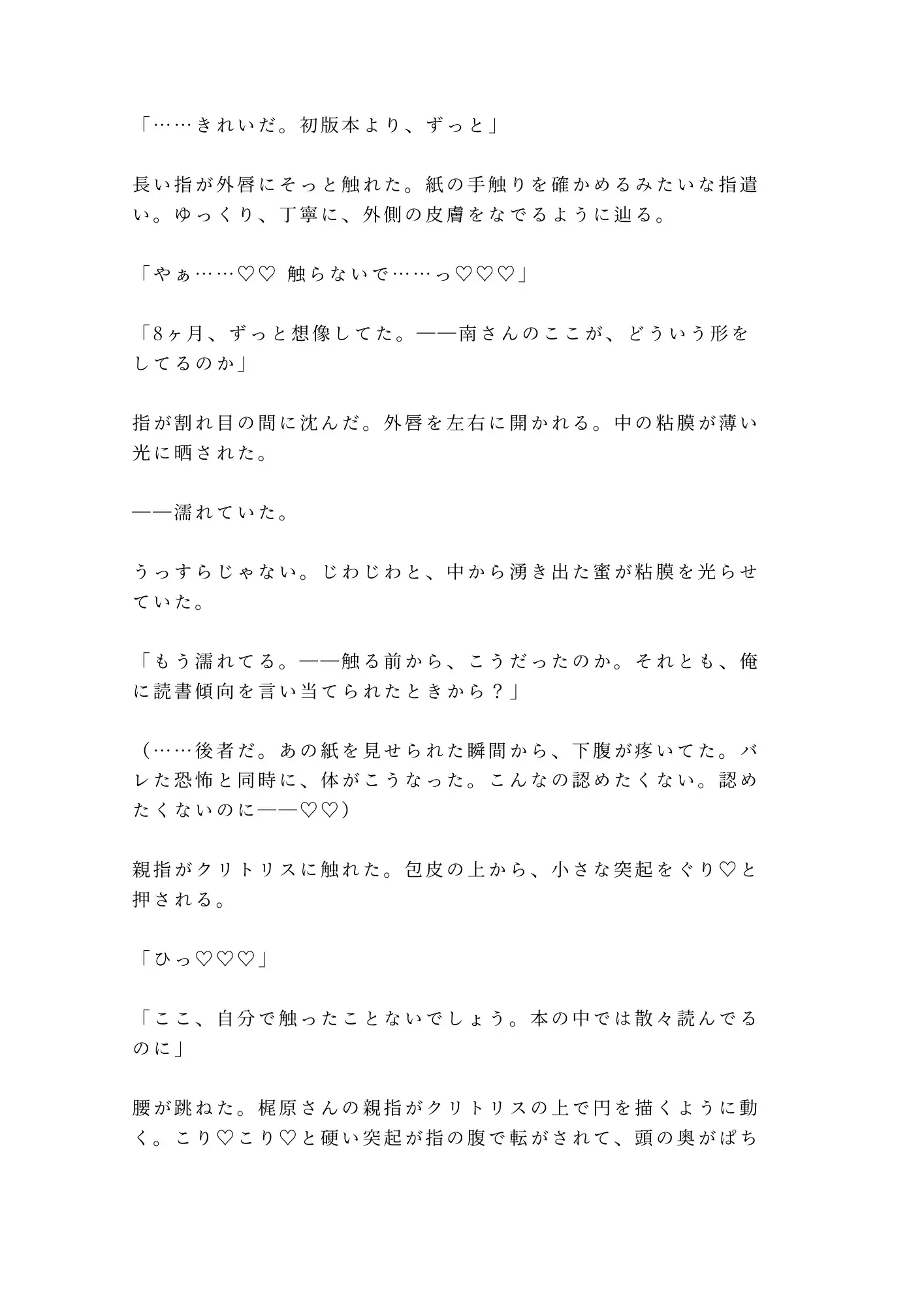 閉店後の書庫。窓のない密室。天井まで伸びる書架に囲まれた薄暗い空間で、梶原は南の体を初版本より丁寧に鑑定していく。古書を扱う長い指で、紙の手触りを確かめるように。匂いで真贋を見極めるように。一頁ずつ読み進めるように、焦らし、暴き、貪る。