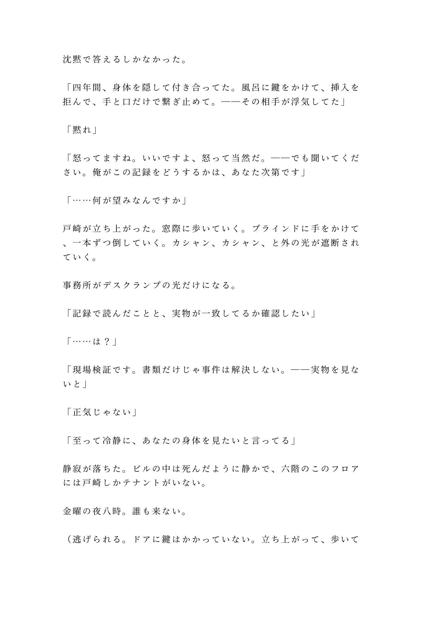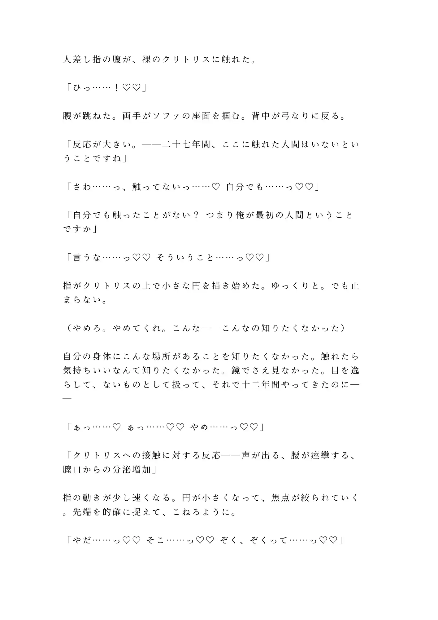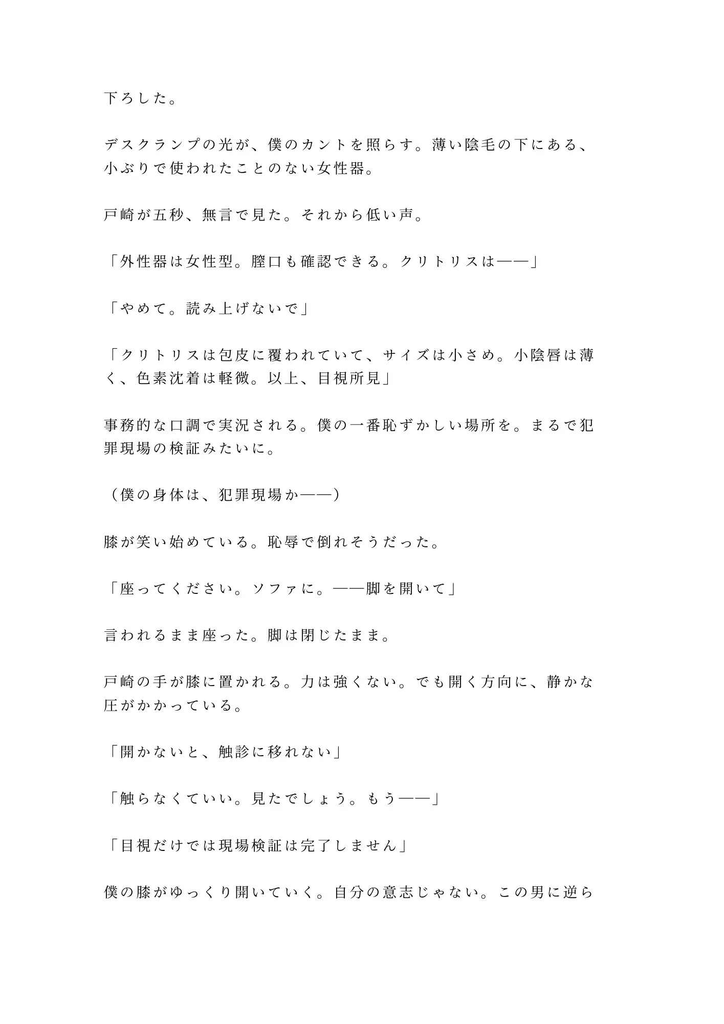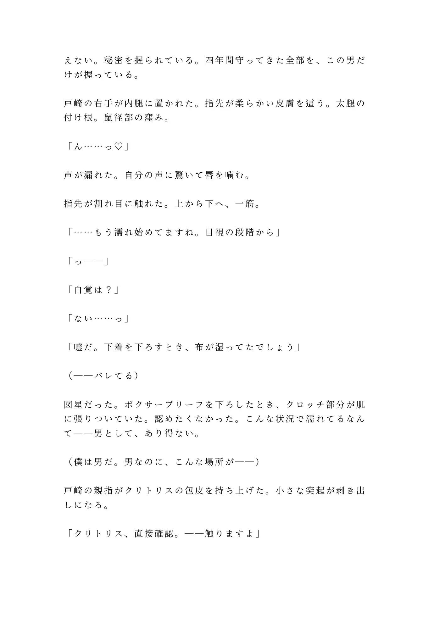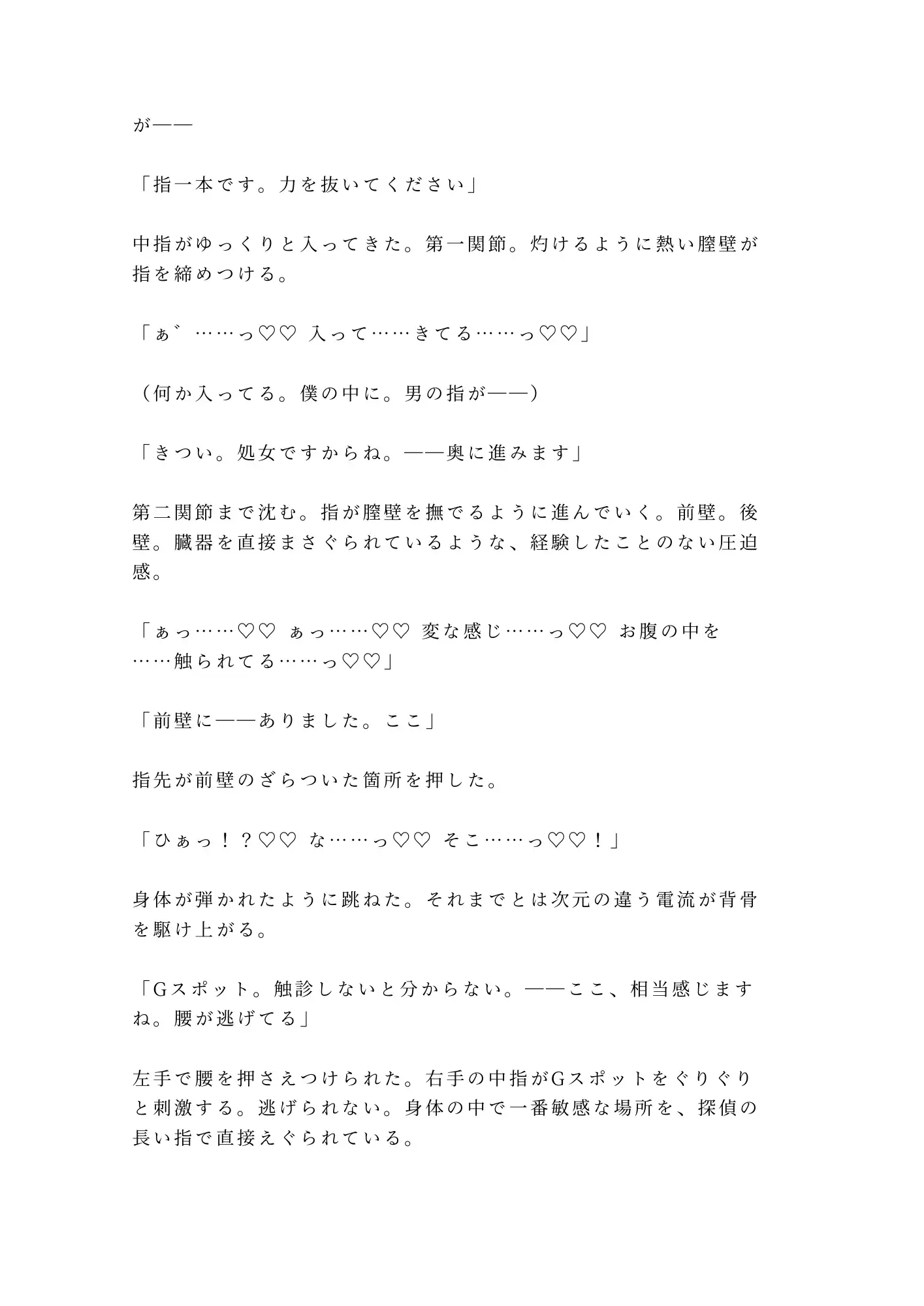 恋人の浮気調査を依頼した探偵事務所。金曜の夜、探偵・戸崎が差し出した茶封筒の中身は浮気の証拠写真。そしてもう一件――大学病院の診断記録。「性分化疾患(カントボーイ)と診断」。四年間恋人にすら見せなかった秘密を、調査の過程で暴かれていた。ブラインドを閉めた六階の事務所で、「実物を見ないと」と立たされ、自分でズボンを下ろす屈辱。目視から触診へ、クリトリスへの接触、初めての指挿入、Gスポットと子宮口の発見。二十七年間封印してきたカントが、探偵の長い指で覚醒させられていく。