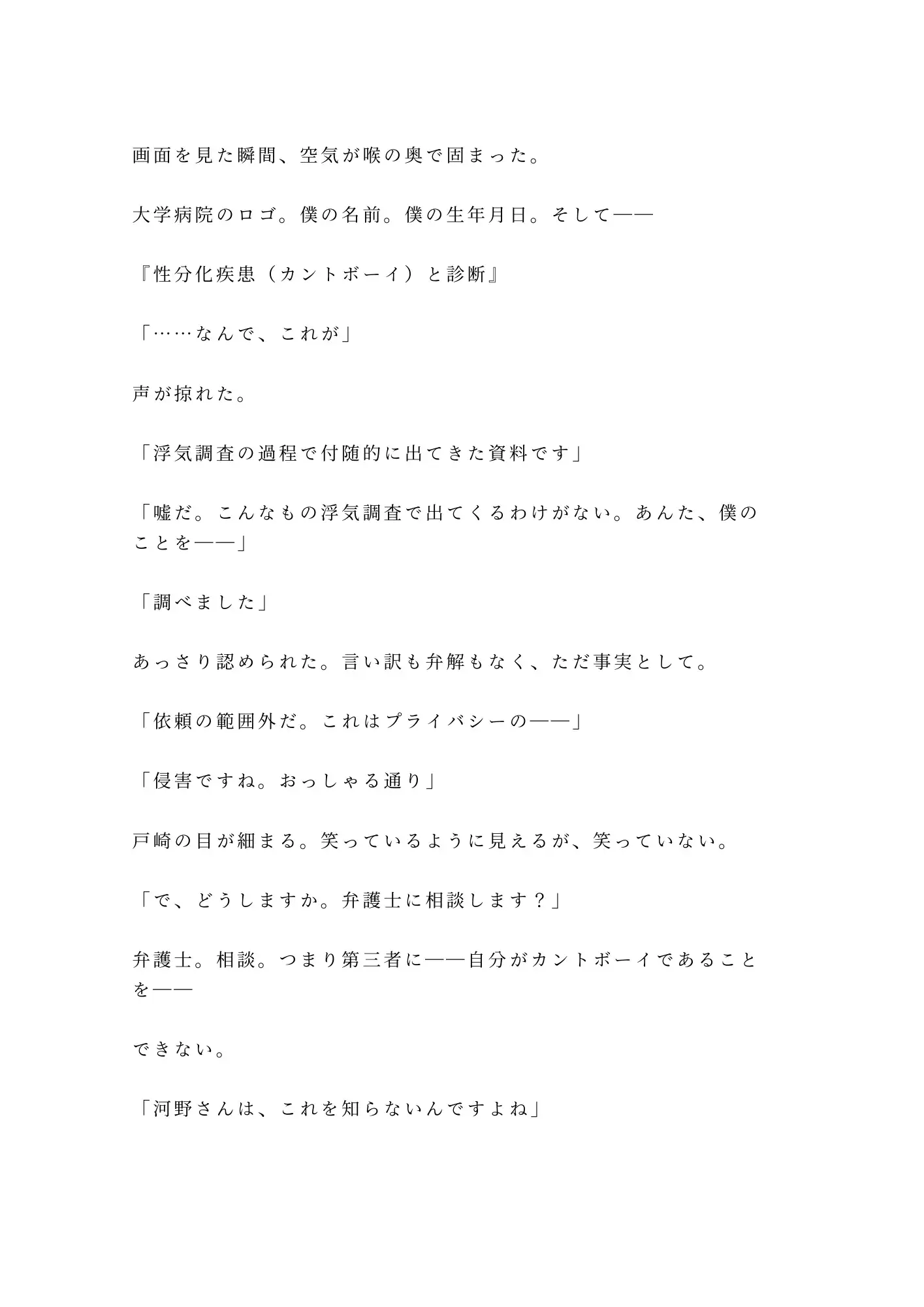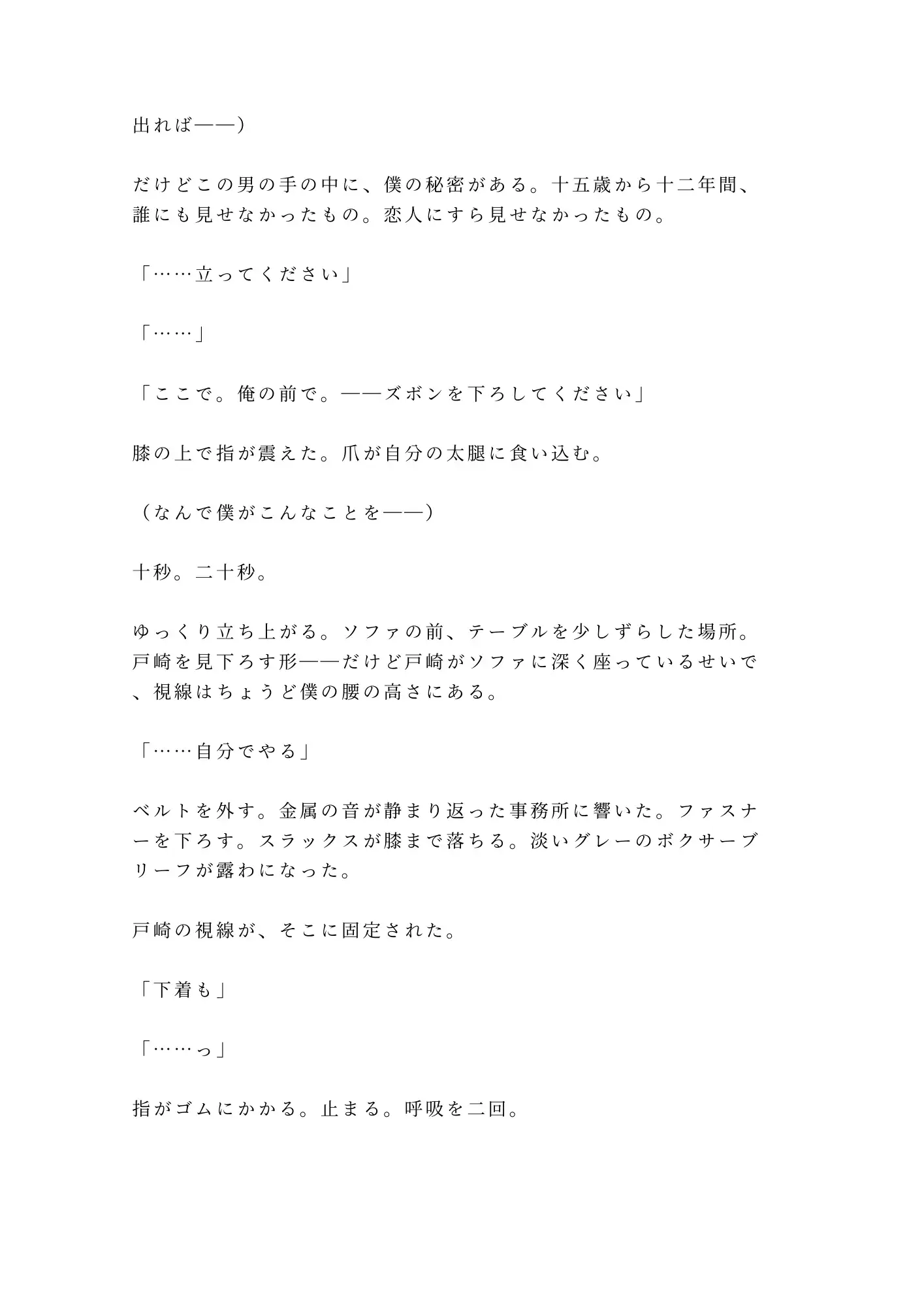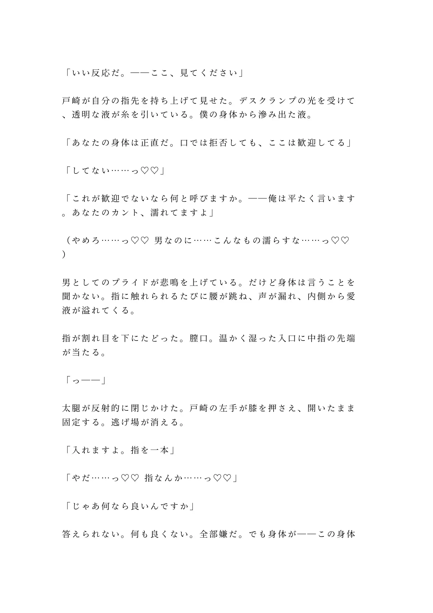 デスクの上で自分のカルテを横目にペニスで貫かれ、浮気写真の上に愛液が滴る。正常位でイかされた直後、仮眠室で後背位。精液まみれのカントを突かれながら、二度の中出し。「あなたの身体を開けた人間には、経過を見る義務がある」。事務所の合鍵と、毎週金曜夜八時の「定期検診」を押しつけられる。BLカントボーイ官能小説。