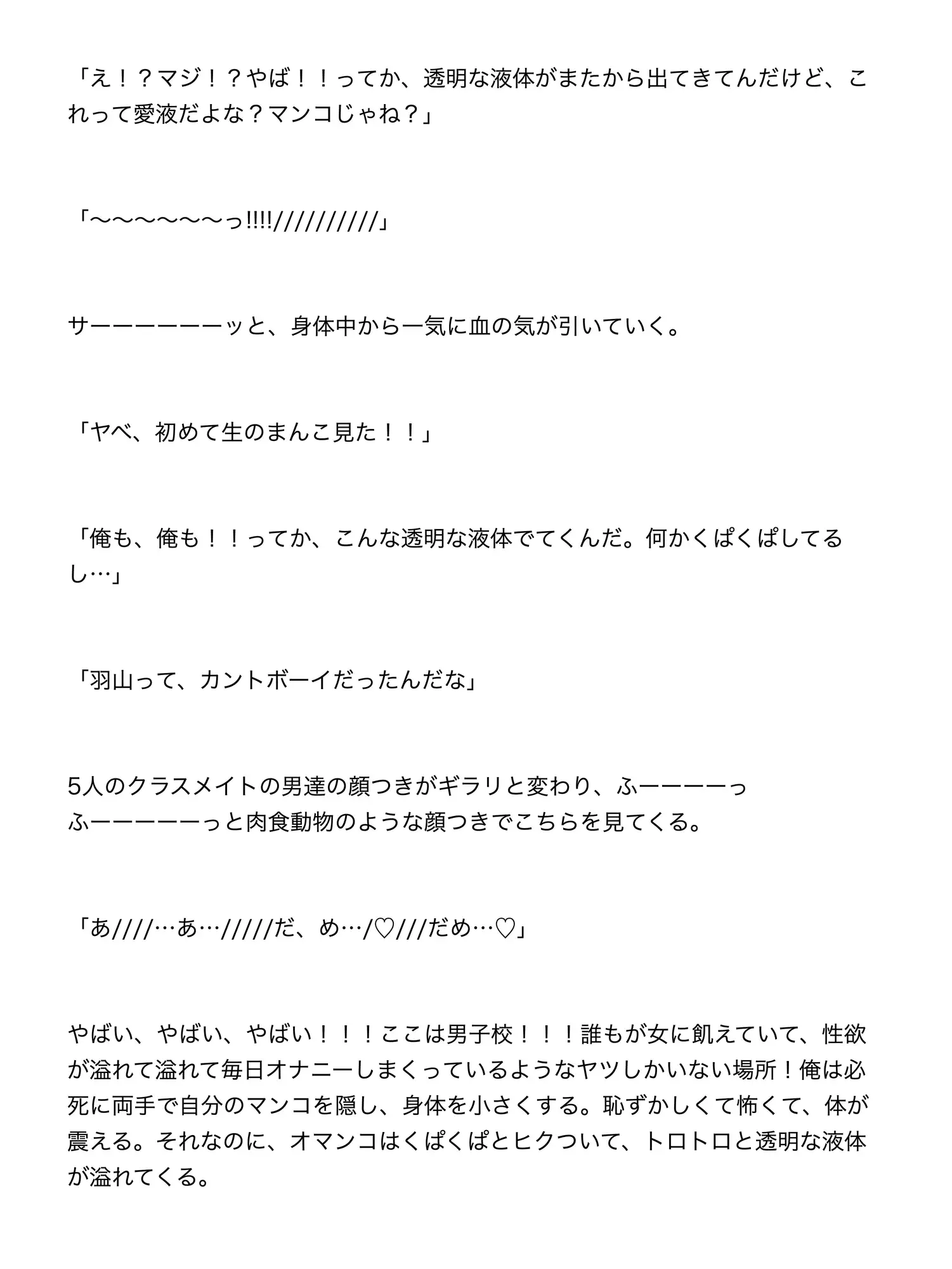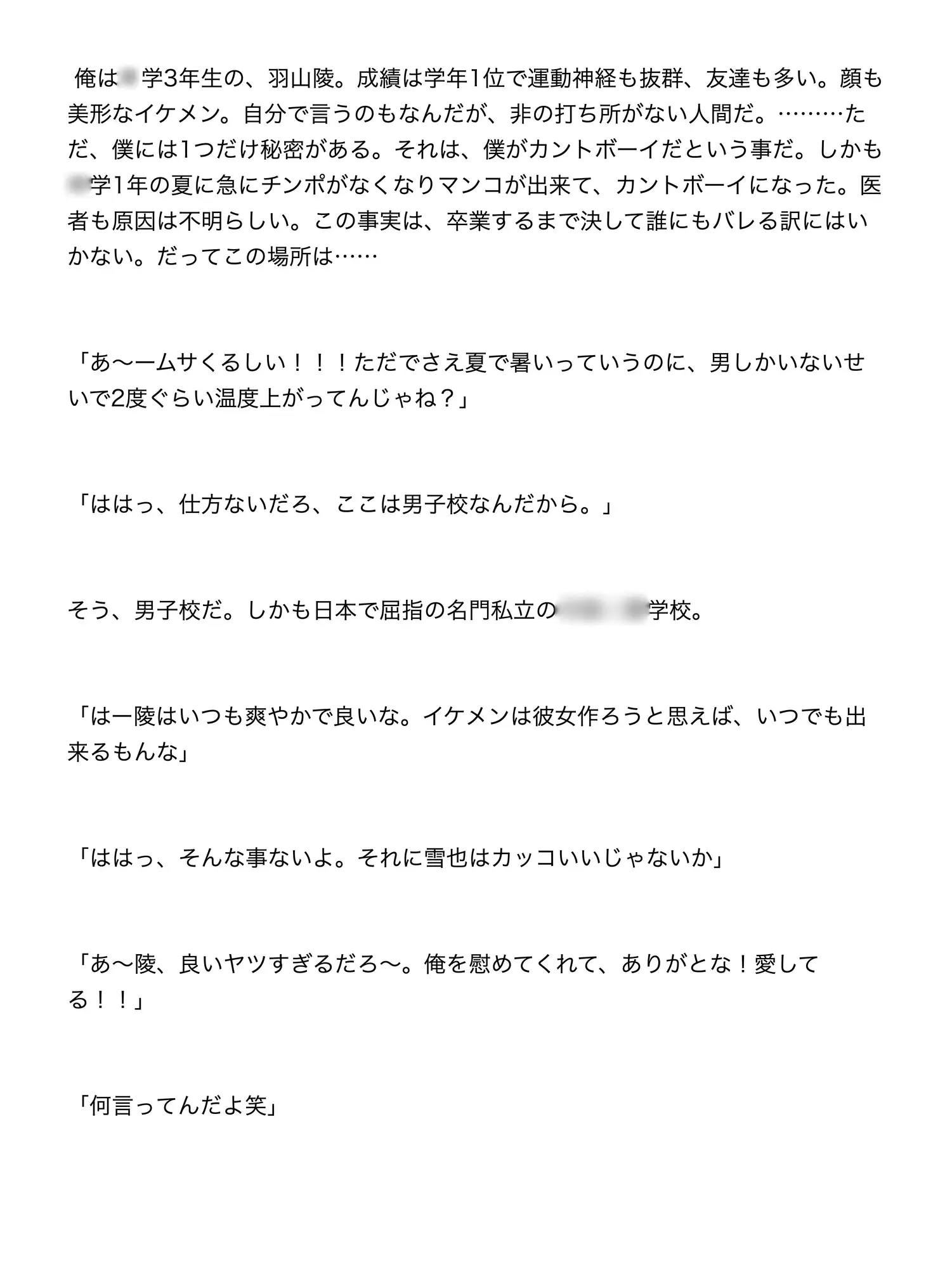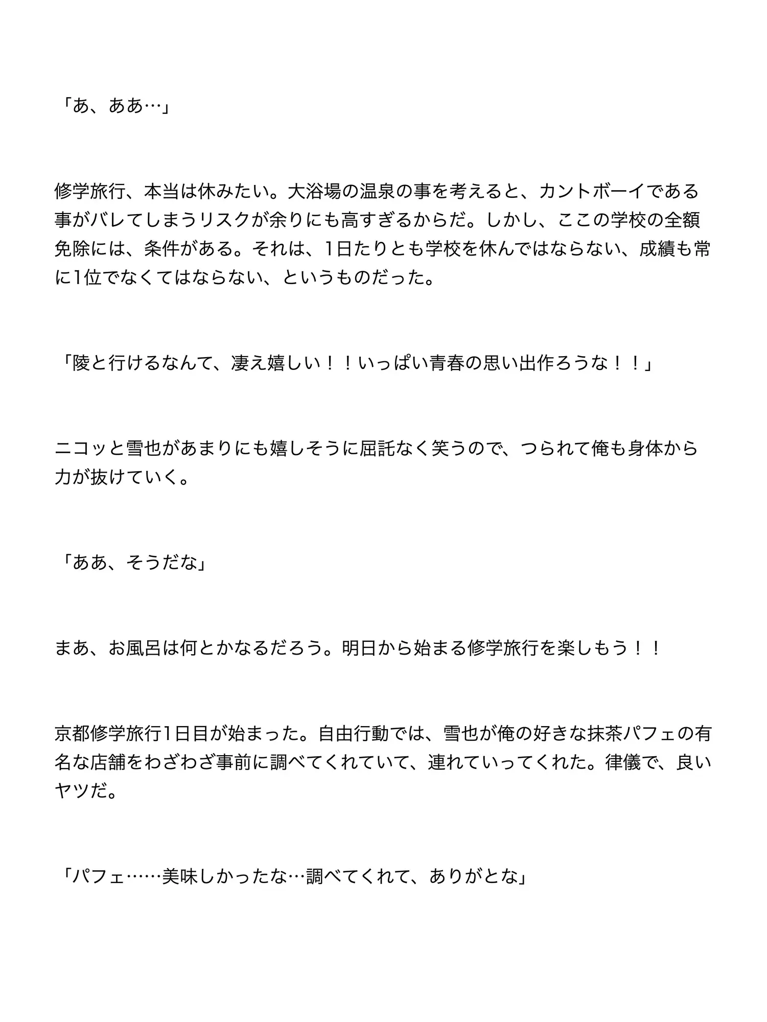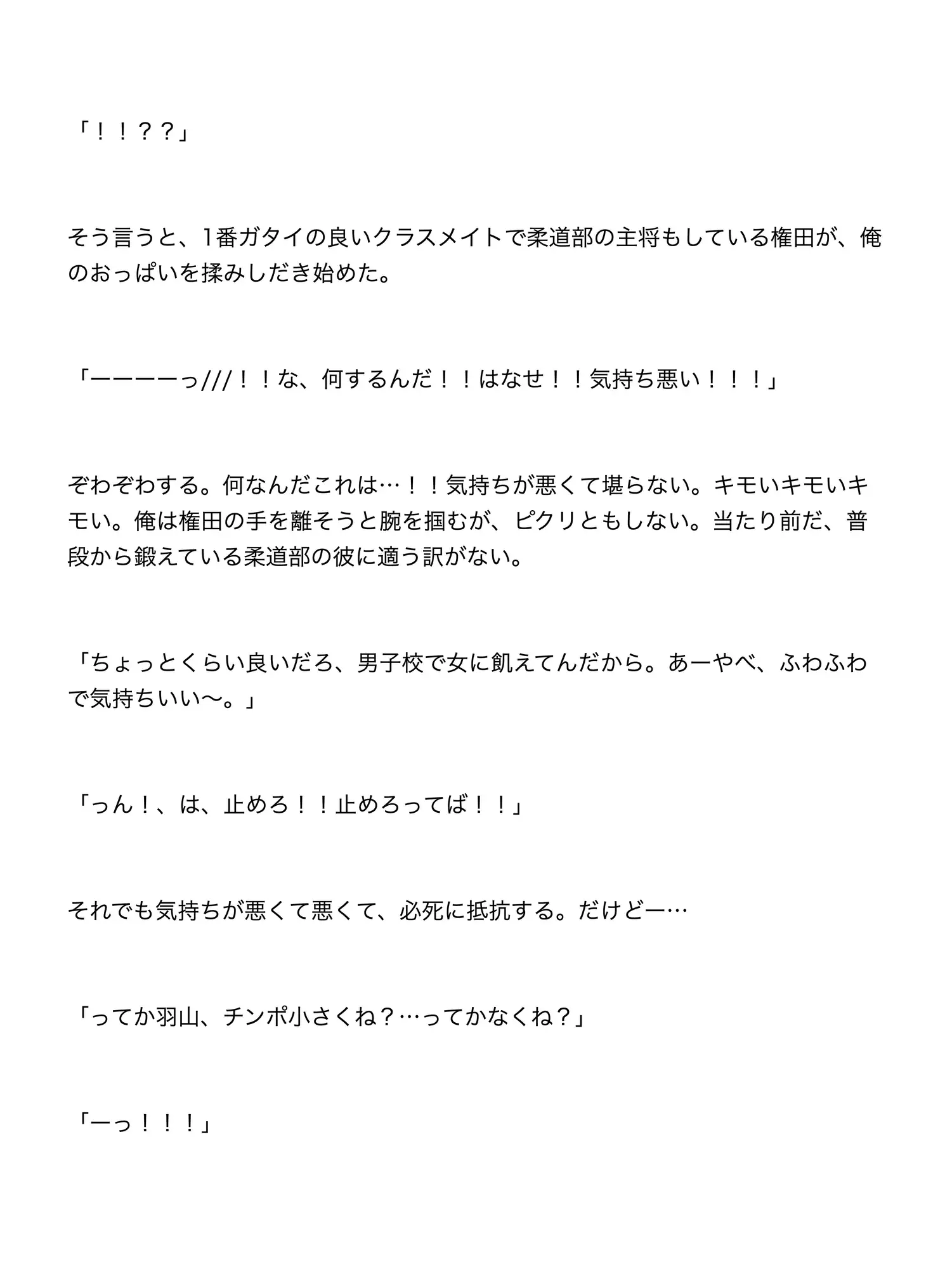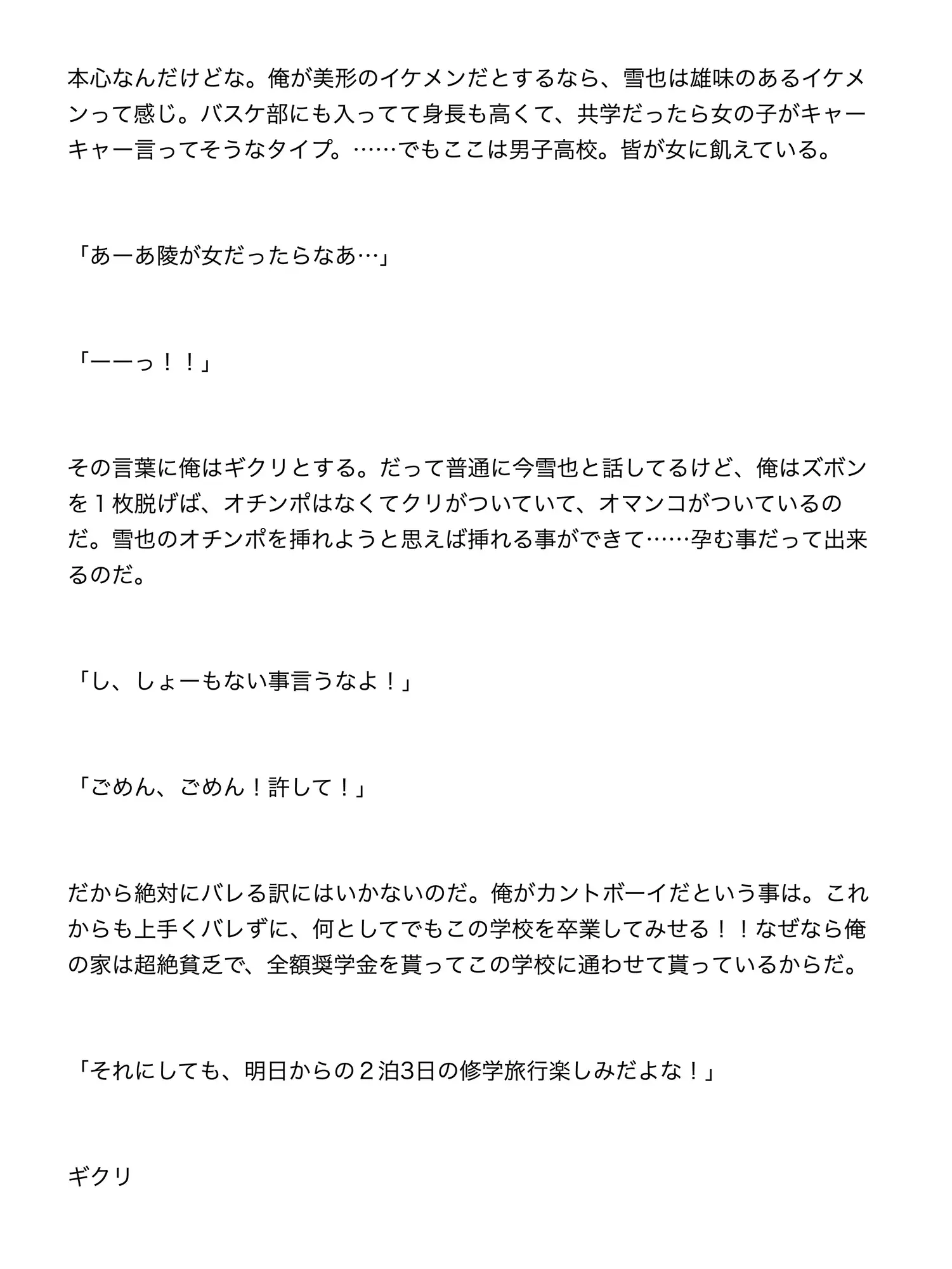 優等生の主人公が男子校の修学旅行でカントボーイだとバレて、クラスメイトの男達に輪○されて孕まされる話です。