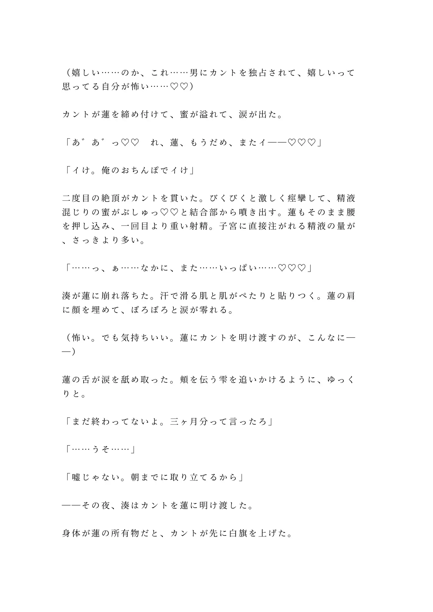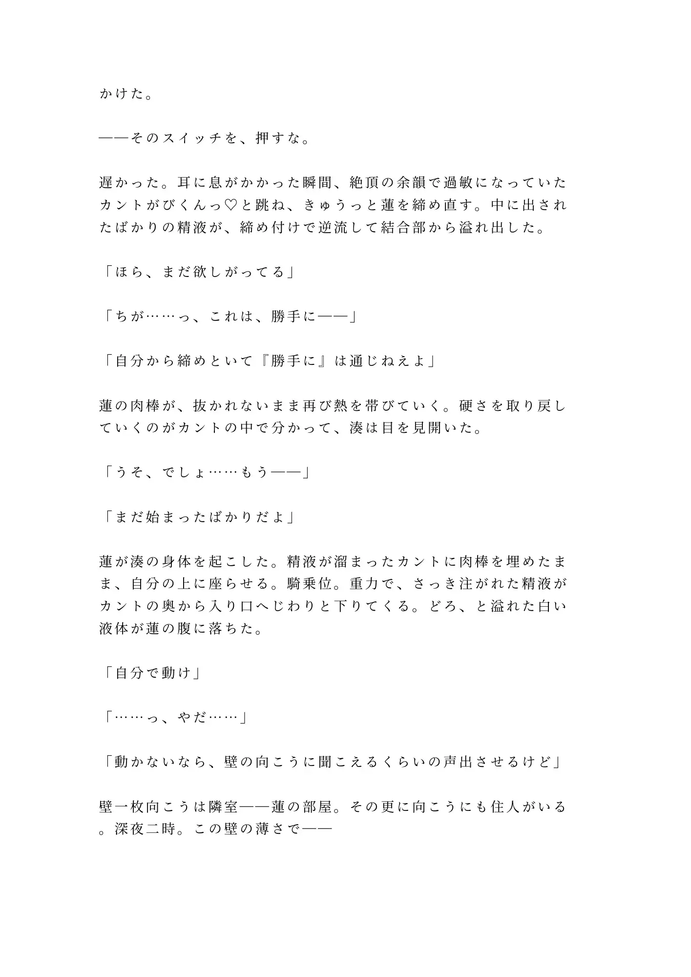 身体を知り尽くした執着攻め×カント持ちの抵抗できない受け。声だけで濡れる身体、壁越しの支配、逃げ場のない隣室という檻。「もう戻れない」と分かっていながら、自分から腰を振ってしまうまでの転落を、圧倒的な熱量と密度で描き切った一作。読み終わる頃には、あなたも湊と一緒に堕ちている。