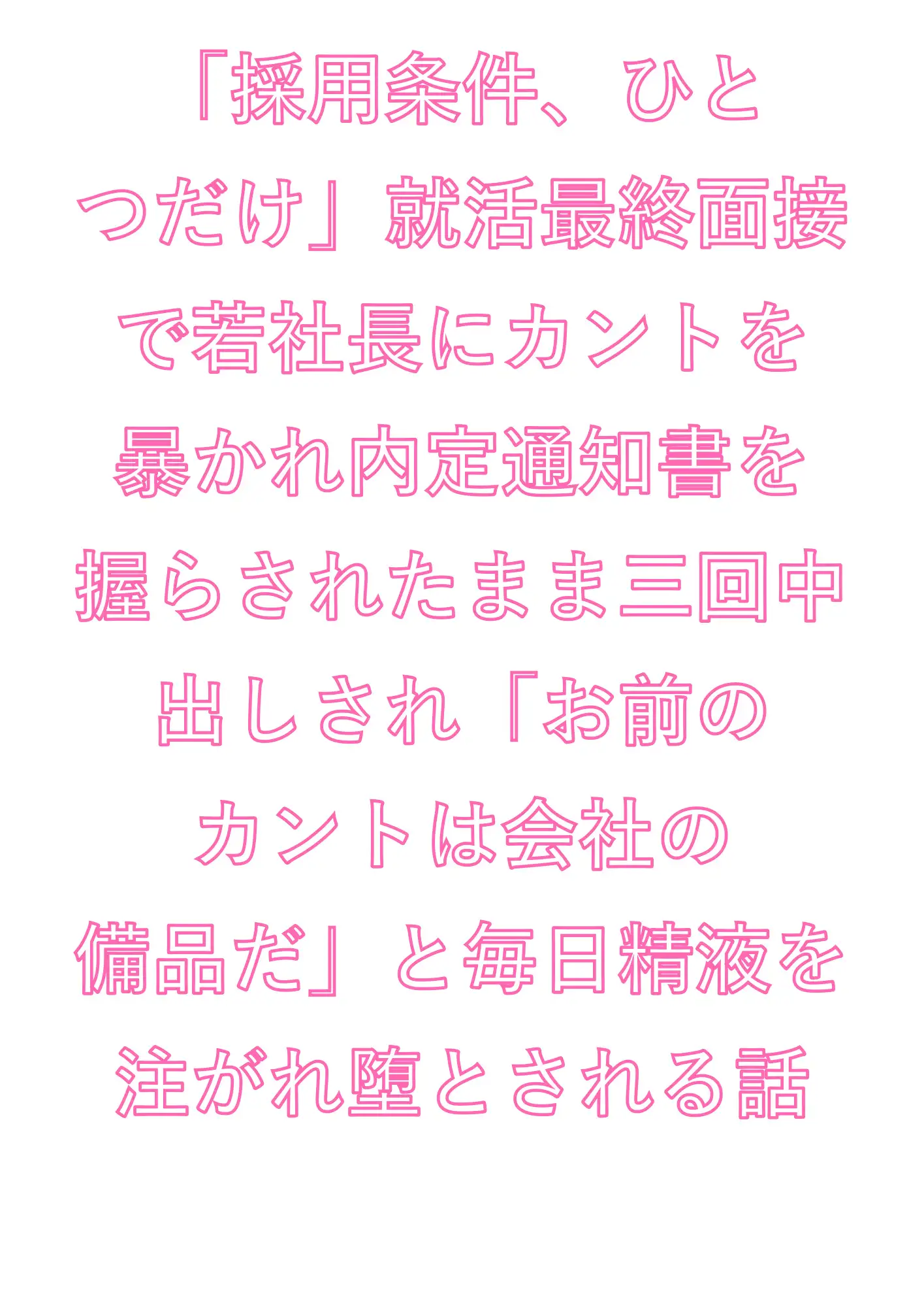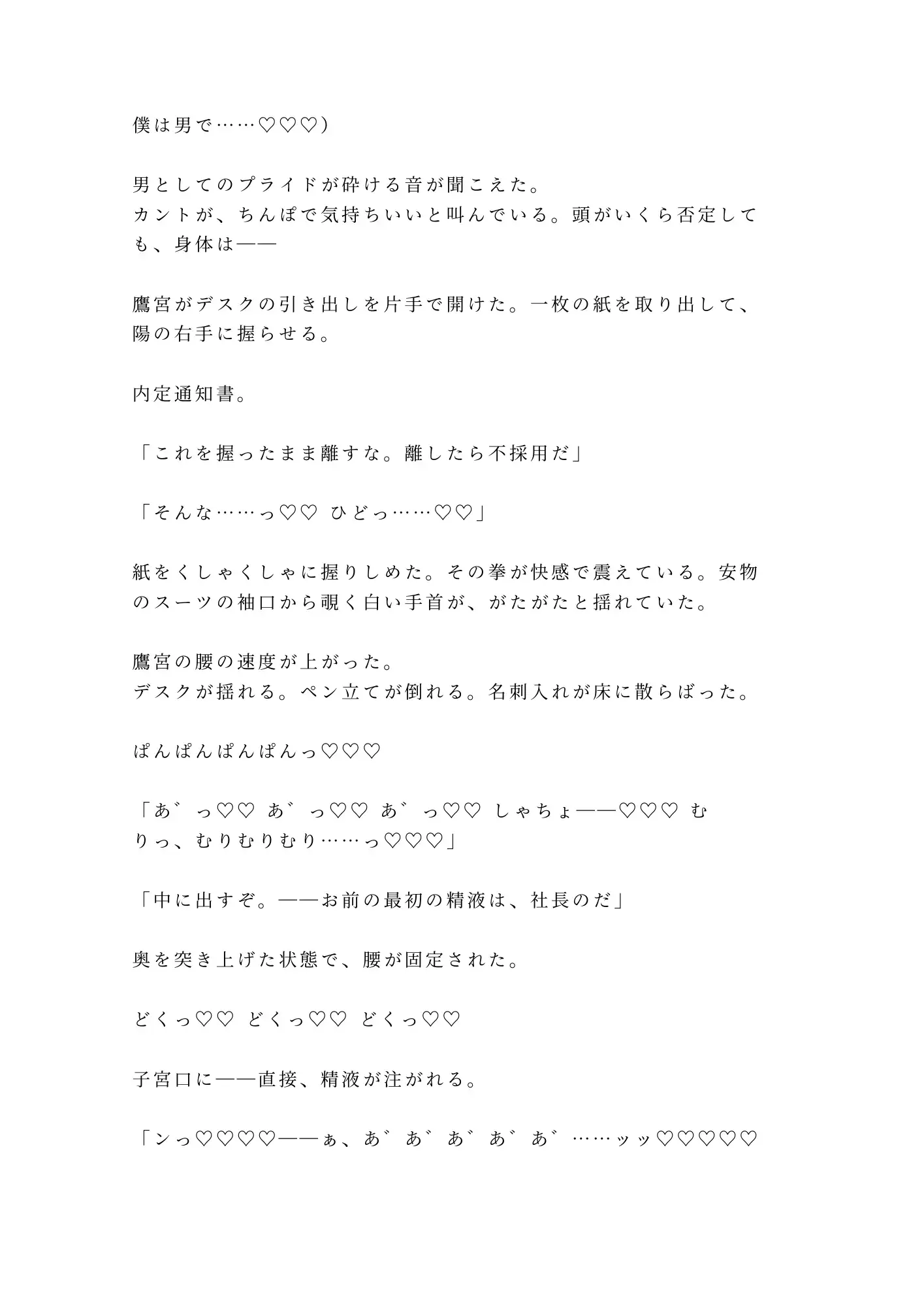 三回の中出しで完全に身体を開発された陽を待っていたのは、入社後の「日常」だった。毎日の昼休み、社長室に呼び出され、「お前のカントは会社の備品だ」と囁かれながら精液を注がれる。抵抗は初日で消えた。やがて自分から社長室のドアをノックするようになった身体を、陽はもう止められない。